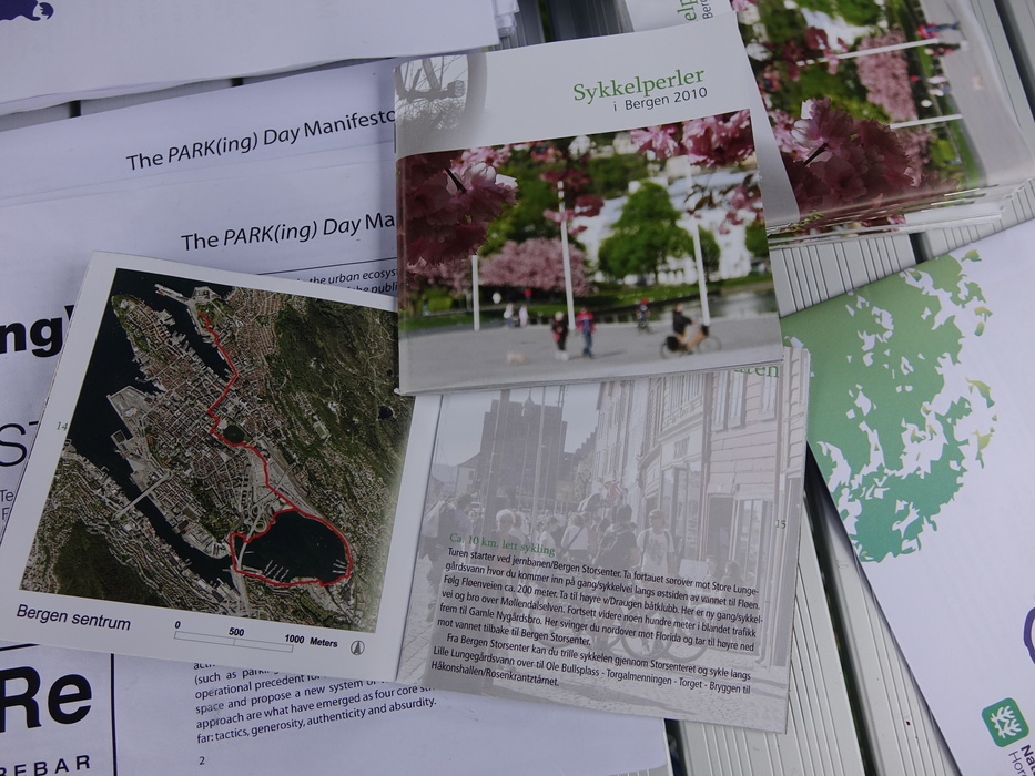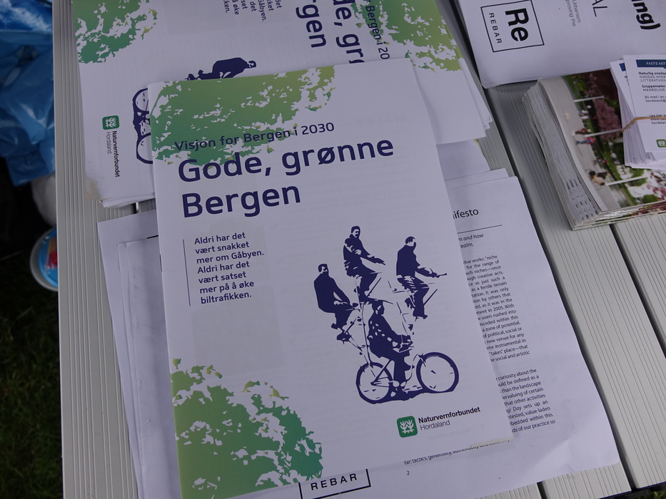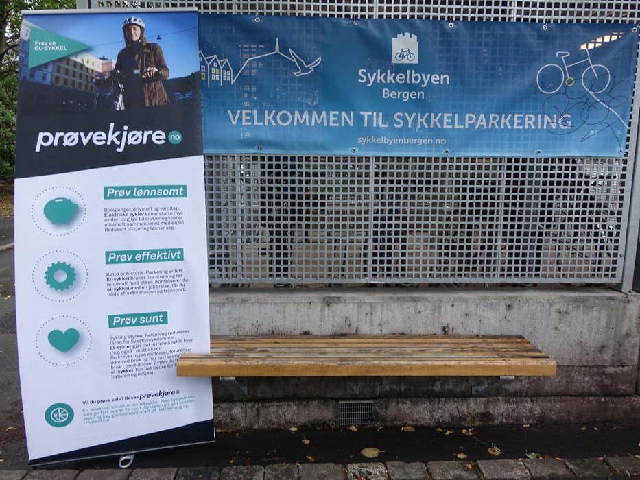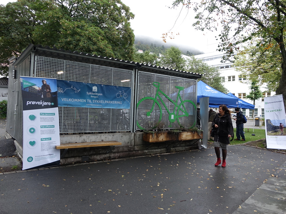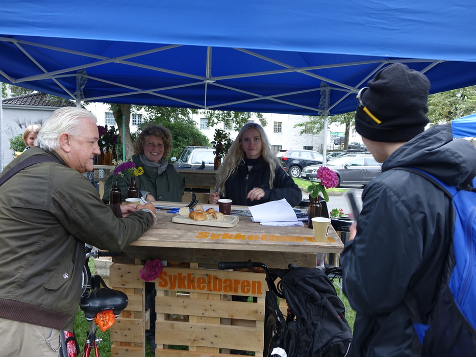 18-071Сегодня днем около велопарковки бергенского горсовета активисты из группы Велогород Берген Sykkelbyen Bergen угощали прохожих чаем и кофе, раздавали карты велодорожек, велошарфы и зонтики со светоотражателями, а также предоставляли возможность прокатиться на электрическом велосипеде.