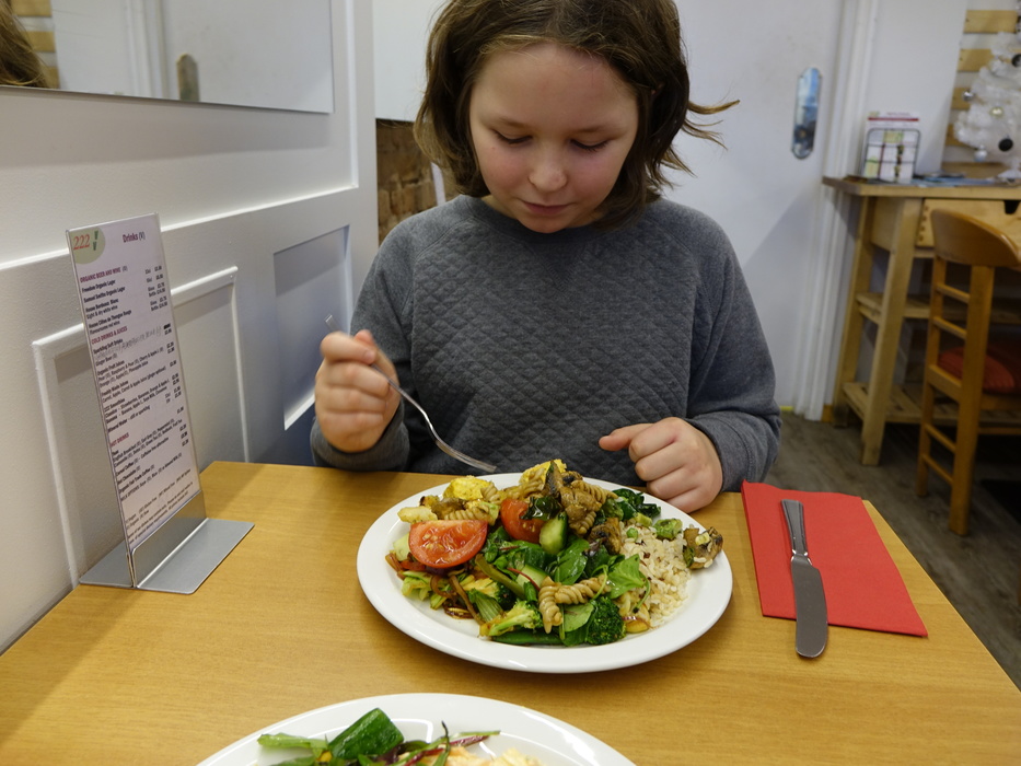 Кафе маленькое и тесно. Мы пришли в обеденное время, когда все заказывали шведский стол, бесконечное число подходов. О еде в «222» ничего особенного сказать не могу, Терентию понравились тарты из тофу и моркови.