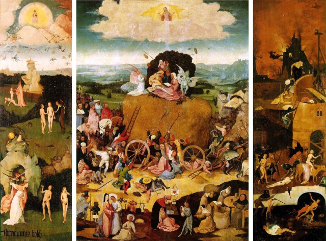 Большую часть выставочных объектов составляли работы последователей-подражателей Босха. Что уж говорить о умножении идей мастера в работах менее одаренных учеников, если прямо перед ковриком учителя расстелился Брейгель — до смешения работ, до путаницы с подписями. Следование за Босхом — это такое мощное, постоянно развивающееся культурное направление, что заимствование у Босха невозможно считать кражей, все знают, кому принадлежит вещь. Нет, это не кража, но вторая, третья производная, самоотверженная работа с душевным камнем. Чего, кстати, не получается в поэзии.