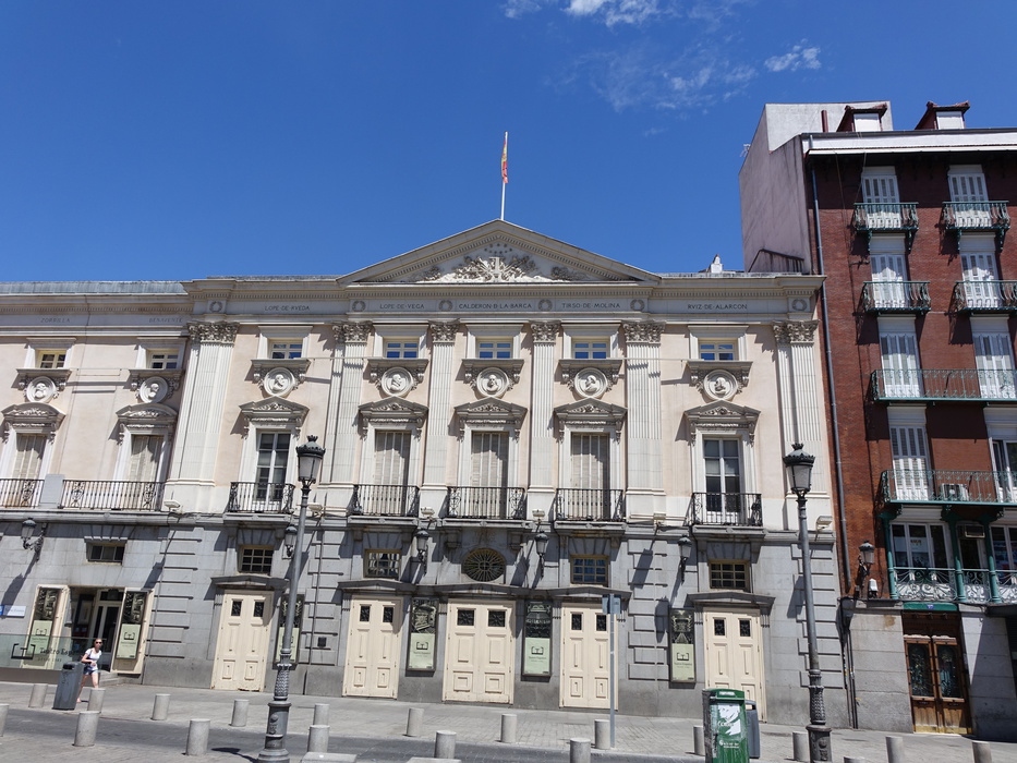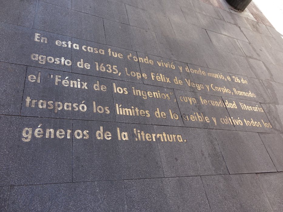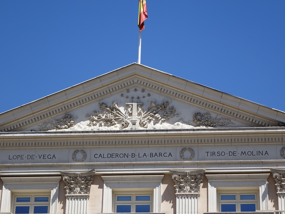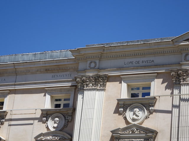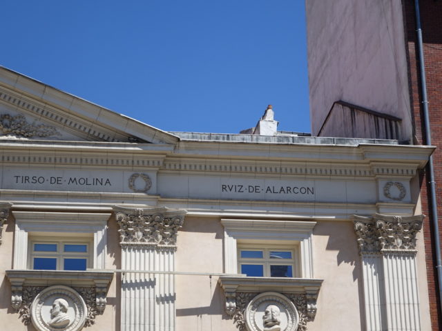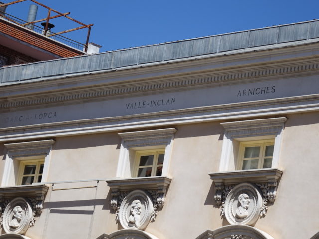 Имена драматургов на фронтоне театра Эспаньоль, который располагается напротив памятника Лорке:
