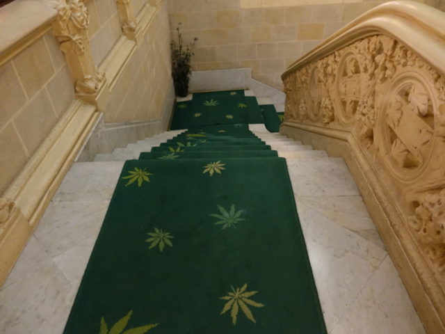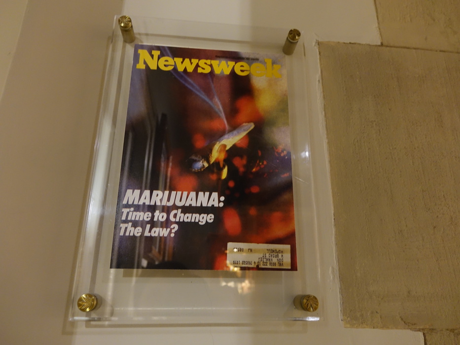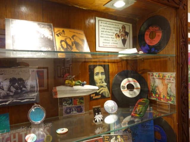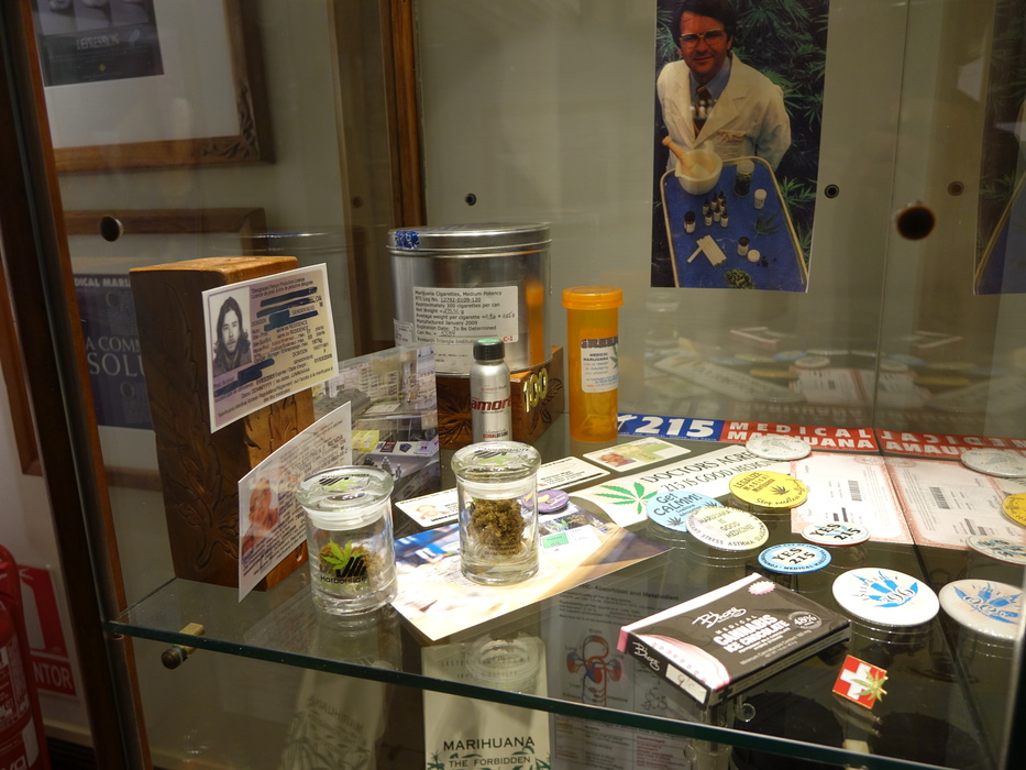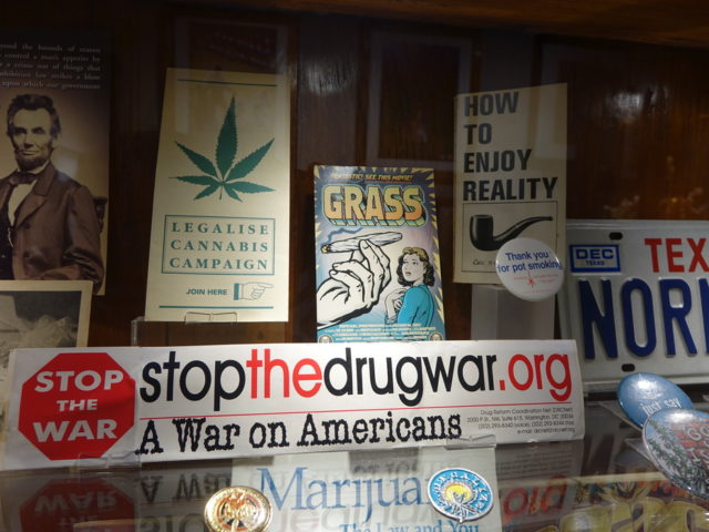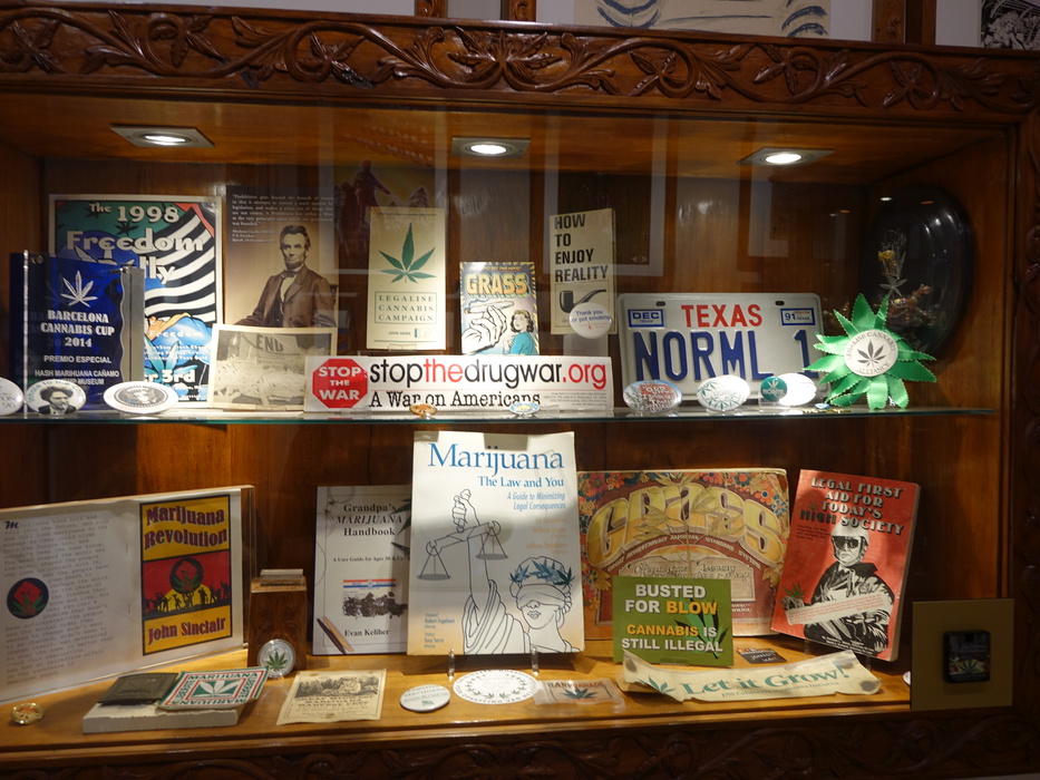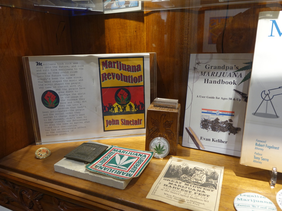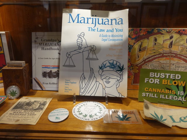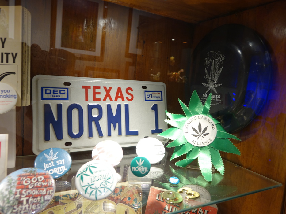 Номерной знак и значки Национальной организации за реформу законов о марихуане.