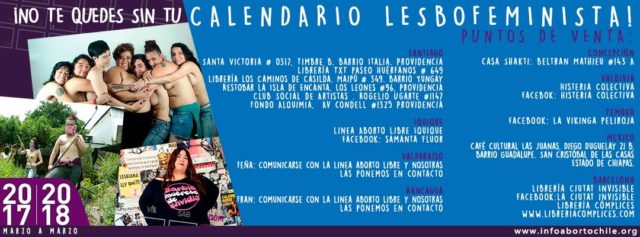 Календарь продаётся в испаноязычных странах. В Барселоне его можно купить в квир-книжном Complices на улице Сервантеса и в кооперативном анархо-книжном La Ciutat invisible района Санс. Маркирован как 100% лесбофеминистский проект. Последняя страница — реклама чилийской прямой телефонной линии lineaaborto.chile для помощи при медикаментозном аборте до 12 недель. Первый месяц года в этом календаре, разумеется, март, а перечисленные праздники и даты — феминистские. Огромное количество информации про феминисток Чили — в изображениях и текстах. Заканчивается всё анти-гетеро-патриархальным манифестом, призывами к сопротивлению и картинкой про способы предохранения при лесби-сексе от #tetastristes. Страшный сон гомофоба и непостижимая-недостижимая граница для парализованного российского активизма.
