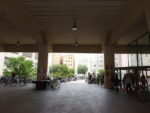 Было время сессии — наши знакомые прибежали на встречу с экзамена и потом отправились на лекцию. Студенты сидели повсюду. Из окна мы увидели огромный розовый треугольник на асфальте около корпуса — так студенты из SEPC (Sindicat d’Estudiants dels Països Catalans) отмечали день противостояния гомофобии, 17 мая.
