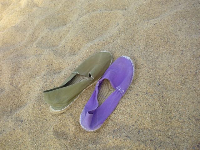 Мы провели какое-то время на пляже, выгуливая московские эспадрильи. Они были куплены в Барселоне сотни лет назад и теперь страдают от дефицита гражданского общества и витамина D. Одна, как видите, с горя позеленела, а вторая сохраняет свой первоначальный острополитический каталонский цвет.