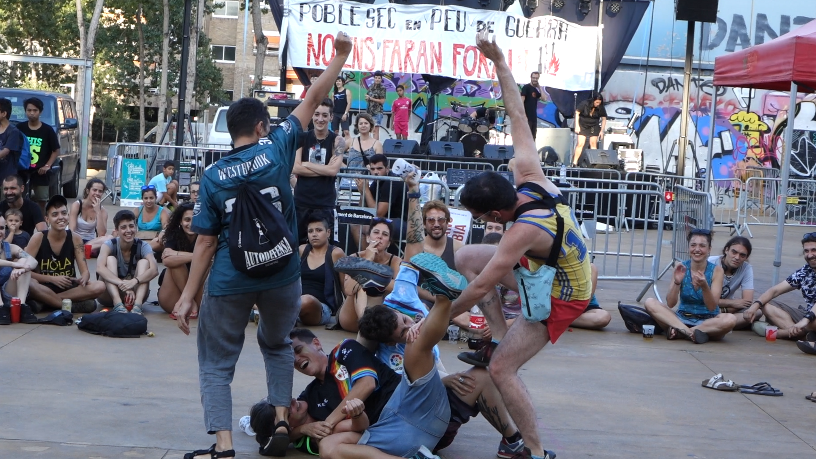 С одной стороны была установлена большая сцена и ряд палаток. Продавали пиво, самодельные футболки фестиваля района Побле Сек, а также собирали деньги для кампании в поддержку Лизы, которая 7 июня получила 7, 5 лет тюрьмы за ограбление PaxBank в Аахене в 2014 году.