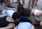 Во время подготовки были построены не самые удачные варианты фигур. Видно, что одна из участниц придумала передать свой костыль команде и таким образом принять участие во всеобщем веселье: