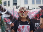 - Феминистски с трапспарантом «Животные не продукты, вещи, рабы. Уважай жизнь!»