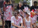 Группа из 20 человек надела маски, превратилась в «животных» и «палачей» и возглавила шествие. «Животные» были в белой разорванной и окровавленной одежде, со связанными руками, с цепями на ногах. «Палачи» в черной одежде и окровавленных фартуках держали над головами «животных» орудия убийства. Двое активистов группы несли транспарант «Мясо это убийство». Во время митингов эта группа застывала. В самом начале митинга — на площади Каталонии — организаторы включили запись криков животных на скотобойне.