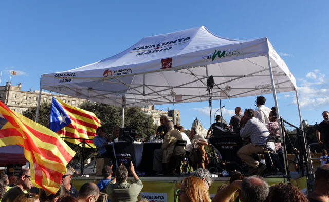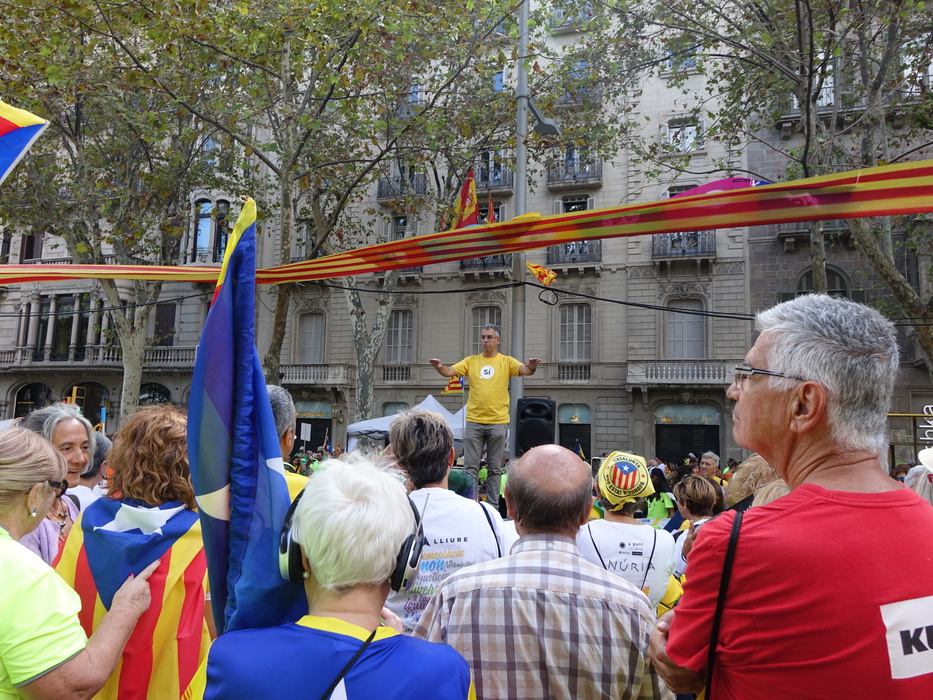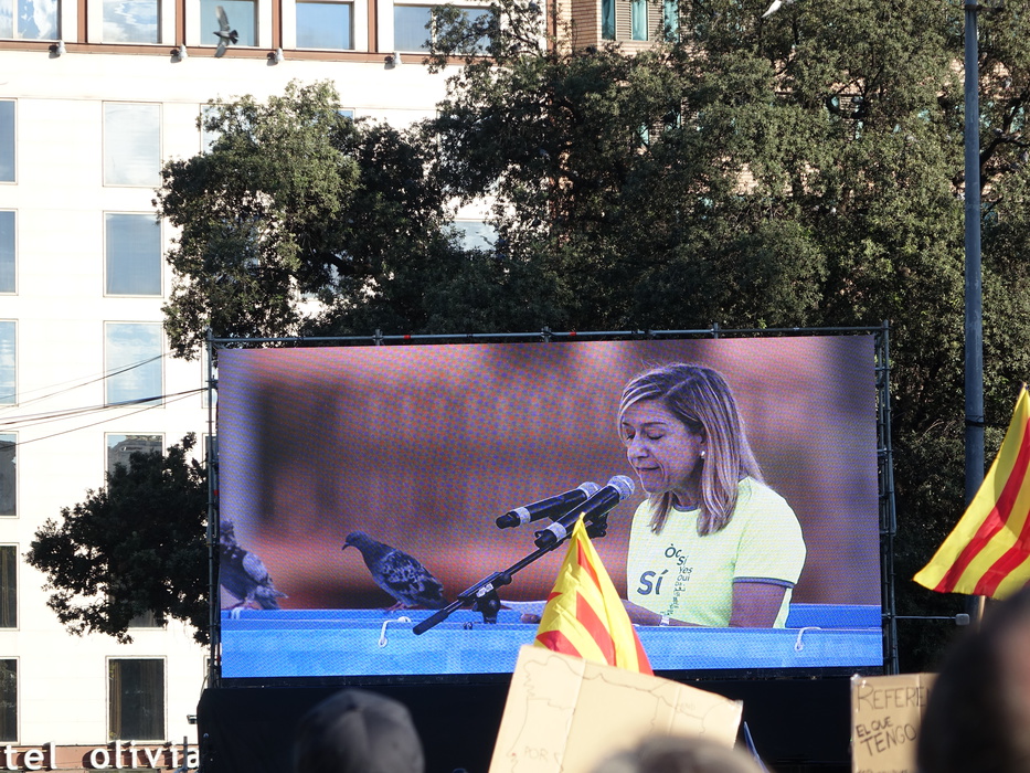 Когда акция «плюс» завершилась, а кастельеры начали расходиться, я пошла в сторону площади Каталонии. Там был расположен большой экран, на который транслировались видеозаписи духовных лидеров народа, а также речи выступающих. В 8.32 выступал Ахмед Галай, тунисский демократ, участник организации, входившей в Quartet de Diàleg Nacional de Tunísia, получившей Нобелевскую премию мира в 2015 году. Галай поддержал референдум и сказал, что народ имеет право проголосовать.