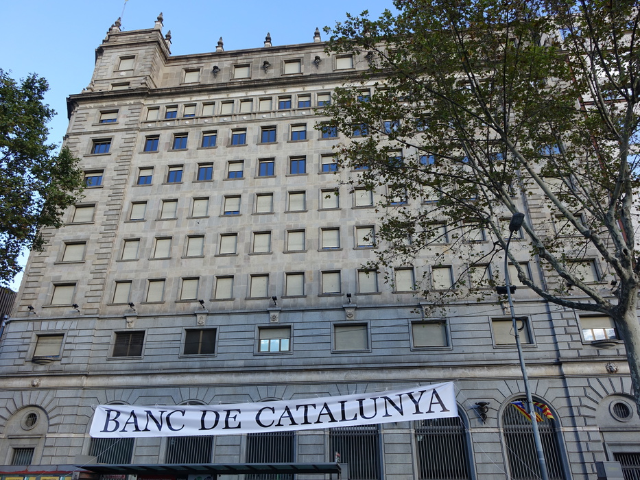 Только государственные учреждения сохранили испанские флаги. Около Банка Испаниии внизу повесили растяжку Банк Каталонии:
