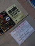 Рядом с баром лежали листовки о том, что делать в случае насилия «Ты не одна», а также банданы «Мы строим феминистское пространство», которые я видела во время фиолетового райота в самом начале фестиваля, 14 августа.