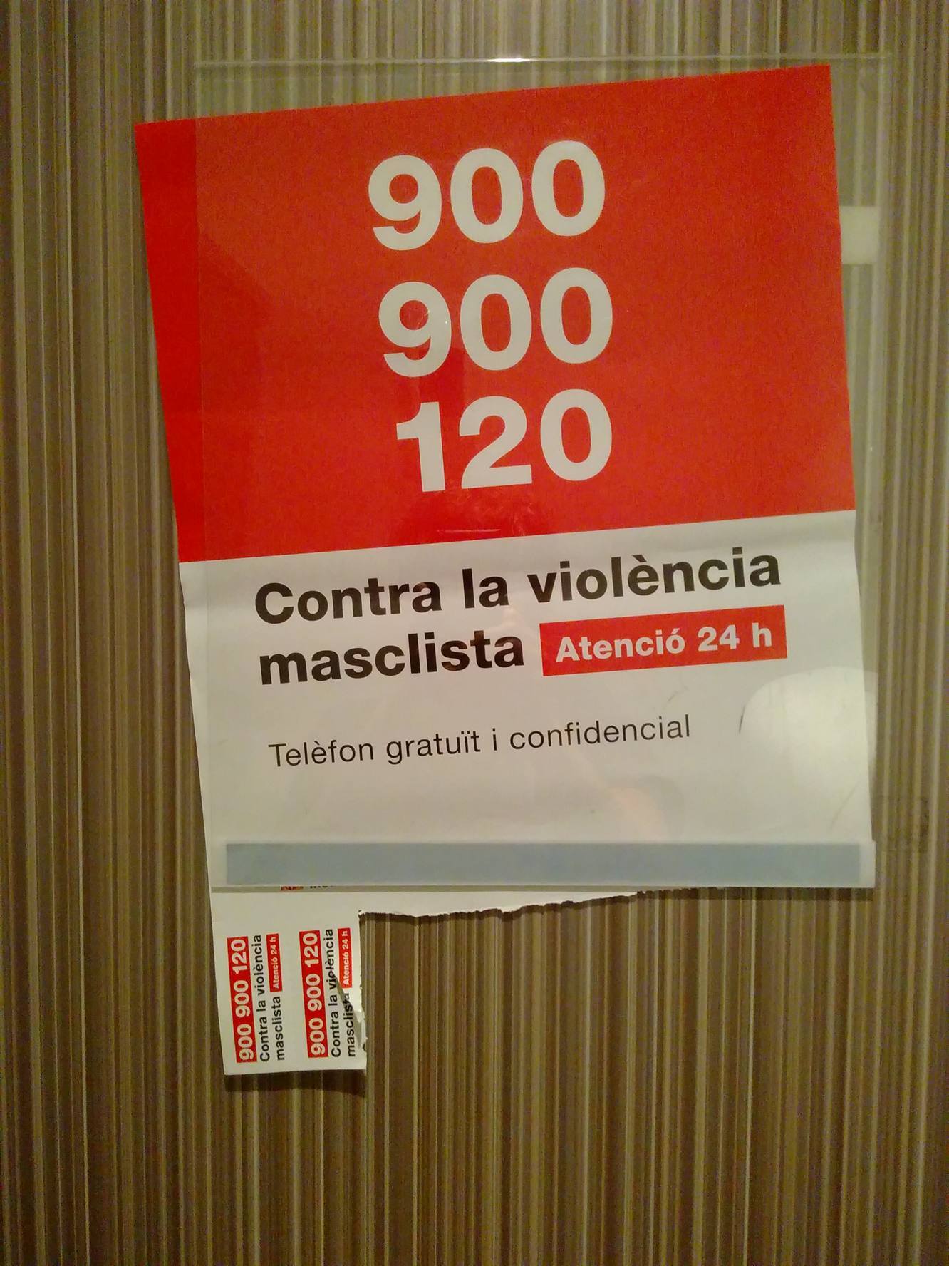 Это объявление из женского туалета в крупном универмаге Барселоны. Объявление размещено в единственном месте, где жертва абьюза совершенно точно окажется одна, вне контроля. Почти все номера телефонов оторваны.