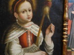 Для части выставки посвященной прядению и вышиванию, выбраны картины, на которых за душеспасительными занятиями изображена Дева Мария. Интересно, что в качестве экспоната выступает не титульный символ, а незначительный на первый взгляд предмет.
