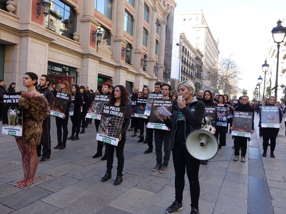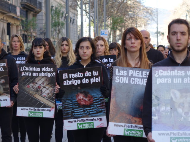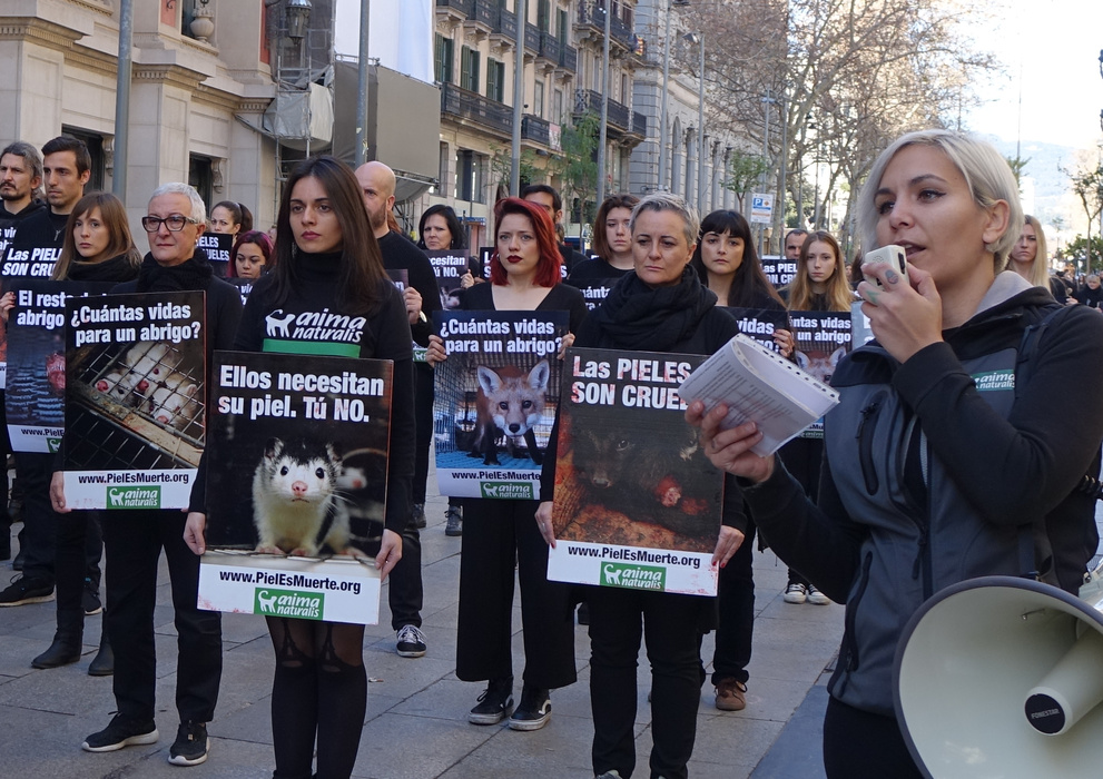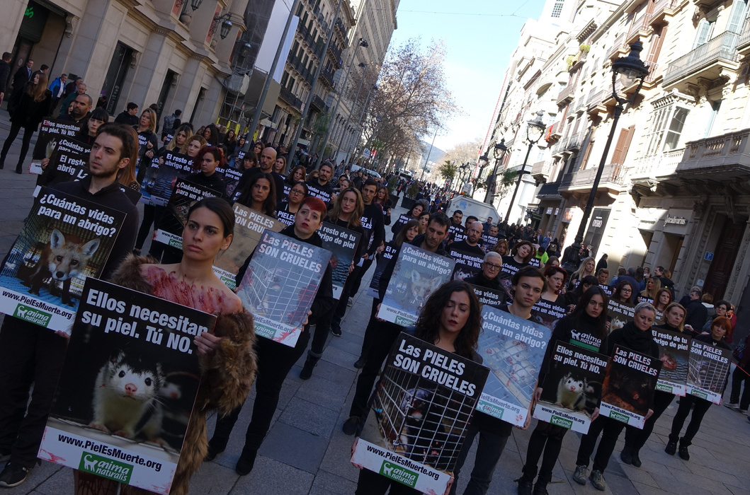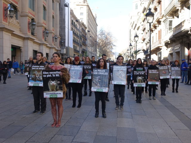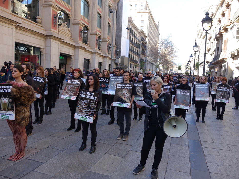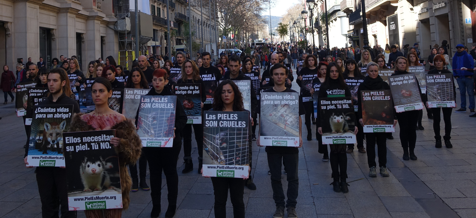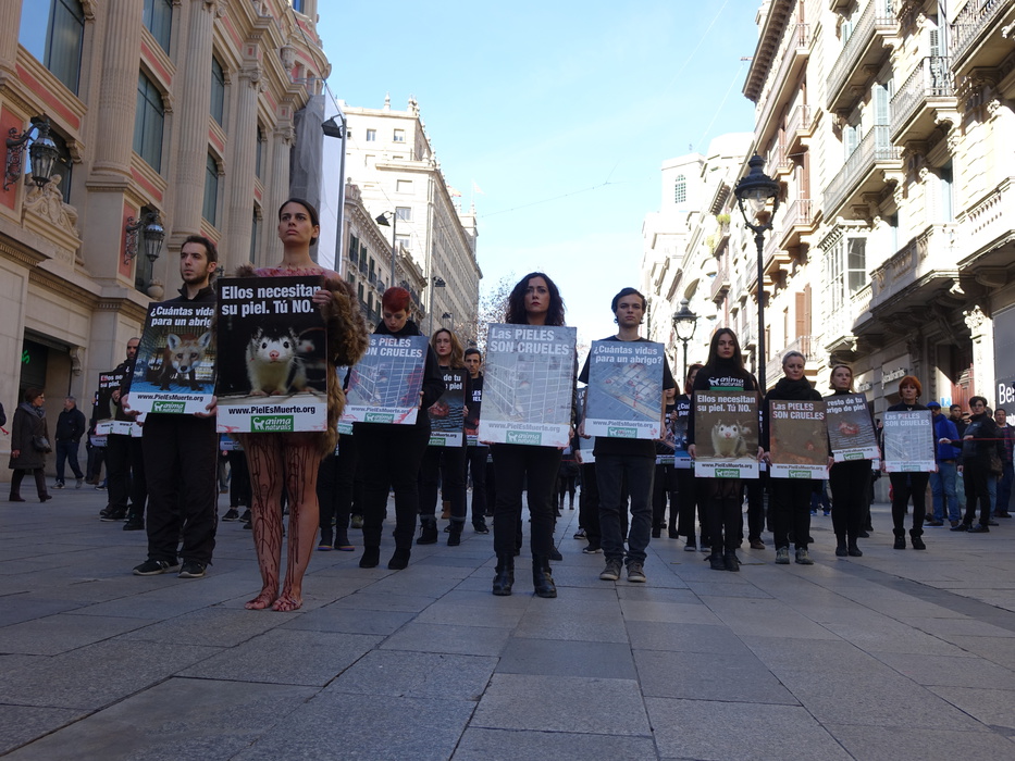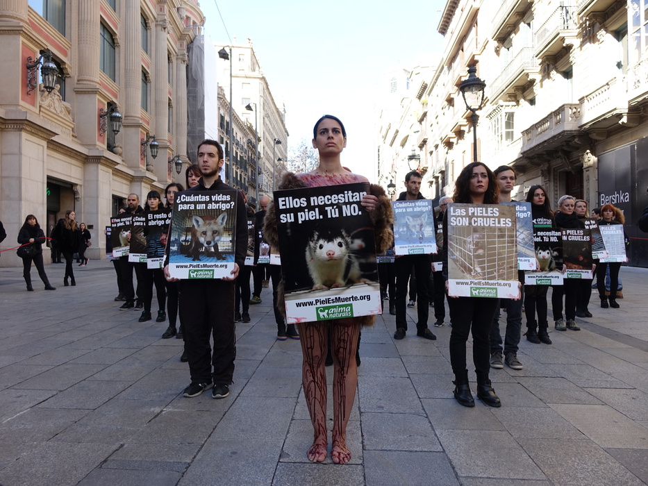 20 января 2018 года полсотни человек в черной одежде из AnimaNaturalis España (и параллельно из многих мелких групп зоозащитников) выстроились клином на важнейшей торговой улице Барселоны, Avinguda del Portal de l’Àngel — около магазинов H&M, Bershka, El Corte Inglés. Магазины эти, конечно, торгуют мехом и другими частями тел мёртвых животных — шелком, пером, шерстью, кожей.