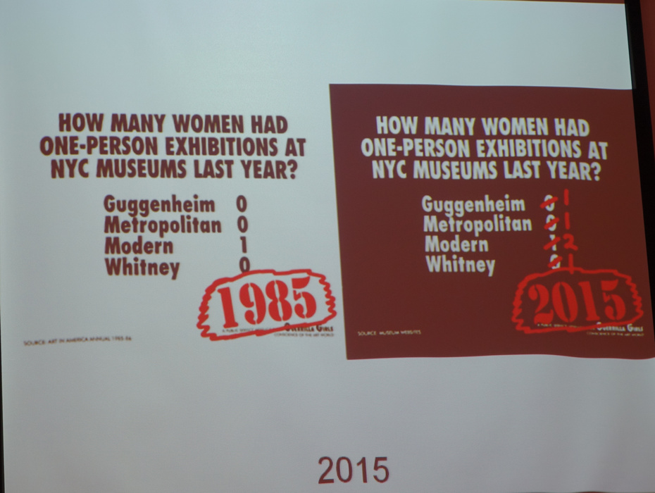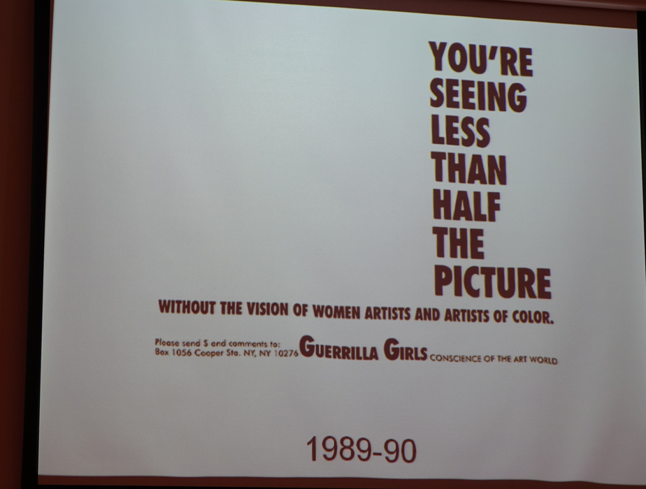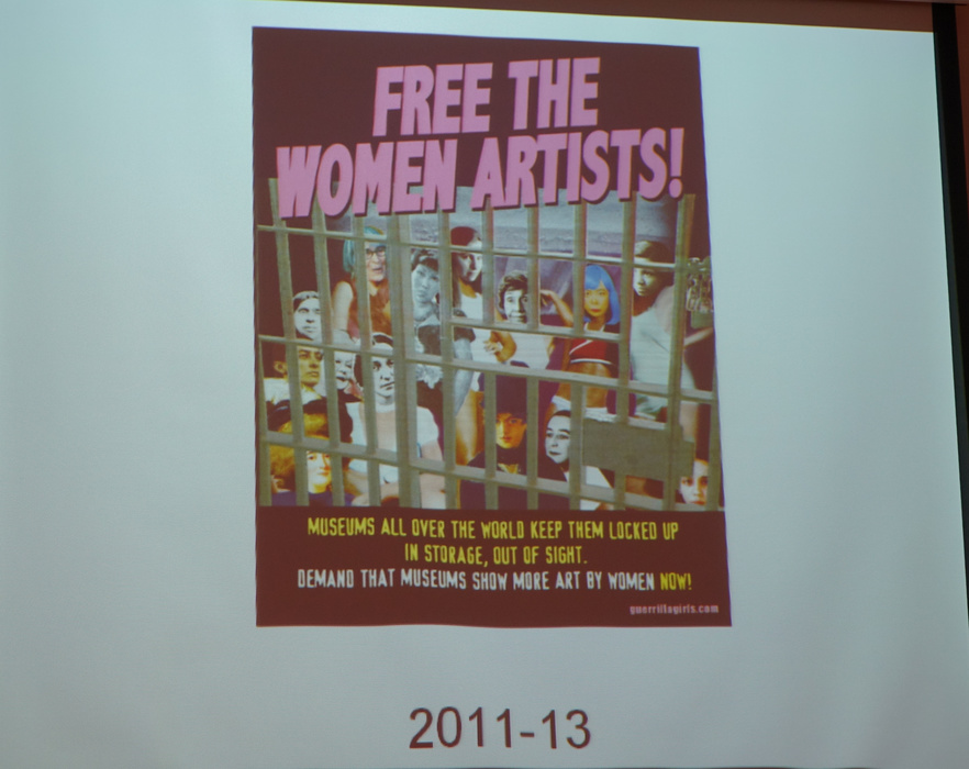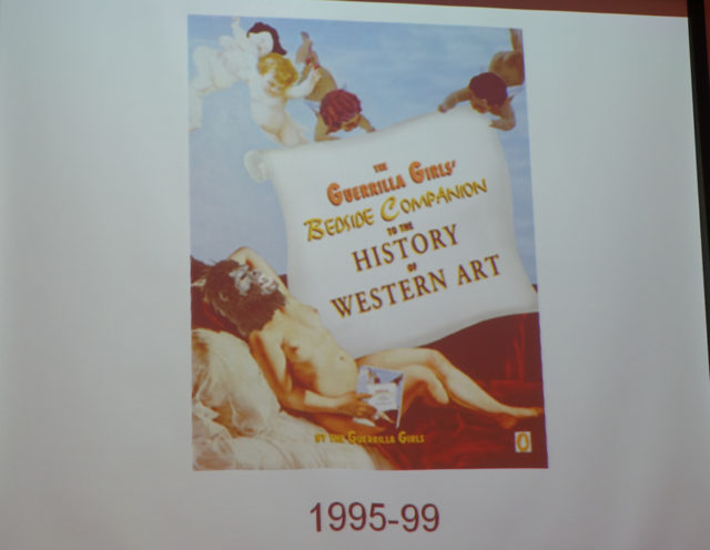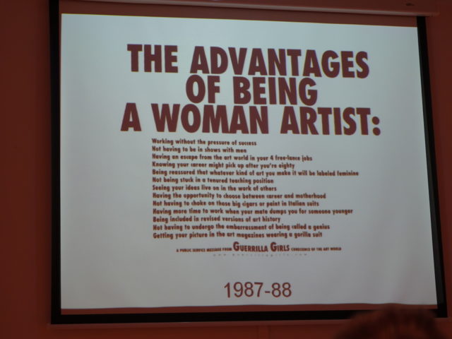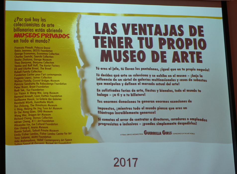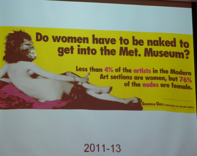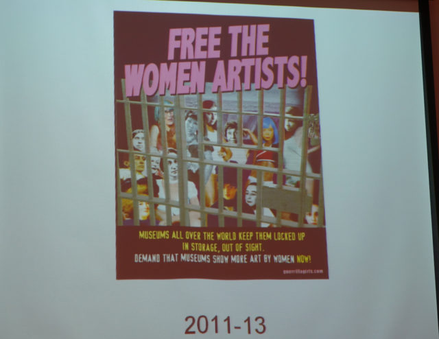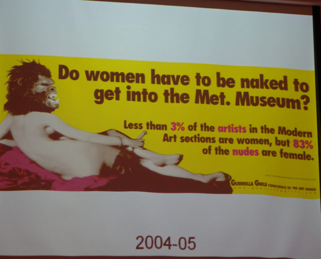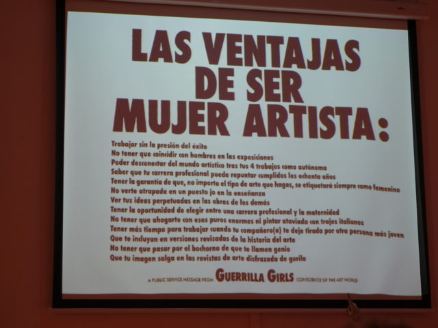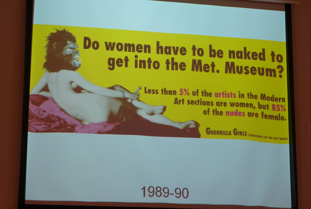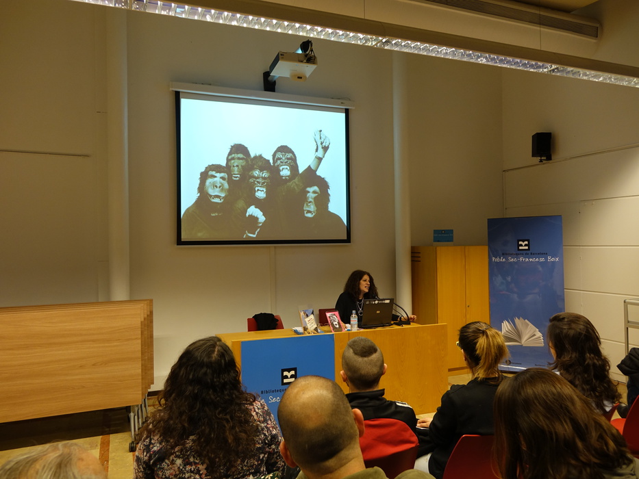 Вечером 5 марта 2018 года в Biblioteca Poble-sec Francesc Boix состоялась лекция о месте, которое отводится женщинам в искусстве. Критик и искусствовед, куратор года Ольги Сахаровой в Каталонии Elina Norandi на примере известных визуализаций Guerrilla Girls рассказывала о том, что, несмотря на все усилия, которые прикладывают феминистки для сокращения гендерного разрыва в арт-мире, за последние 30 лет ситуация почти не изменилась. Волшебный мир феминизма наполнен новостями о женщинах-художницах, месяцах женской истории, феминизации обычных музеев, о женских музеях и выставках, которые «возвращают» художниц в контекст. Но музейное и оплачиваемое искусство по-прежнему остаётся мужским, мёртвым и белым. Ситуация в Барселоне не лучше. Из крупных выставочных центров только Ла Виррейна действует прогрессивно.Лекция заинтересовала 1000 человек, 100 написали, что пойдут. В результате вовремя пришло 20 взрослых людей, а остальные — всего было около 50 слушателей — до самого конца лекции приходили, шумели, мешали, перемещались по залу.