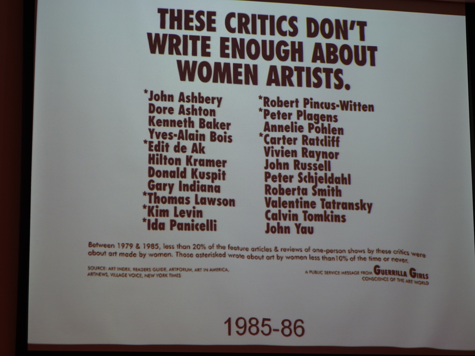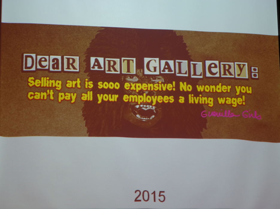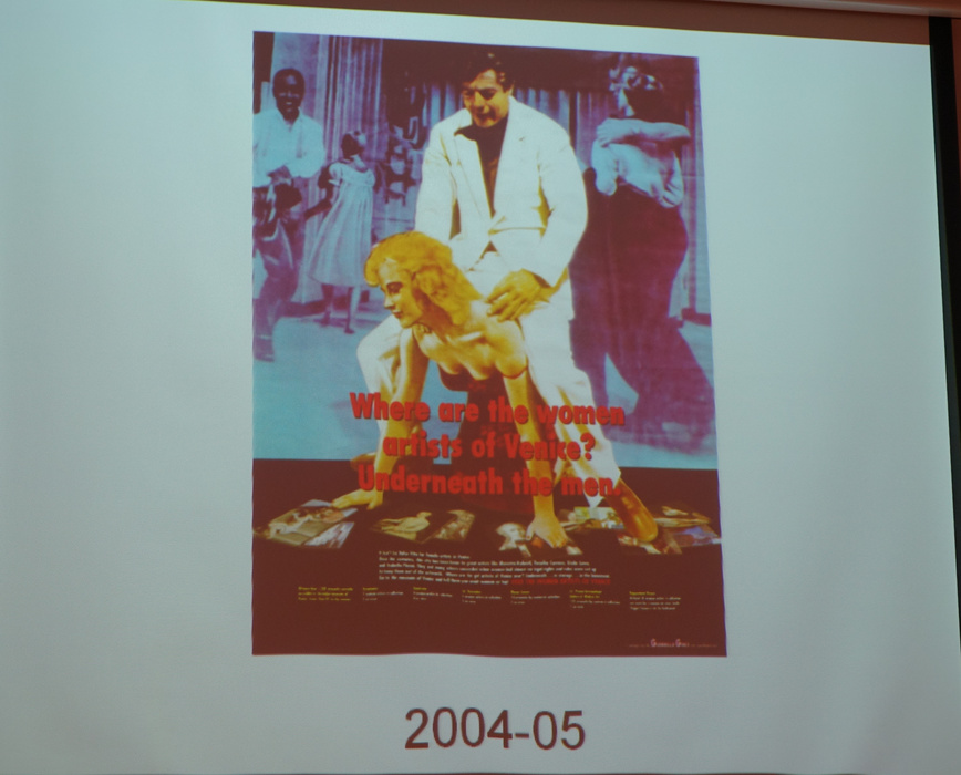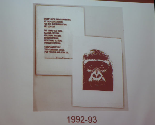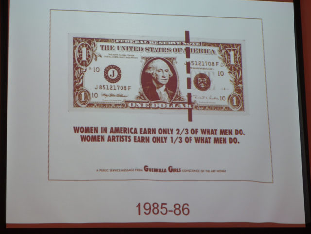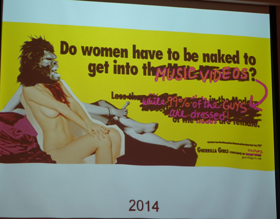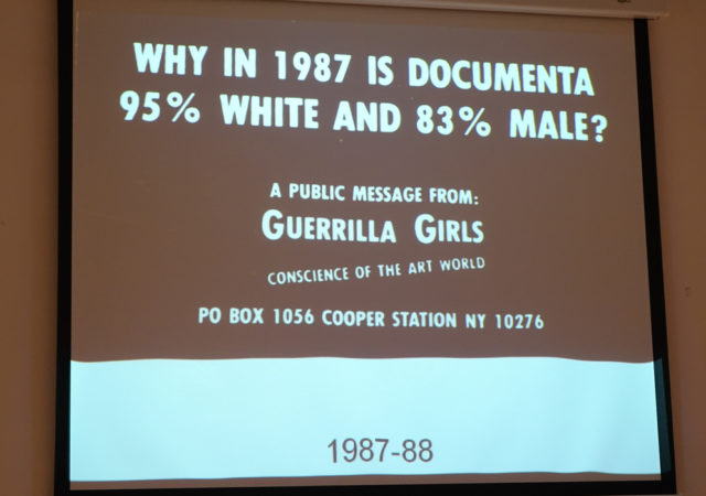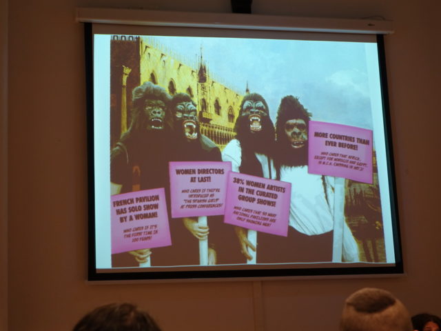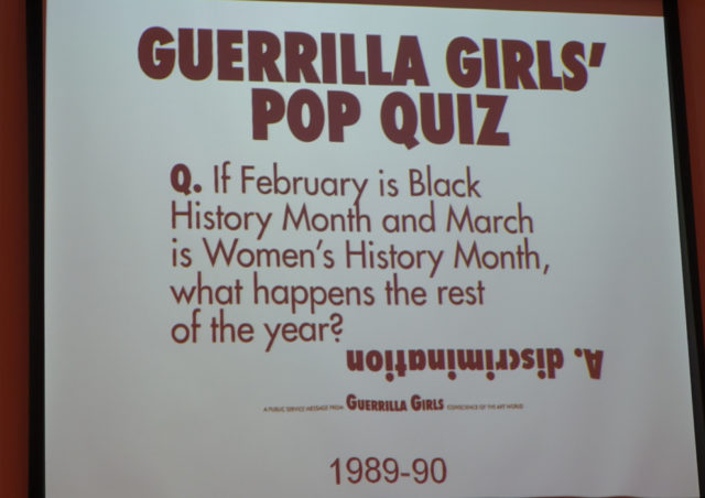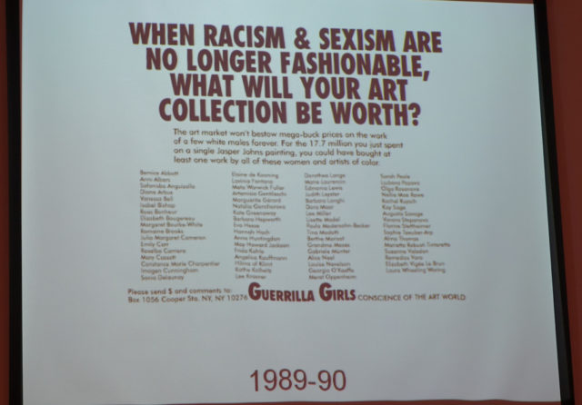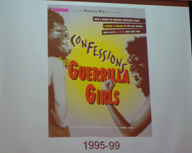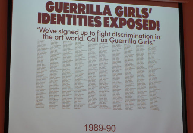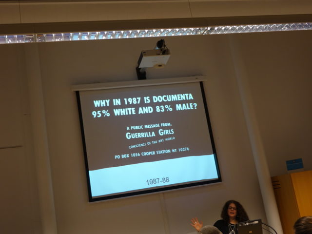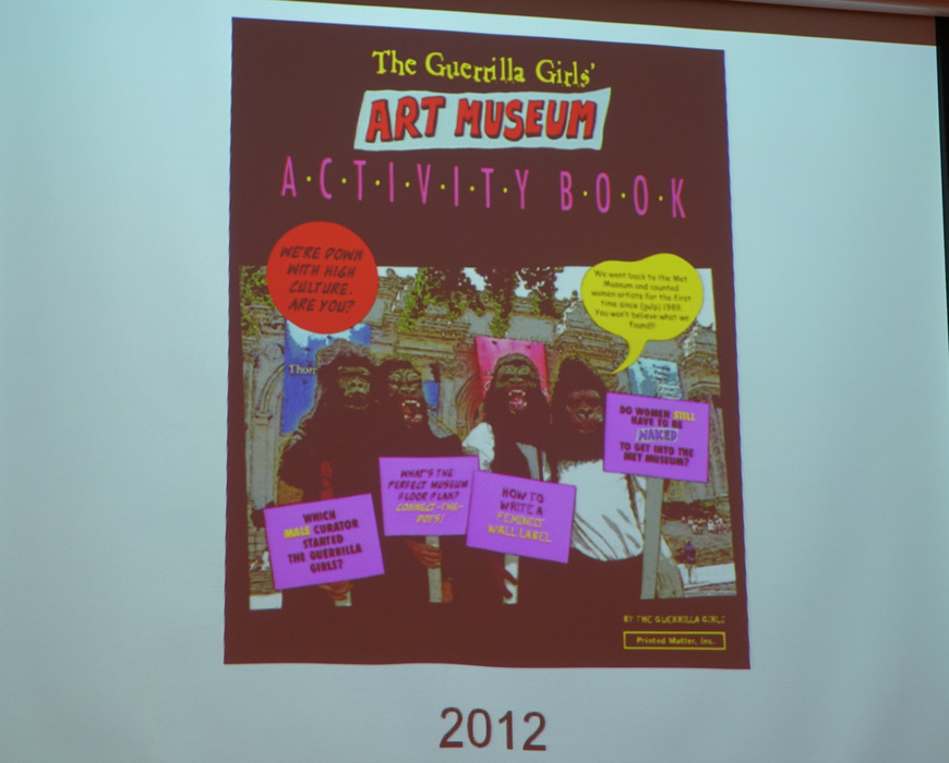 Вечером 5 марта 2018 года в Biblioteca Poble-sec Francesc Boix состоялась лекция о месте, которое отводится женщинам в искусстве. Критик и искусствовед, куратор года Ольги Сахаровой в Каталонии Elina Norandi на примере известных визуализаций Guerrilla Girls рассказывала о том, что, несмотря на все усилия, которые прикладывают феминистки для сокращения гендерного разрыва в арт-мире, за последние 30 лет ситуация почти не изменилась. Волшебный мир феминизма наполнен новостями о женщинах-художницах, месяцах женской истории, феминизации обычных музеев, о женских музеях и выставках, которые «возвращают» художниц в контекст. Но музейное и оплачиваемое искусство по-прежнему остаётся мужским, мёртвым и белым. Ситуация в Барселоне не лучше. Из крупных выставочных центров только Ла Виррейна действует прогрессивно.Лекция заинтересовала 1000 человек, 100 написали, что пойдут. В результате вовремя пришло 20 взрослых людей, а остальные — всего было около 50 слушателей — до самого конца лекции приходили, шумели, мешали, перемещались по залу.