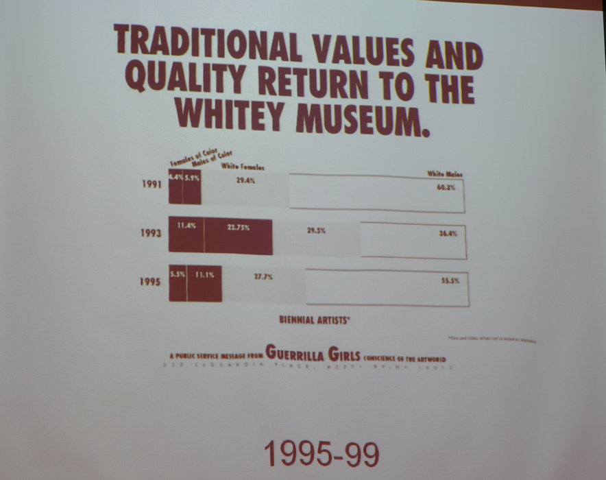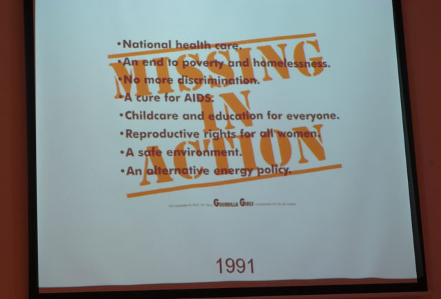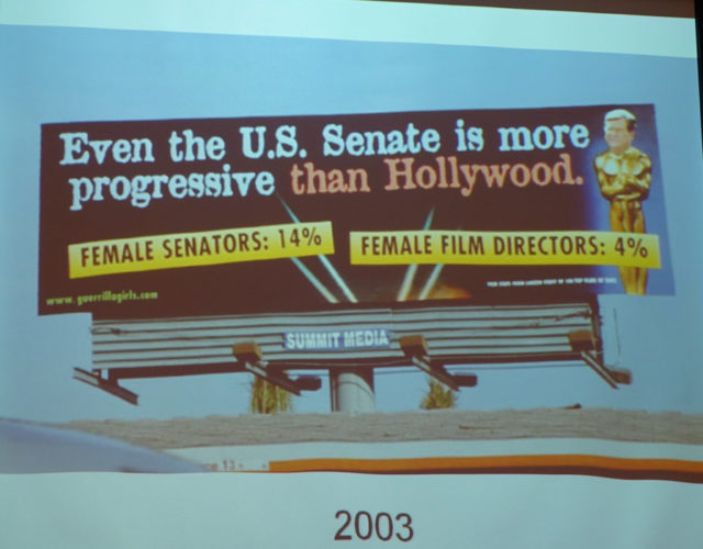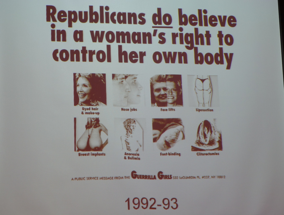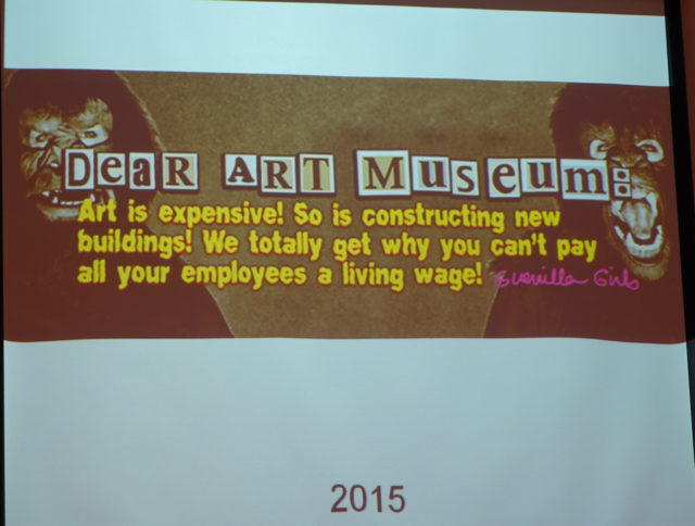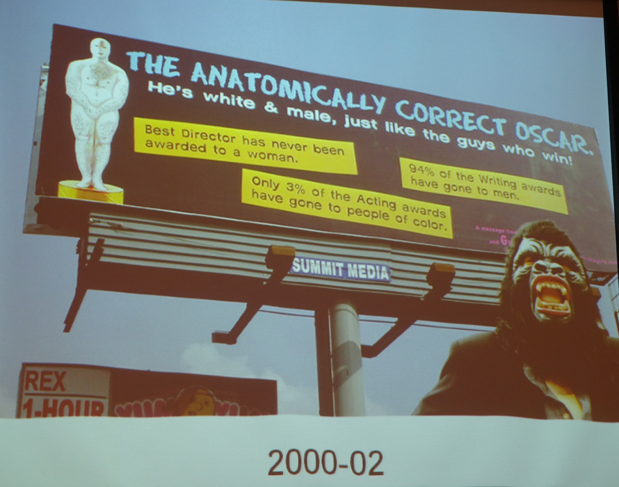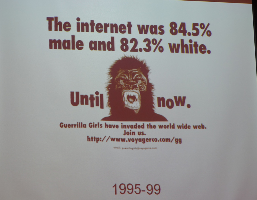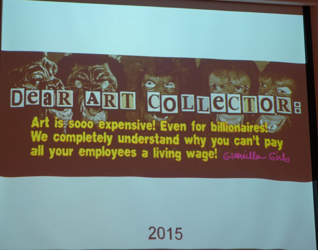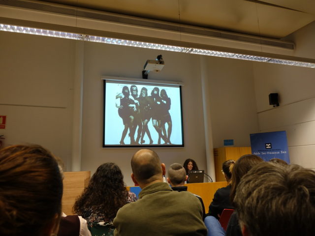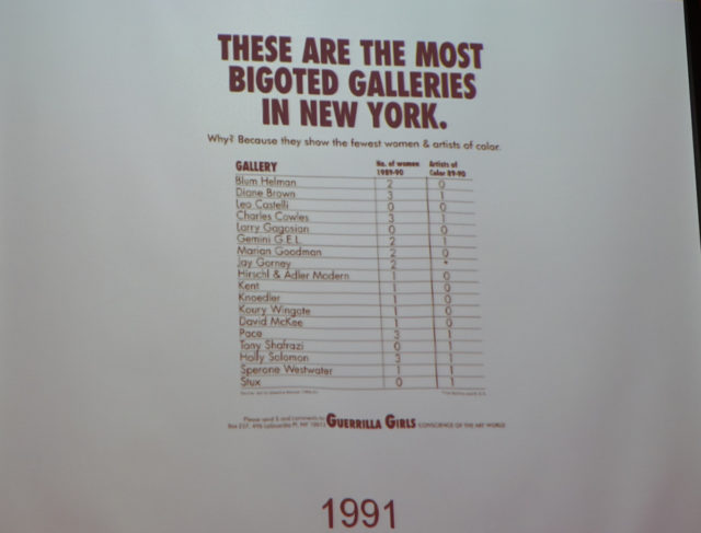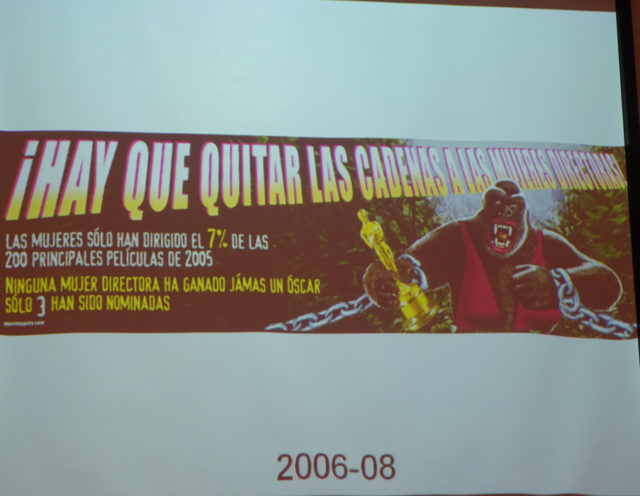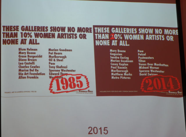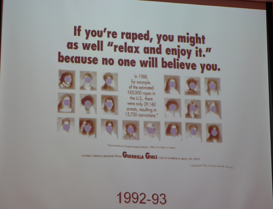 Вечером 5 марта 2018 года в Biblioteca Poble-sec Francesc Boix состоялась лекция о месте, которое отводится женщинам в искусстве. Критик и искусствовед, куратор года Ольги Сахаровой в Каталонии Elina Norandi на примере известных визуализаций Guerrilla Girls рассказывала о том, что, несмотря на все усилия, которые прикладывают феминистки для сокращения гендерного разрыва в арт-мире, за последние 30 лет ситуация почти не изменилась. Волшебный мир феминизма наполнен новостями о женщинах-художницах, месяцах женской истории, феминизации обычных музеев, о женских музеях и выставках, которые «возвращают» художниц в контекст. Но музейное и оплачиваемое искусство по-прежнему остаётся мужским, мёртвым и белым. Ситуация в Барселоне не лучше. Из крупных выставочных центров только Ла Виррейна действует прогрессивно.Лекция заинтересовала 1000 человек, 100 написали, что пойдут. В результате вовремя пришло 20 взрослых людей, а остальные — всего было около 50 слушателей — до самого конца лекции приходили, шумели, мешали, перемещались по залу.