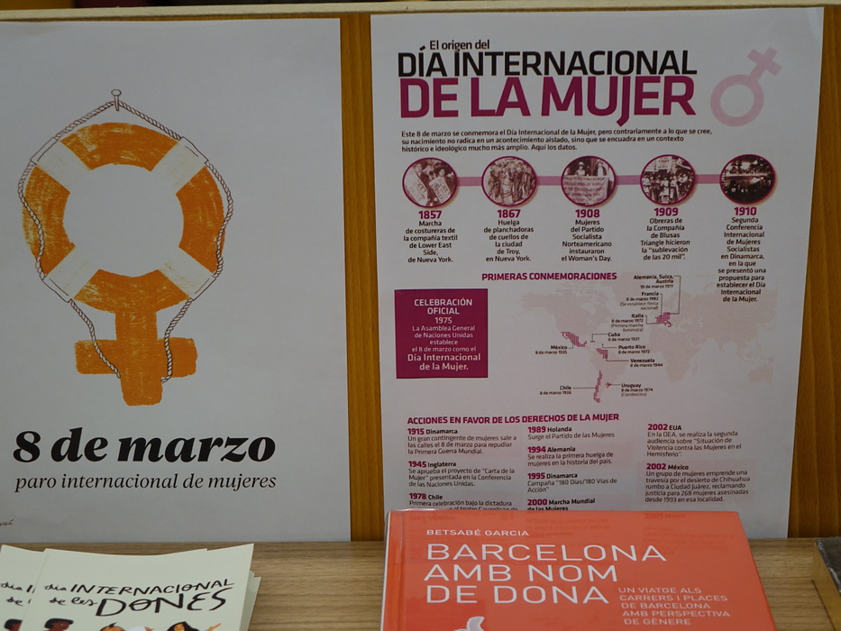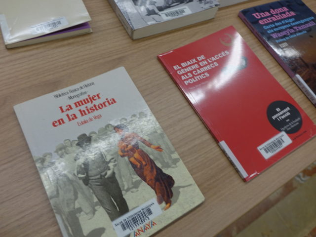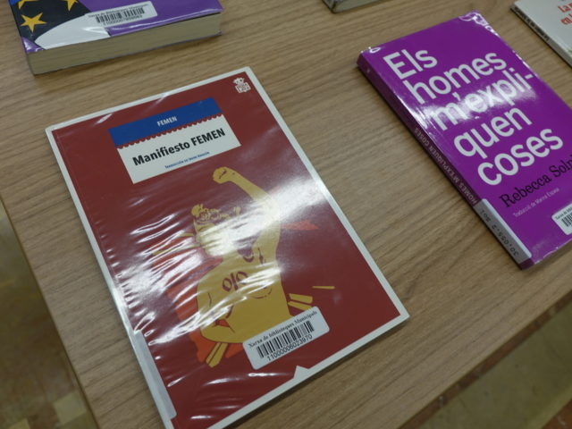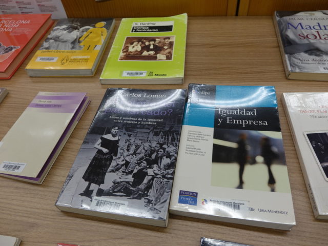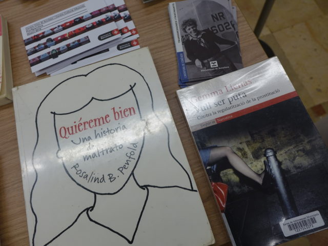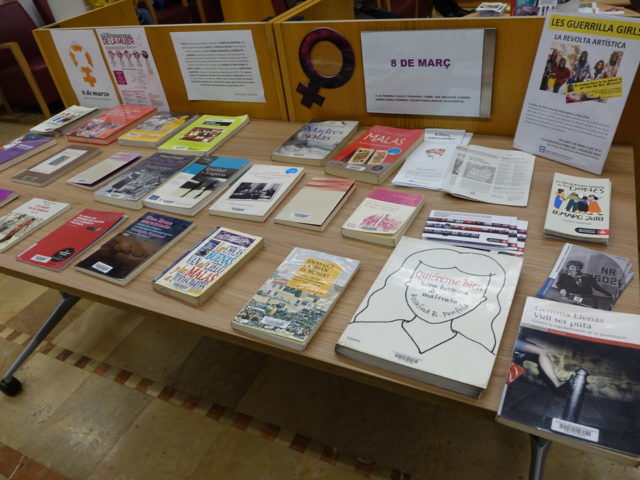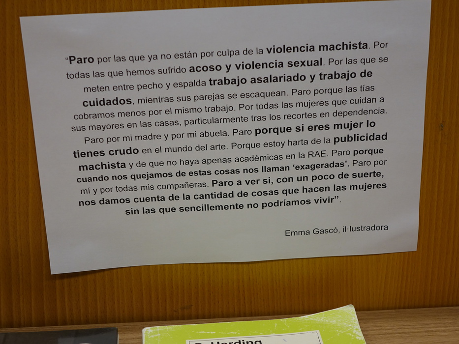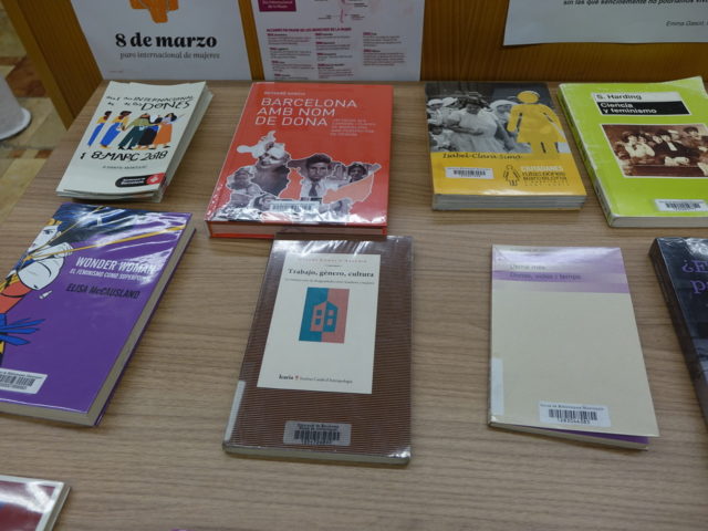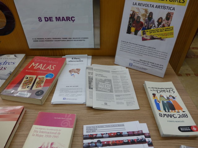 Каждое приличное существо в марте проводит хоть маленькое, но радикально феминистское мероприятие. Biblioteca Poble-sec Francesc Boix прогрессивная дальше некуда — она и так народная и антифашистская. Есть прекрасный детский зал, где родители обоих полов ползают вместе со своими малышами под надписью «Сохраняйте тишину». Есть интернет и зал для мероприятий, туалеты — всё очень спокойно и удобно. Библиотека полна людей и, разумеется, участвует в мартовских мероприятиях. В холле — прямо у входной двери — выставка книг о равенстве и горки приглашений на актуальные события. Справа -листовка про фемакции, которые устраиваются на уровне горсовета.