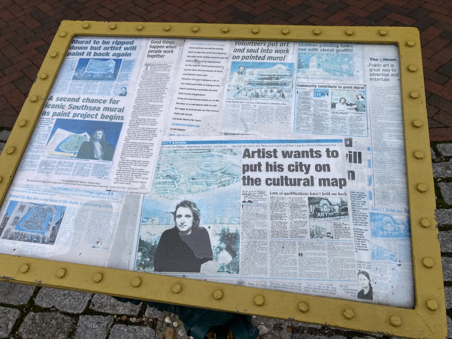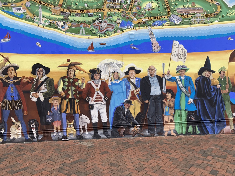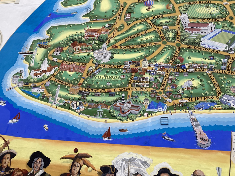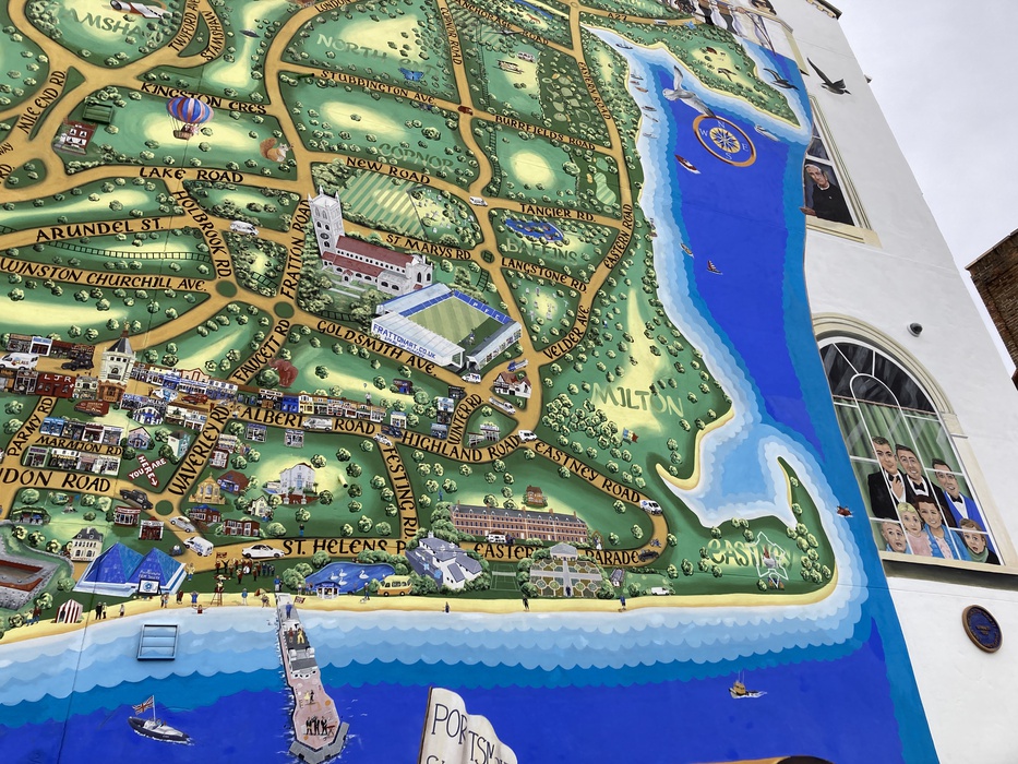 В Саутси — юго-западной части Портсмута (или Помпея, как называют его местные жители) — на пересечении Waverley Road и Clarendon Road есть Strand mural, отражающая историю города. Она была создана в 1997 году, потом была перерисована, недавно еще раз пострадала от вандализма. В 2020 году горсовет выделил очередной грант в 4 700 фунтов, художник Mark Lewis закрасил теги юных граффитчиков. Обновление было своевременным, так как ветер и дождь повредили штукатурку, сейчас мураль сияет новыми красками. Желающие могут за умеренную плату добавить себя или свои бизнесы на карту города, тарифы написаны прямо на стене — 50 фунтов на человека, 150 — на предприятие. Не так уж и дорого за место в истории. Открытым остаётся только один вопрос — кто оплатил рисование такого количества маленьких собачек.