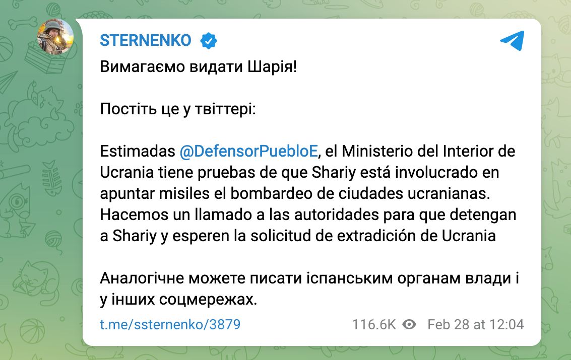28 февраля 2022 года Сергей Стерненко запустил твиттер-флэшмоб о экстрадиции Шария.
