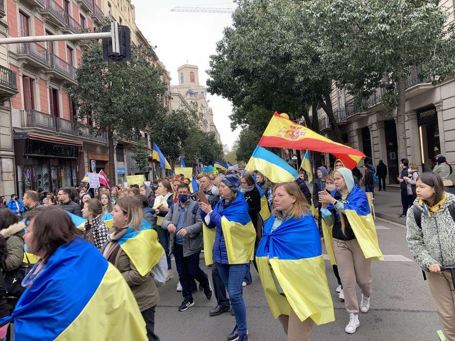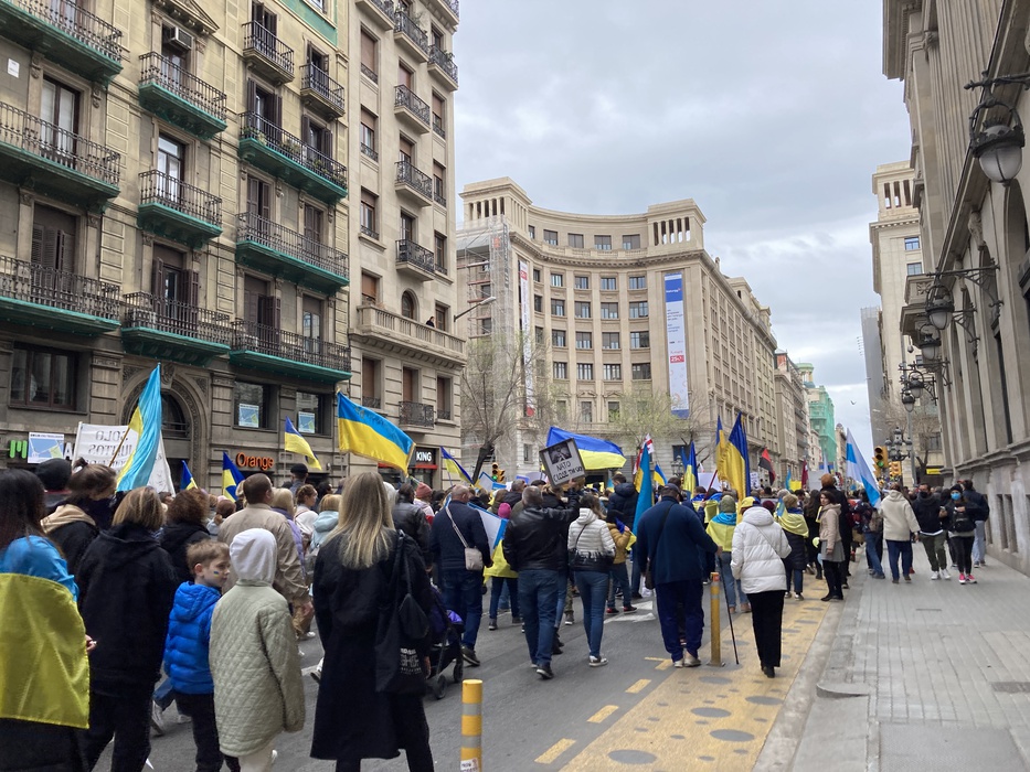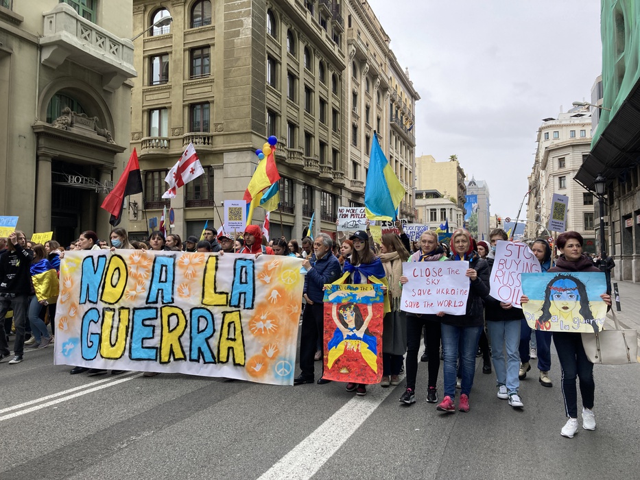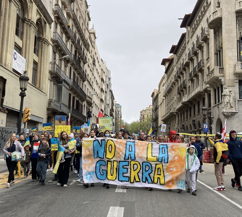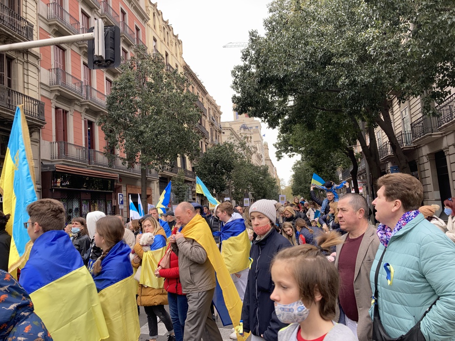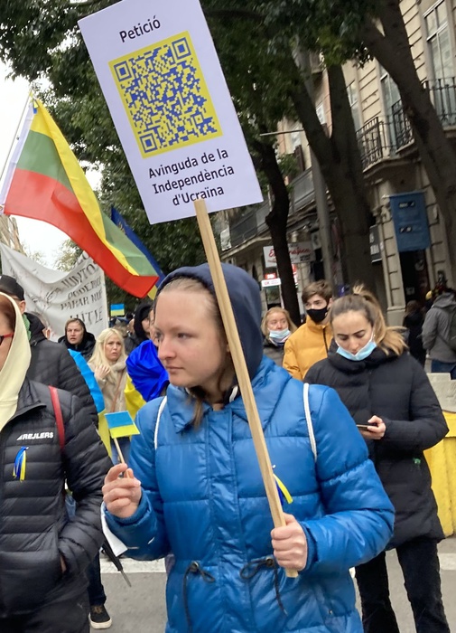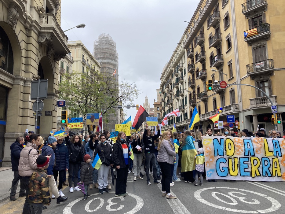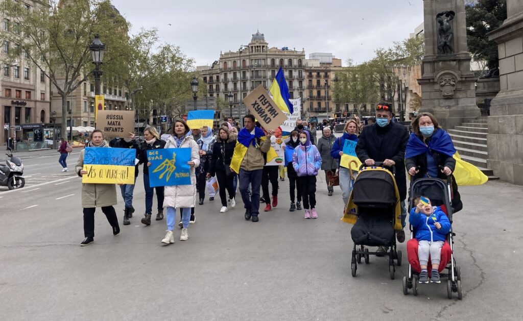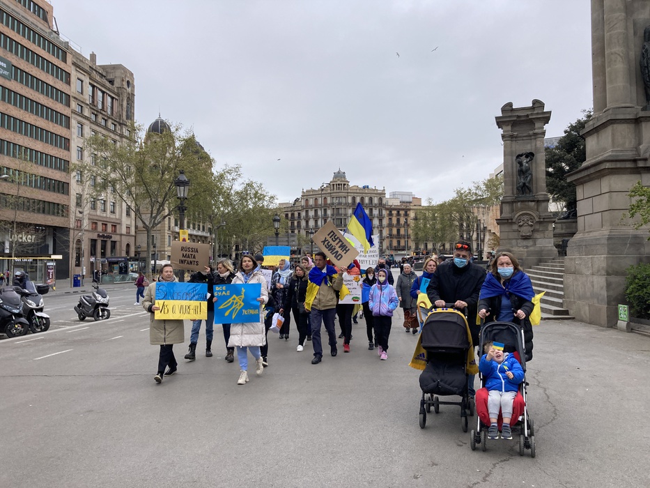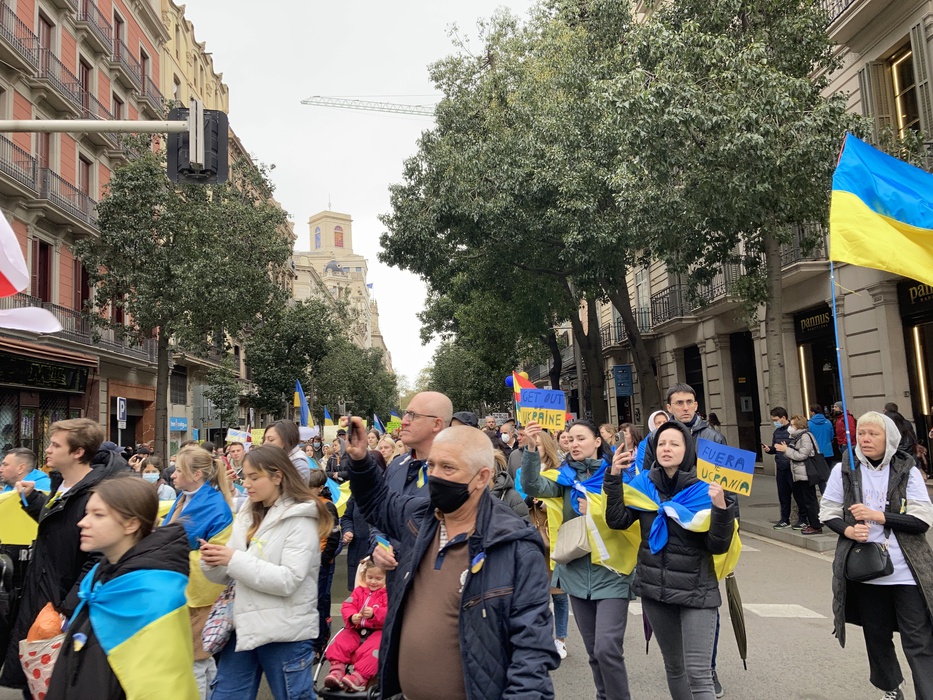 31.4.2022 в Барселоне около 300 человек участвовали в протесте против войны в Украине. Люди стали собираться около 11 часов на площади Каталонии, шествие началось после 12 часов. На Via Laetana шествие возглавили дети, которые несли украинский флаг. Были плакаты и листовки о петиции — о переименовании проспекта, на котором располагается российское консульство в Барселоне, в проспект имени Независимости Украины.
