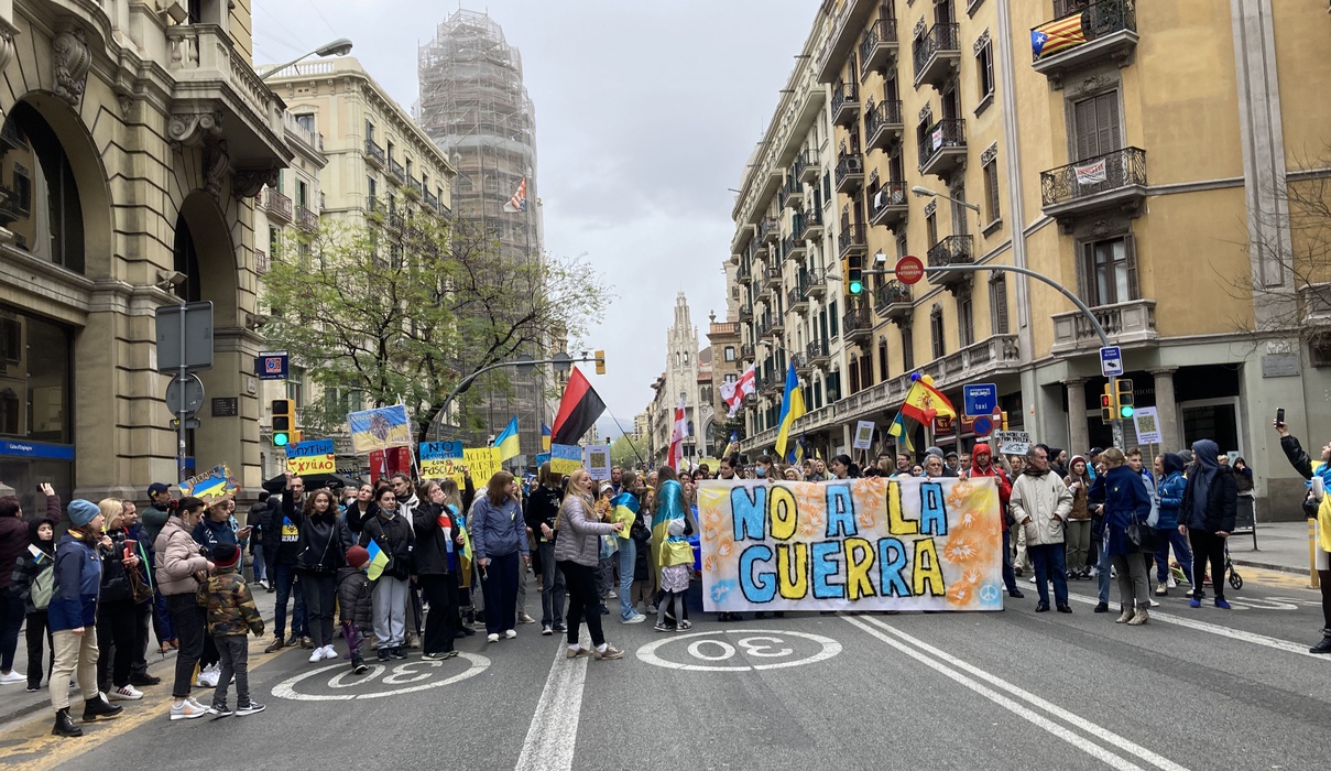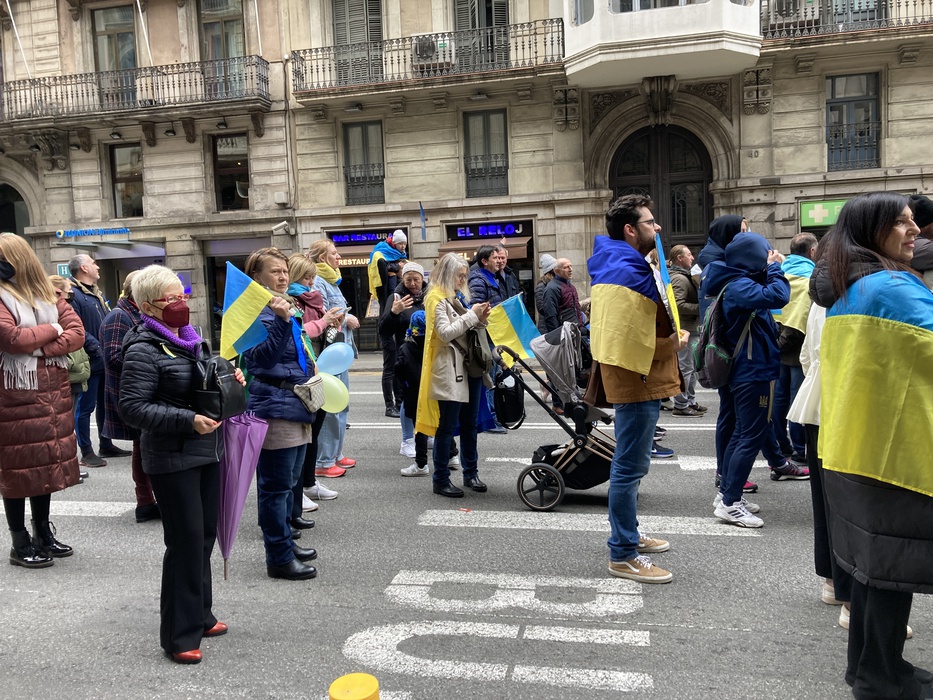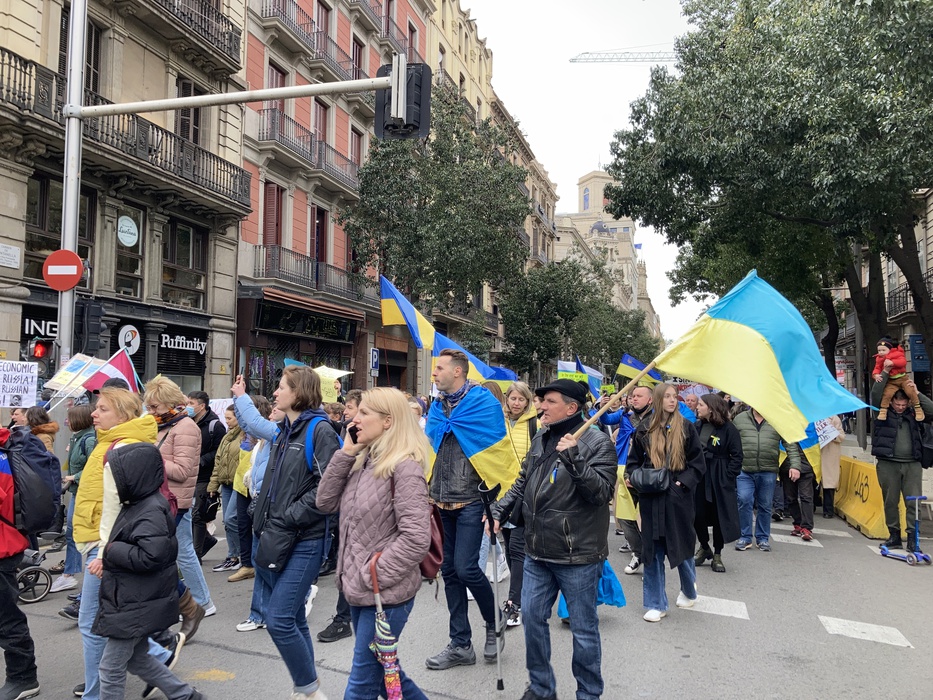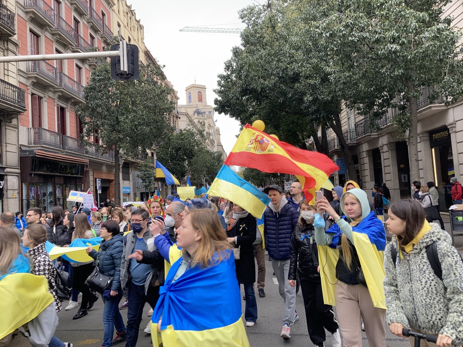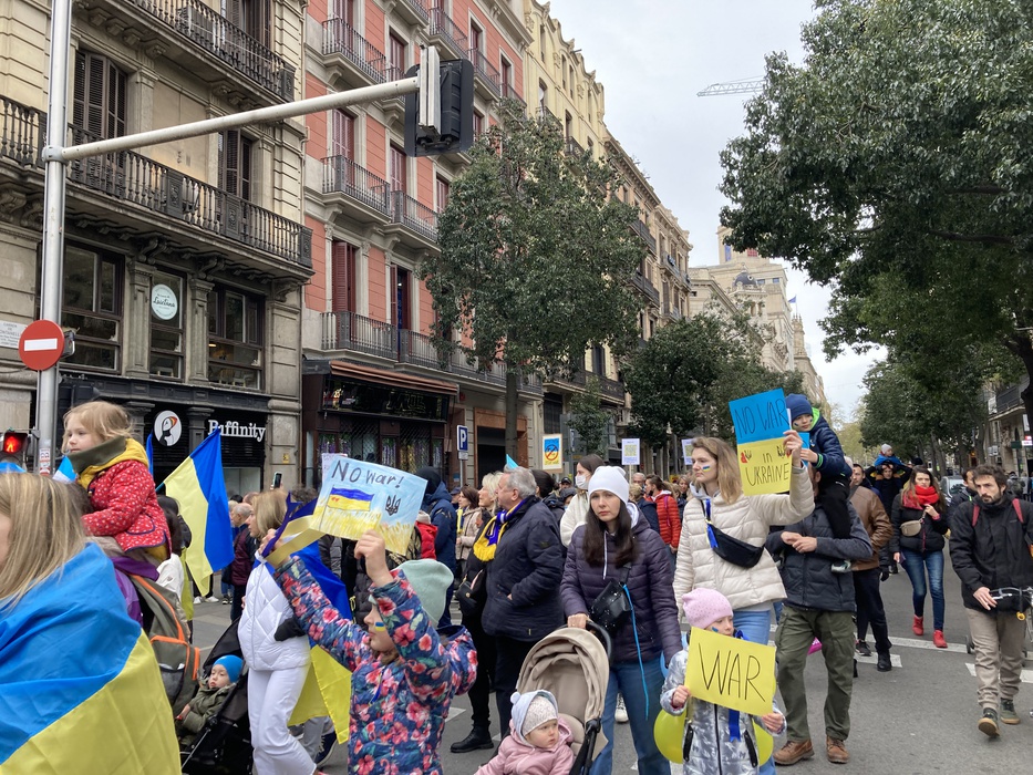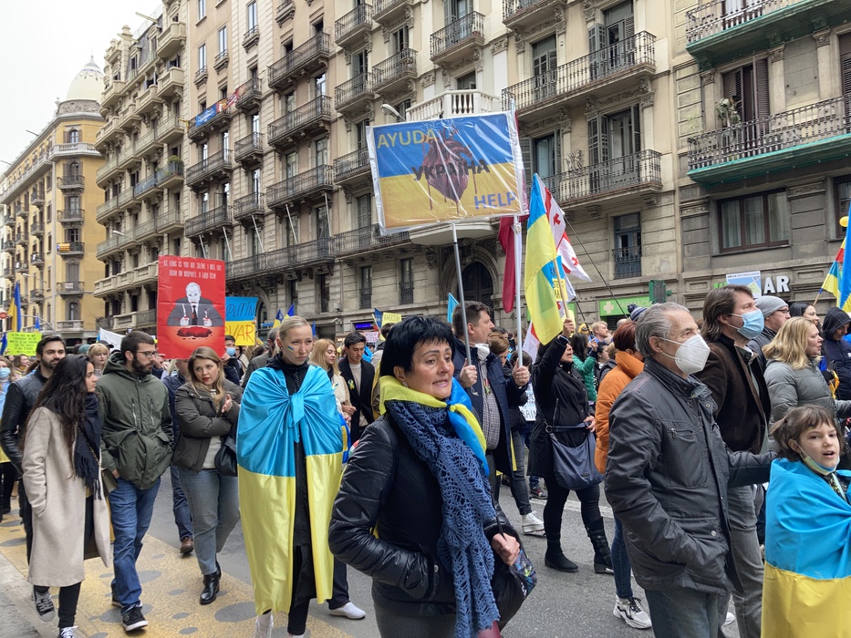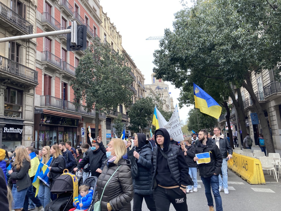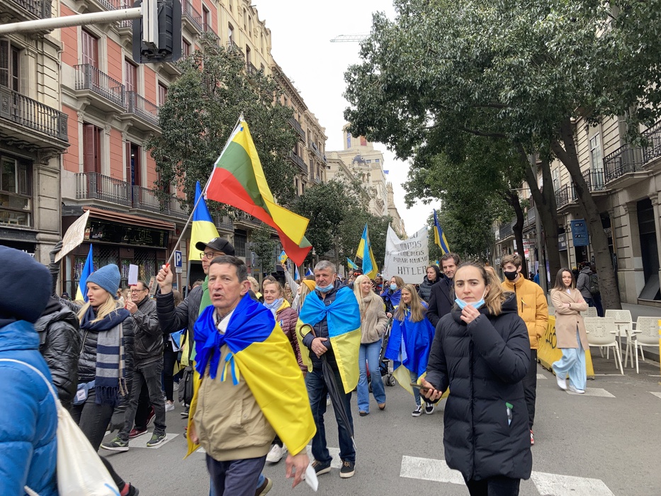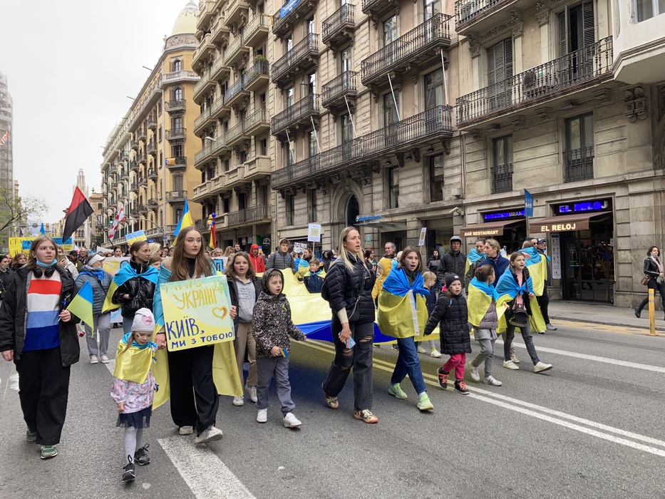 31.4.2022 в Барселоне около 300 человек участвовали в протесте против войны в Украине. Люди стали собираться около 11 часов на площади Каталонии, шествие началось после 12 часов. На Via Laetana шествие возглавили дети, которые несли украинский флаг. Были плакаты и листовки о петиции — о переименовании проспекта, на котором располагается российское консульство в Барселоне, в проспект имени Независимости Украины.