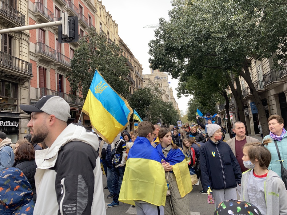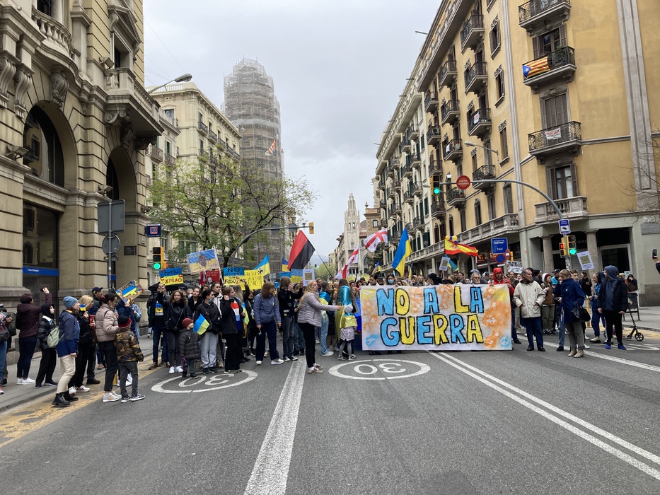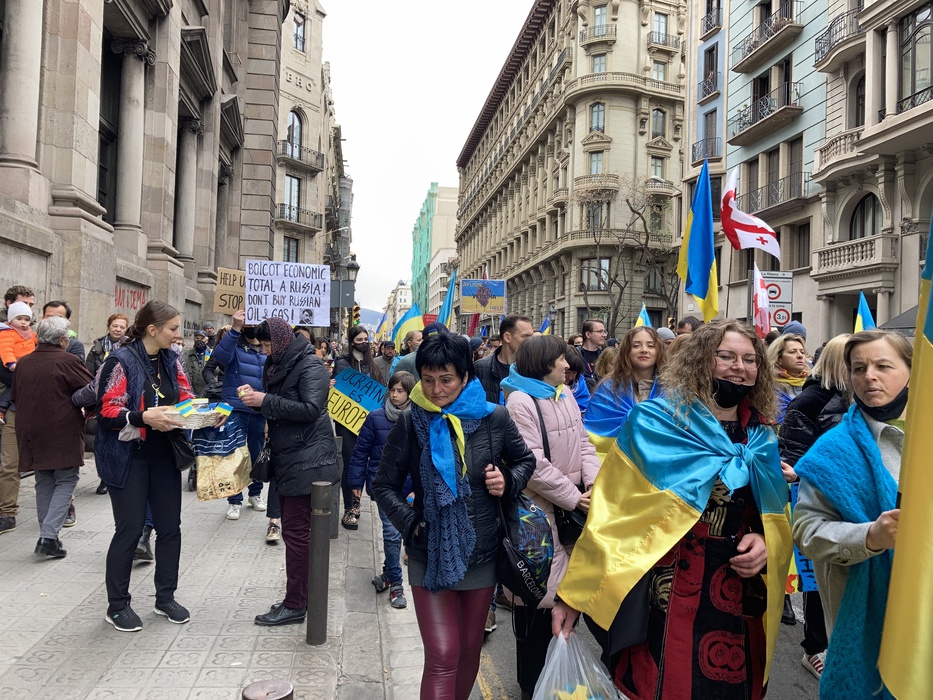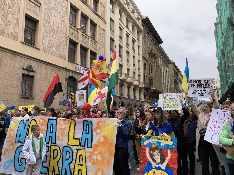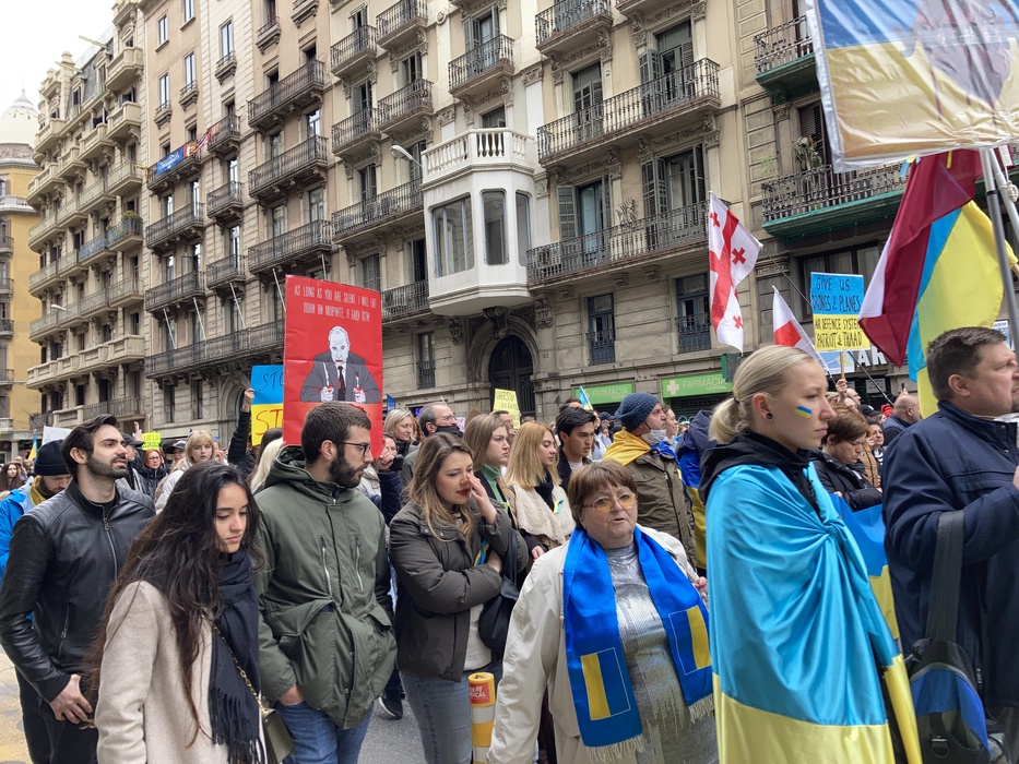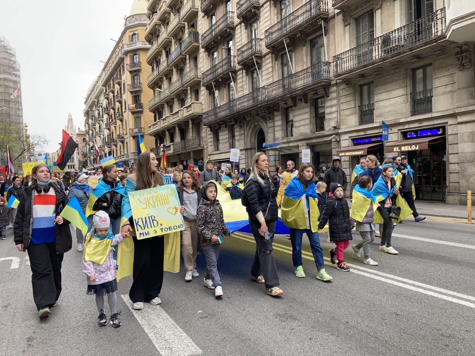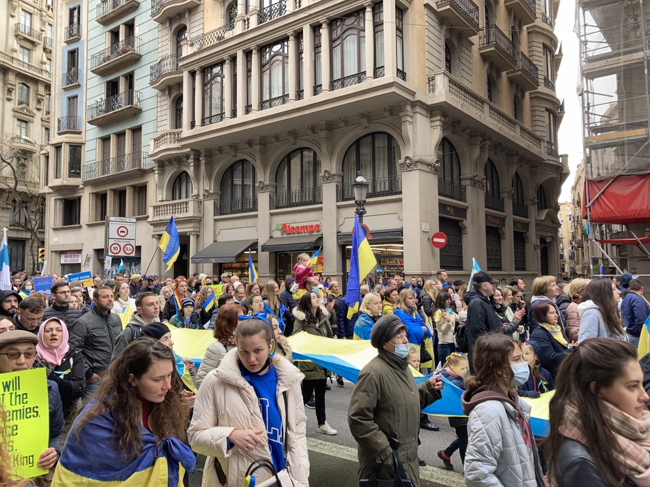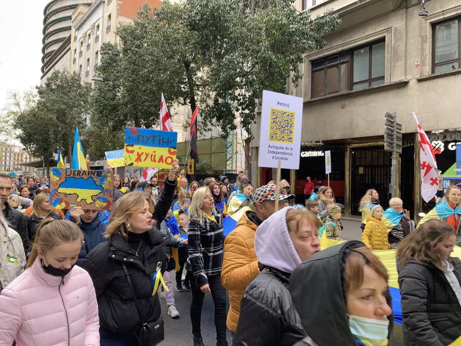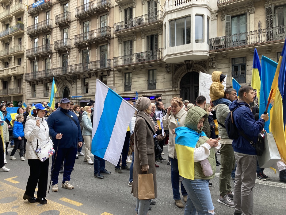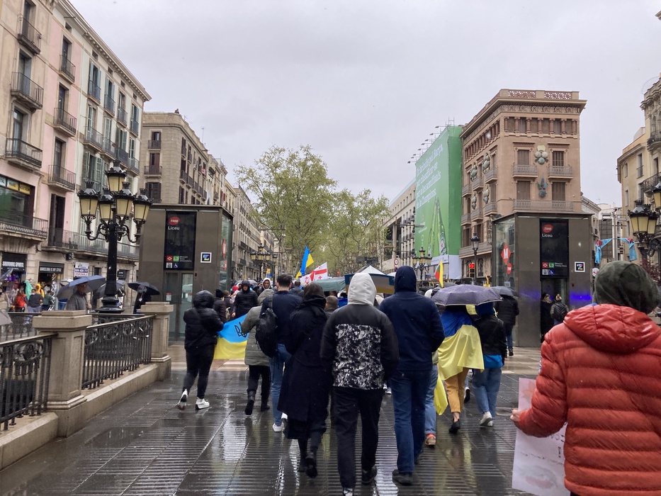31.4.2022 в Барселоне около 300 человек участвовали в протесте против войны в Украине. Люди стали собираться около 11 часов на площади Каталонии, шествие началось после 12 часов. На Via Laetana шествие возглавили дети, которые несли украинский флаг. Были плакаты и листовки о петиции — о переименовании проспекта, на котором располагается российское консульство в Барселоне, в проспект имени Независимости Украины.