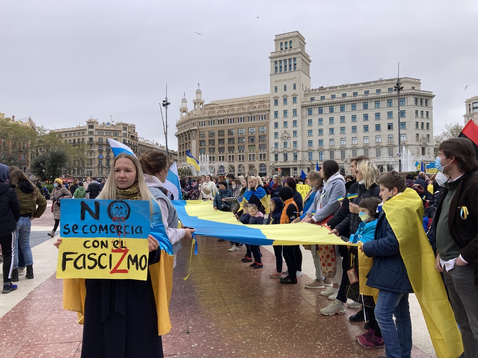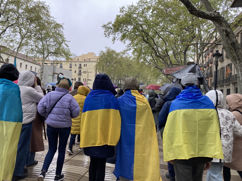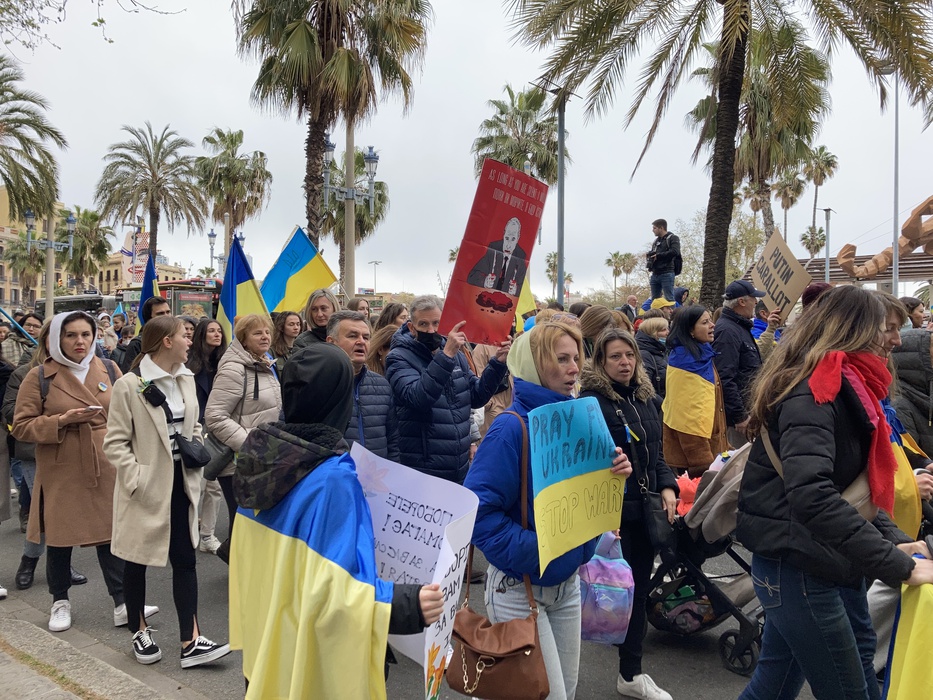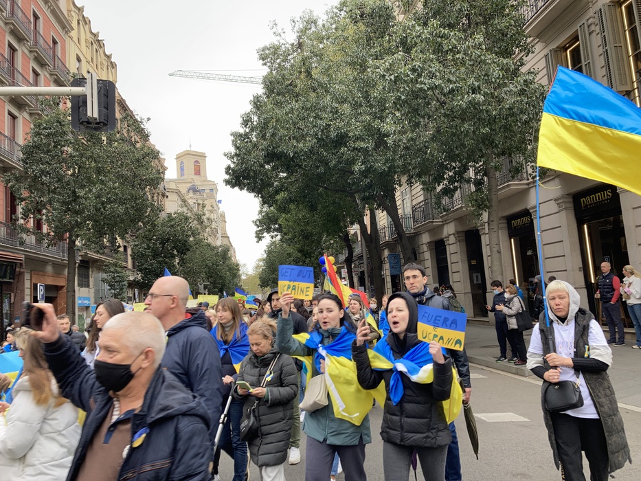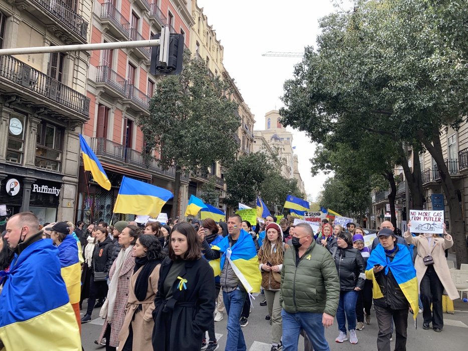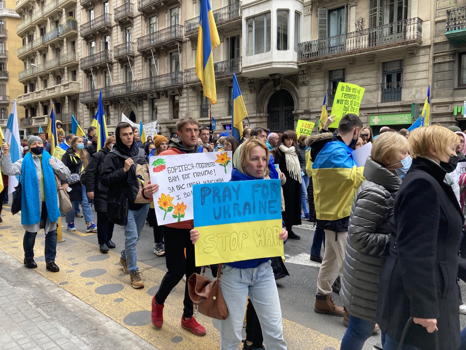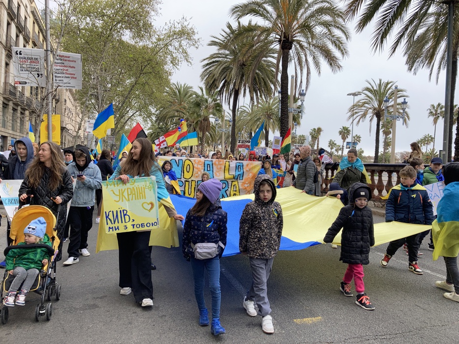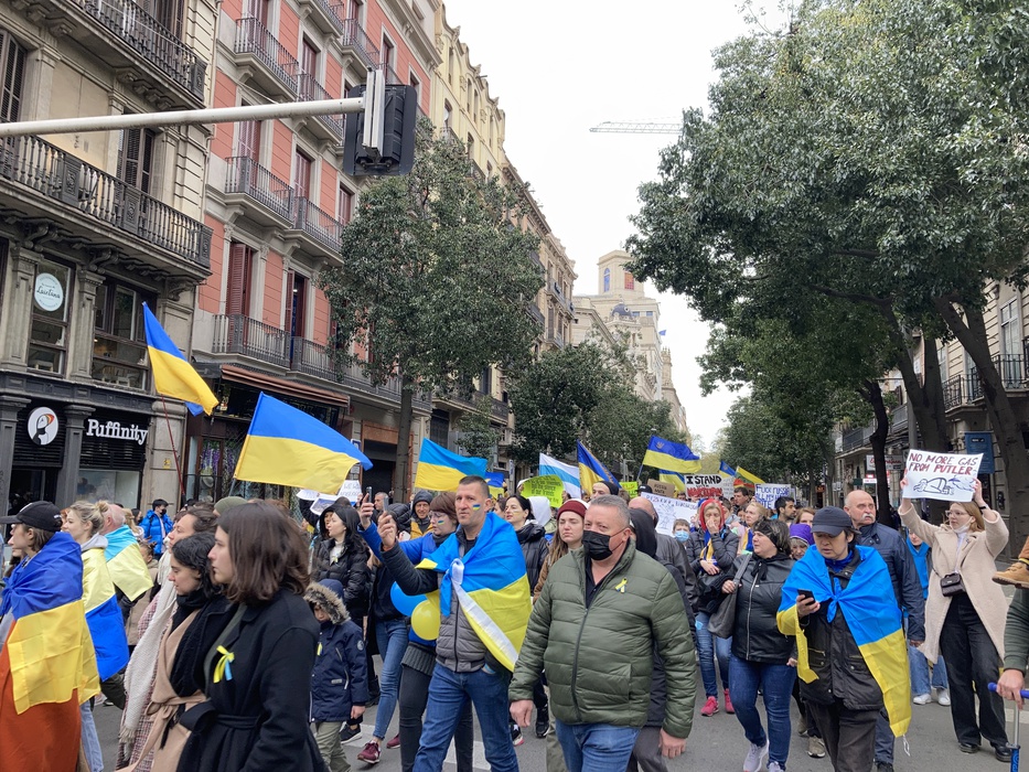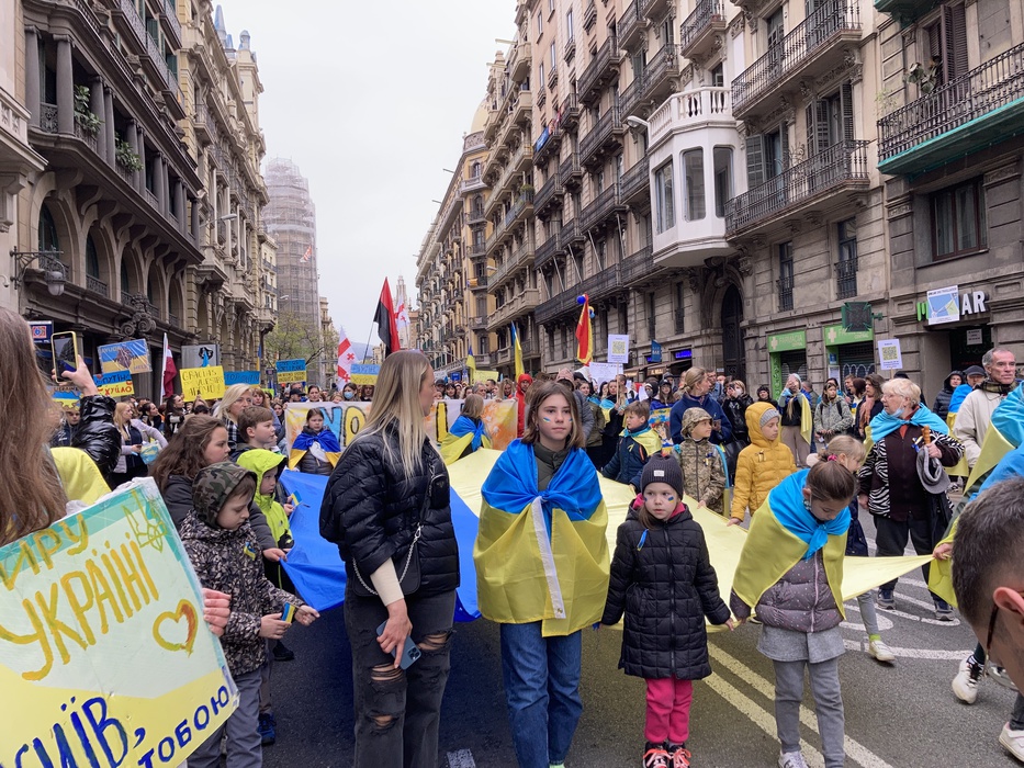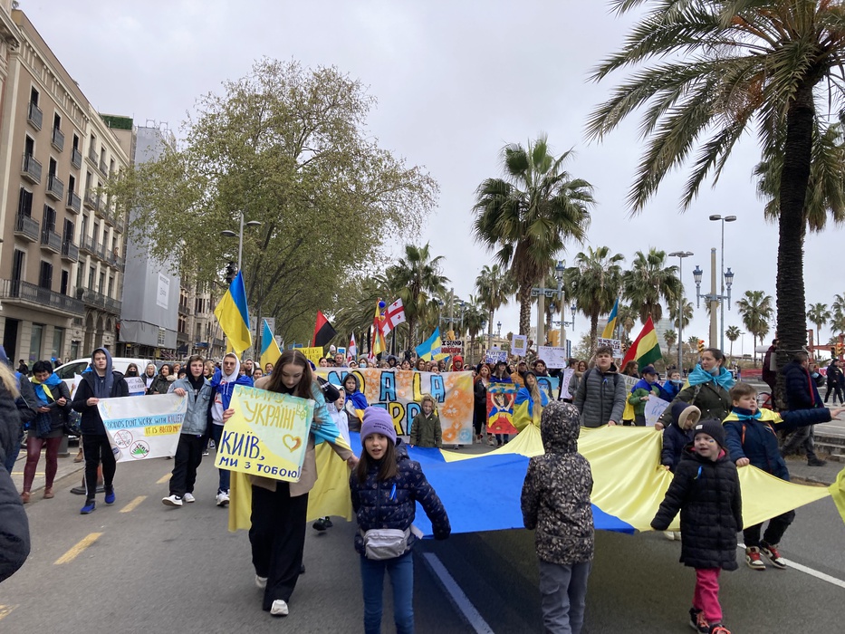 31.4.2022 в Барселоне около 300 человек участвовали в протесте против войны в Украине. Люди стали собираться около 11 часов на площади Каталонии, шествие началось после 12 часов. На Via Laetana шествие возглавили дети, которые несли украинский флаг. Были плакаты и листовки о петиции — о переименовании проспекта, на котором располагается российское консульство в Барселоне, в проспект имени Независимости Украины.
