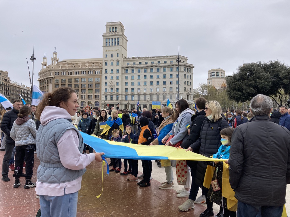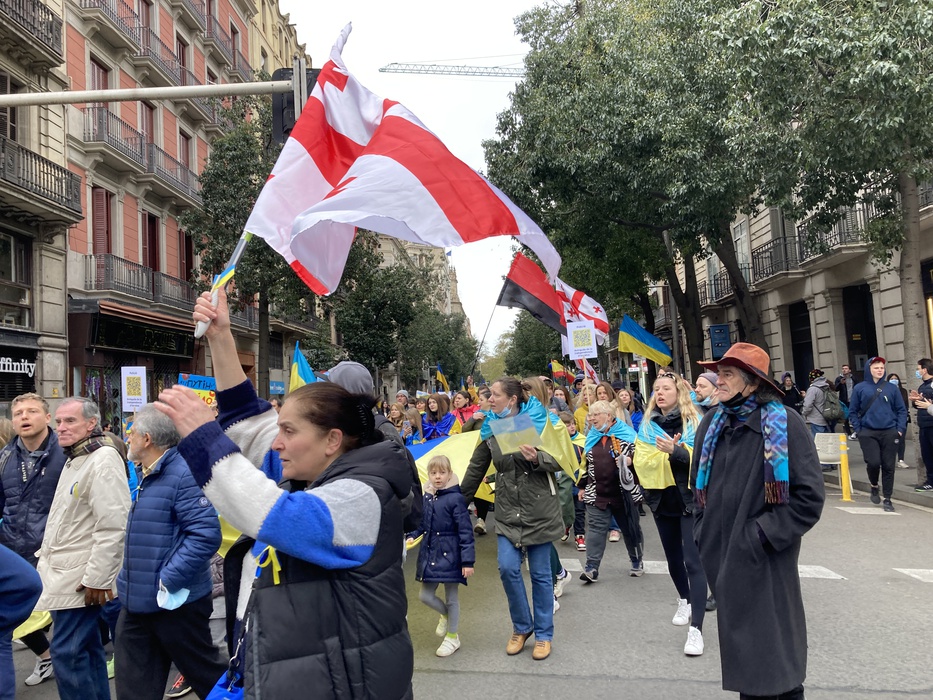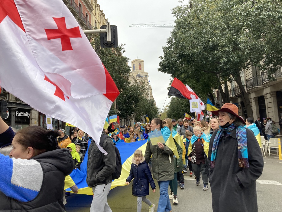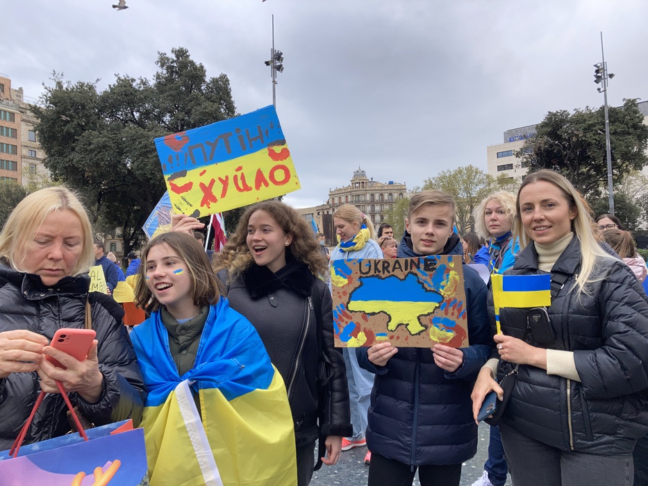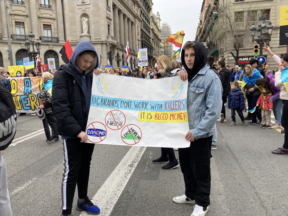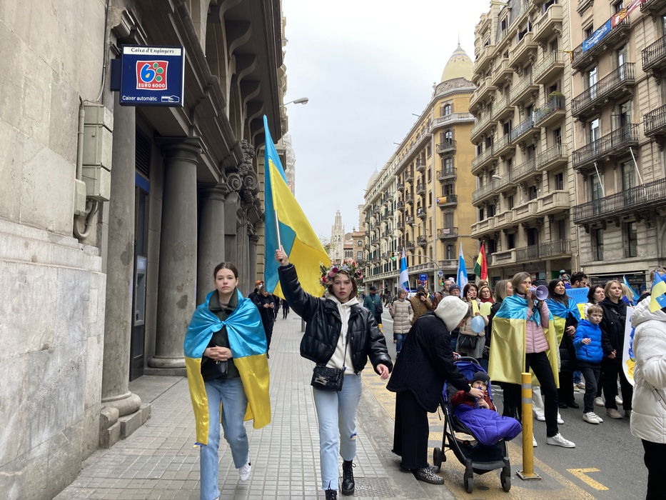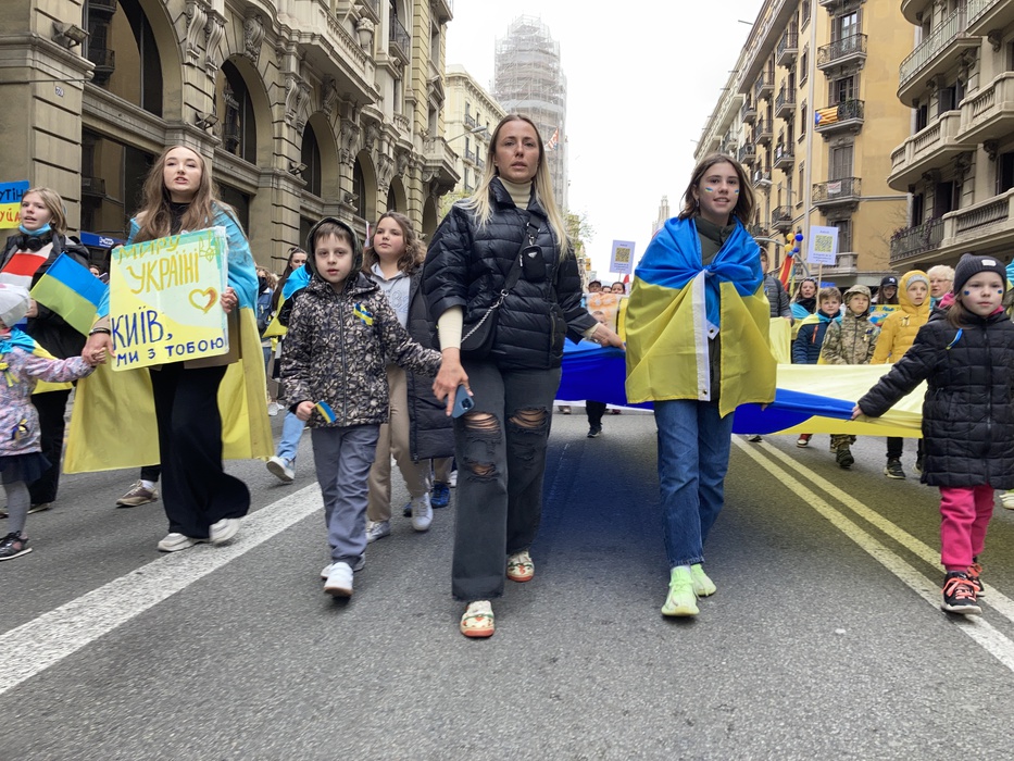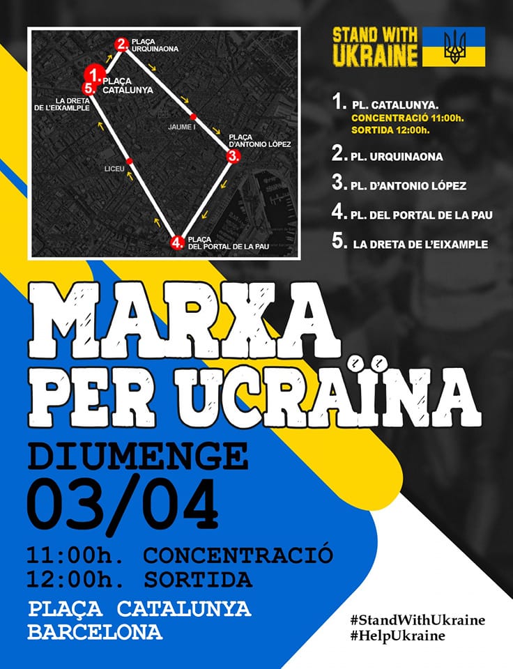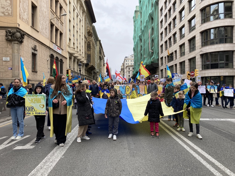 31.4.2022 в Барселоне около 300 человек участвовали в протесте против войны в Украине. Люди стали собираться около 11 часов на площади Каталонии, шествие началось после 12 часов. На Via Laetana шествие возглавили дети, которые несли украинский флаг. Были плакаты и листовки о петиции — о переименовании проспекта, на котором располагается российское консульство в Барселоне, в проспект имени Независимости Украины.