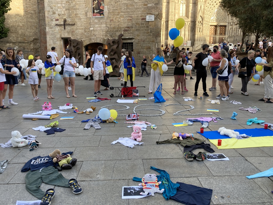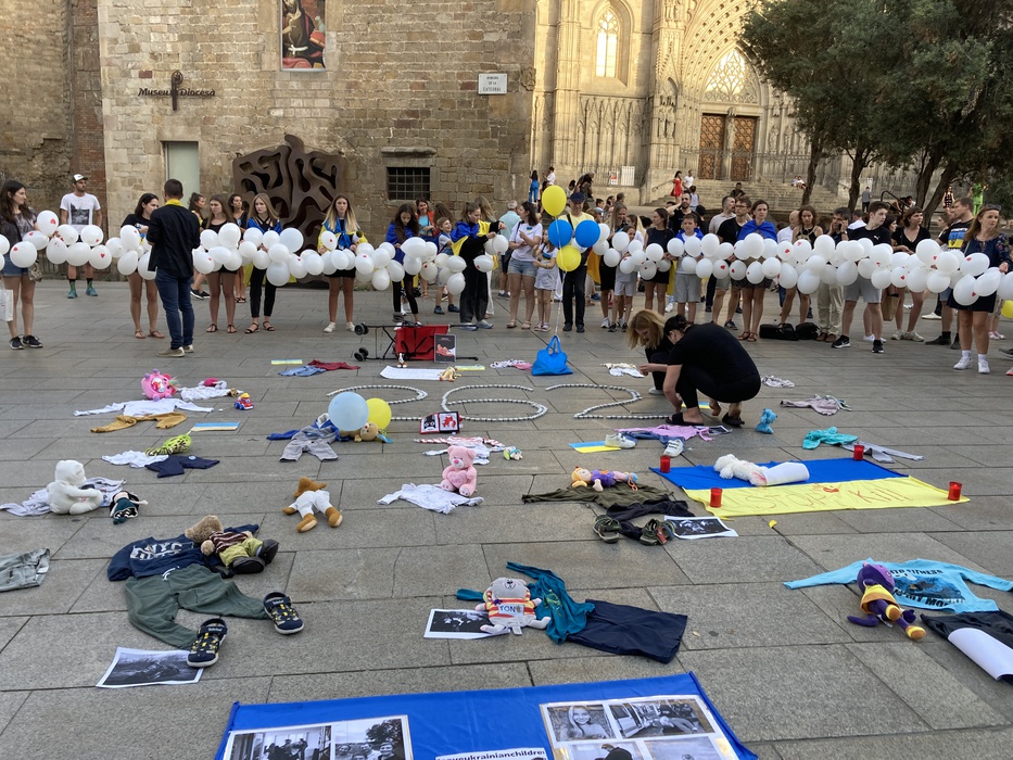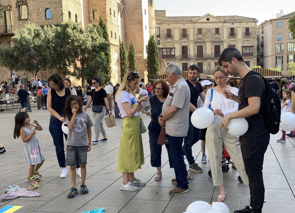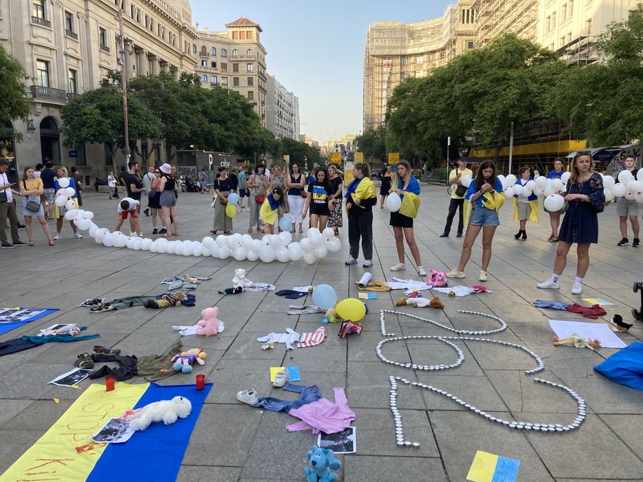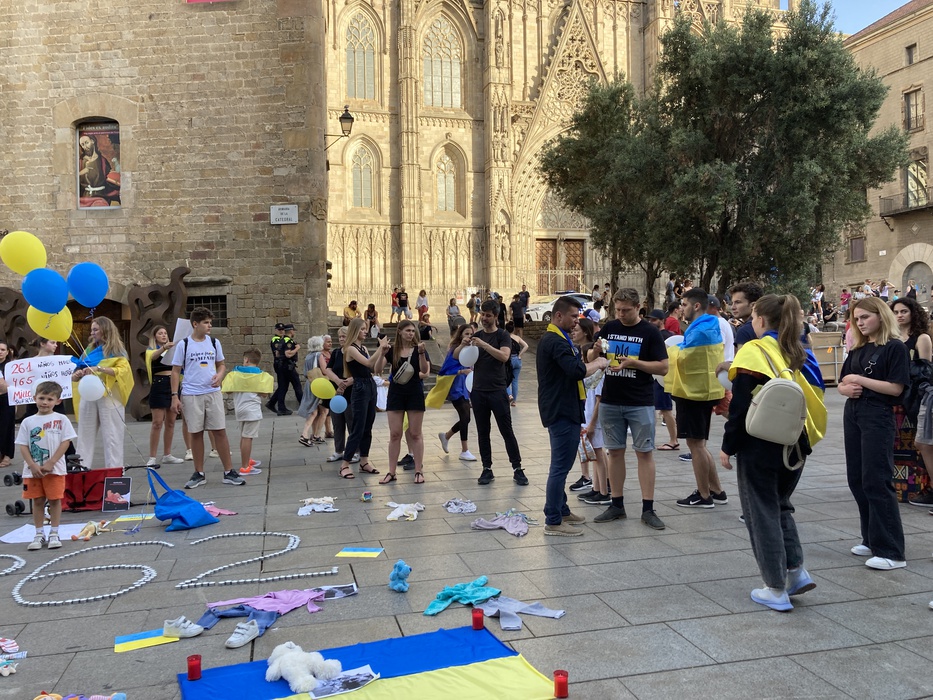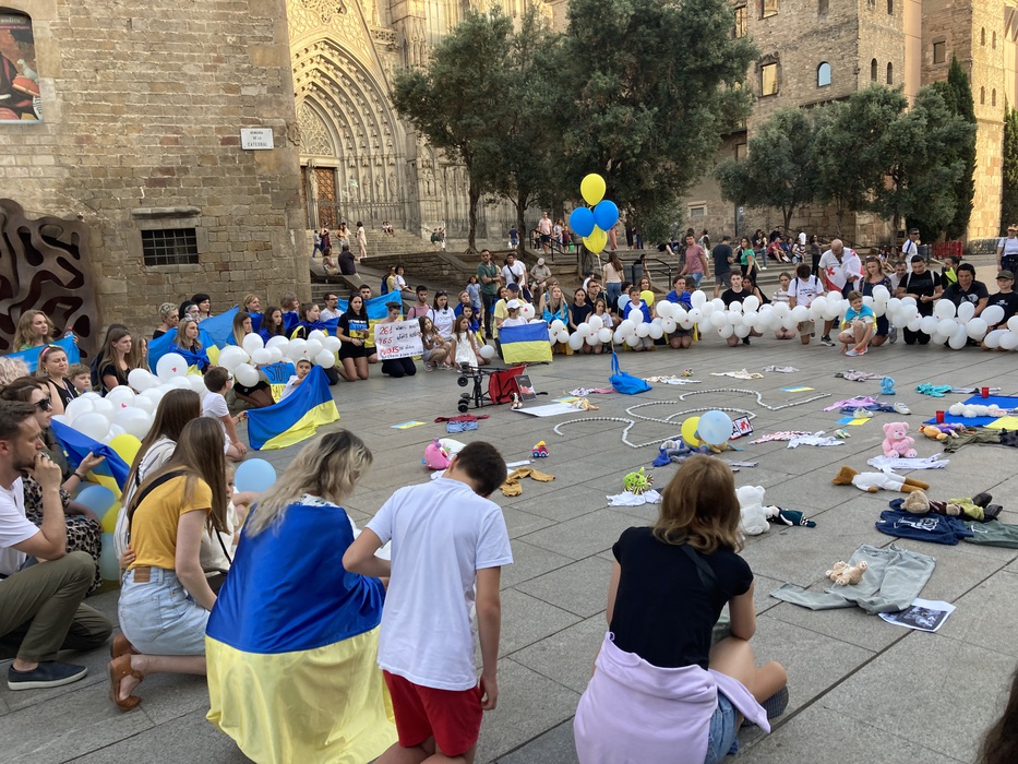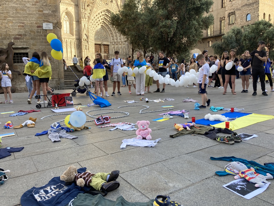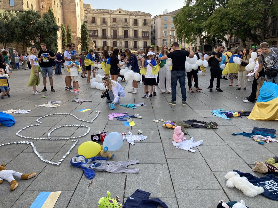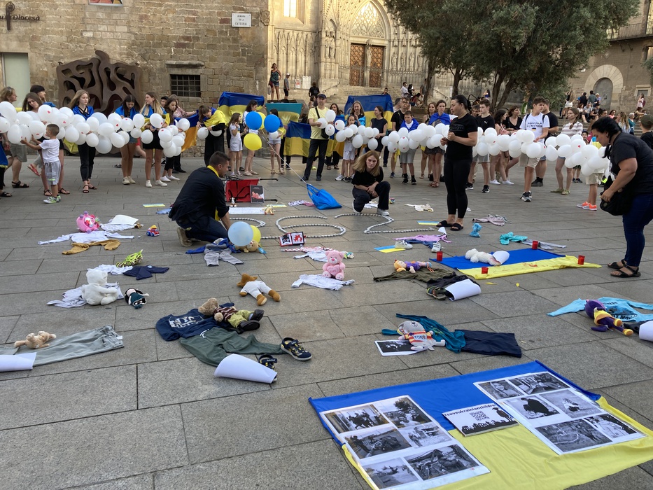 4.6.2022 на Plaça Nova в Барселоне состоялась акция памяти. Украинцы просили прохожих надувать белые шарики и затем нанизывали шарики на нитку. Каждый белый шарик символизировал убитого россиянами украинского ребенка, 262 официальных жертв войны. Эту цифру выложили из зажженных свечей. На площади были разложены детские игрушки, детская одежда, коляски, фотографии убитых детей. Люди пели песню Стефания, Гимн Украины. Ведущий мероприятие Остап Петрущак сказал: «Попрошу хвилину мовчання. За усі життя, які забрали. Особливо за 262 офіційні жертв дітей. Це наше майбутнє, і вони у нас його забирають. Кожна кулька представляє життя дитини.»