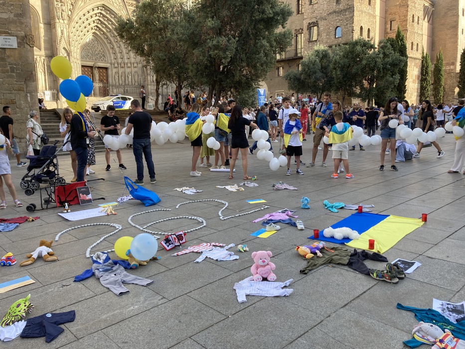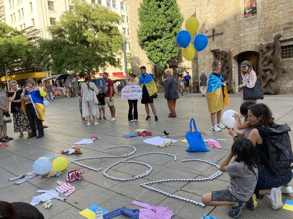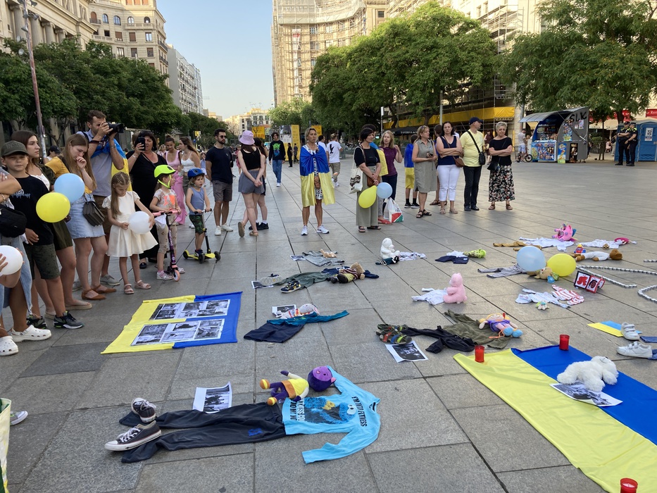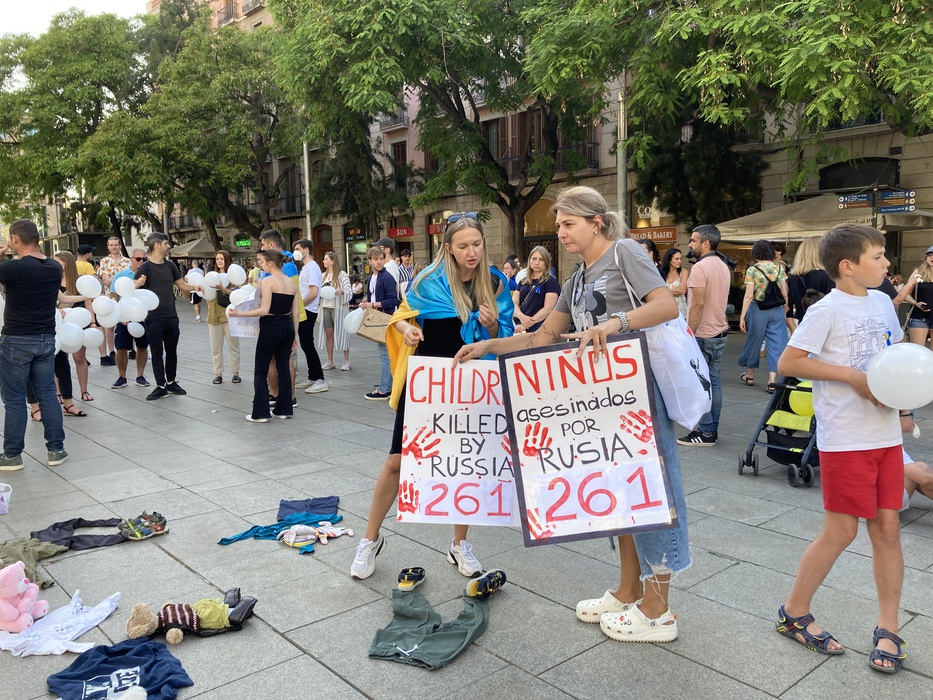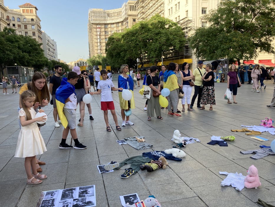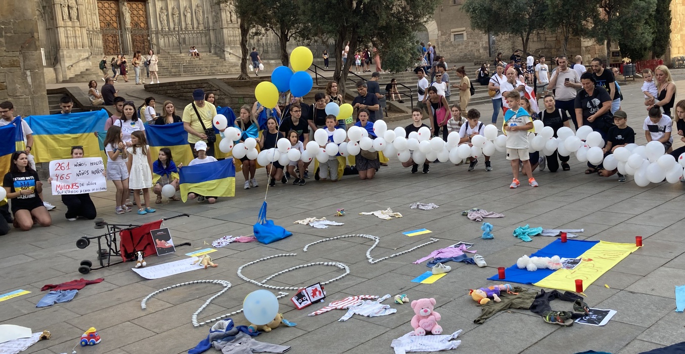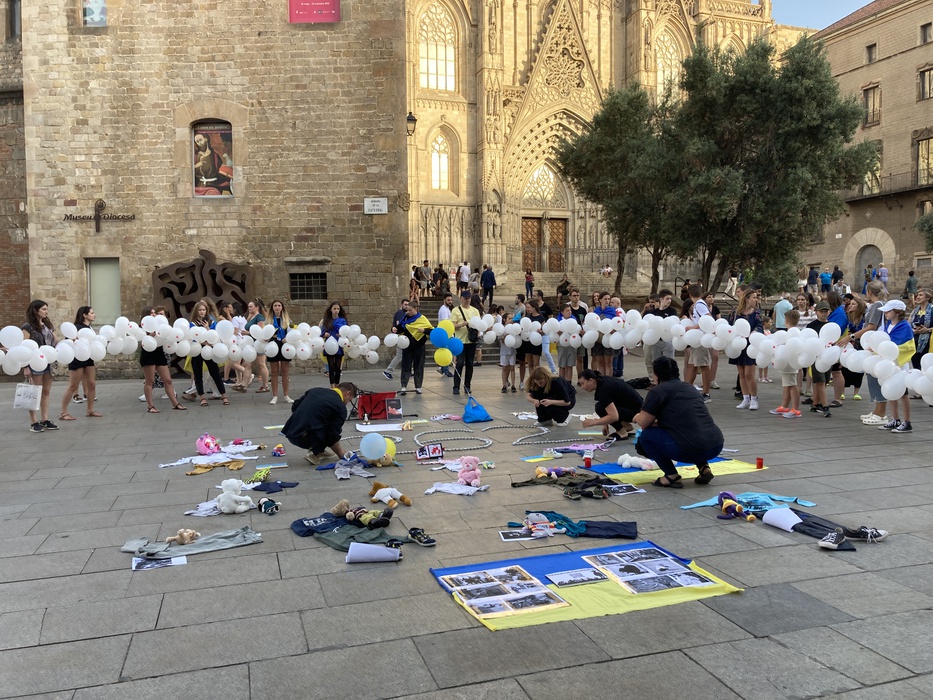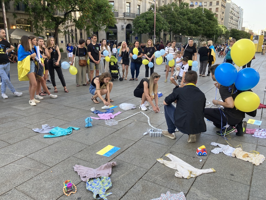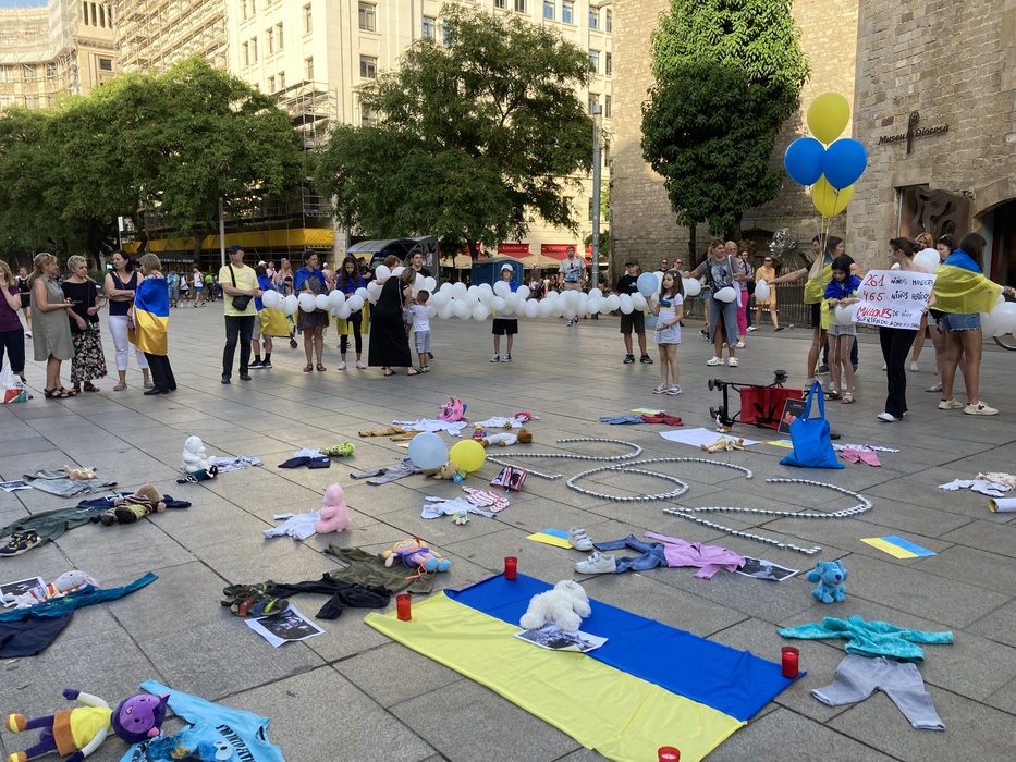 4.6.2022 на Plaça Nova в Барселоне состоялась акция памяти. Украинцы просили прохожих надувать белые шарики и затем нанизывали шарики на нитку. Каждый белый шарик символизировал убитого россиянами украинского ребенка, 262 официальных жертв войны. Эту цифру выложили из зажженных свечей. На площади были разложены детские игрушки, детская одежда, коляски, фотографии убитых детей. Люди пели песню Стефания, Гимн Украины. Ведущий мероприятие Остап Петрущак сказал: «Попрошу хвилину мовчання. За усі життя, які забрали. Особливо за 262 офіційні жертв дітей. Це наше майбутнє, і вони у нас його забирають. Кожна кулька представляє життя дитини.»