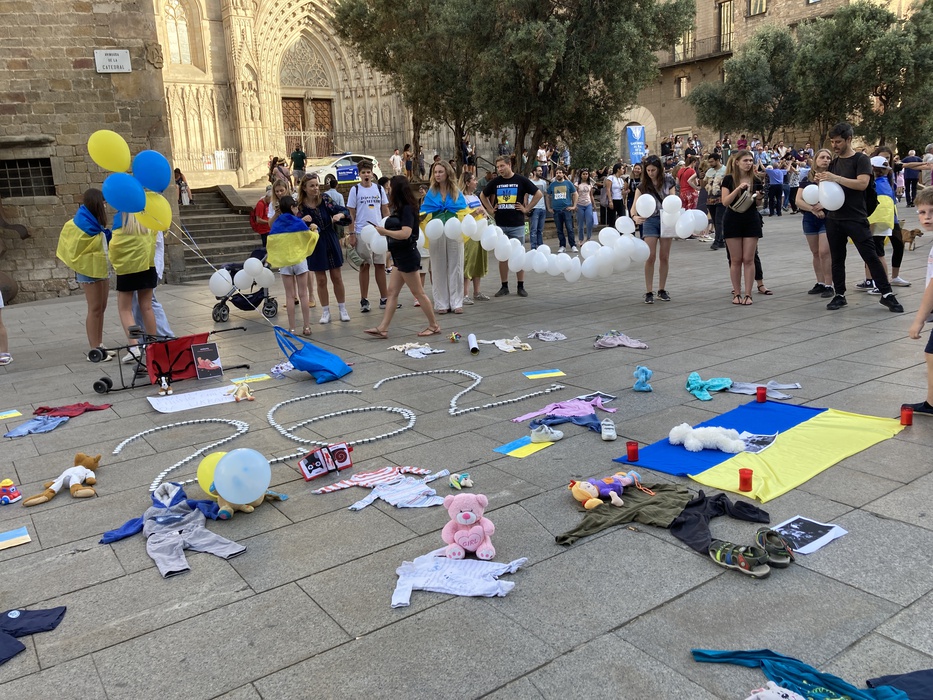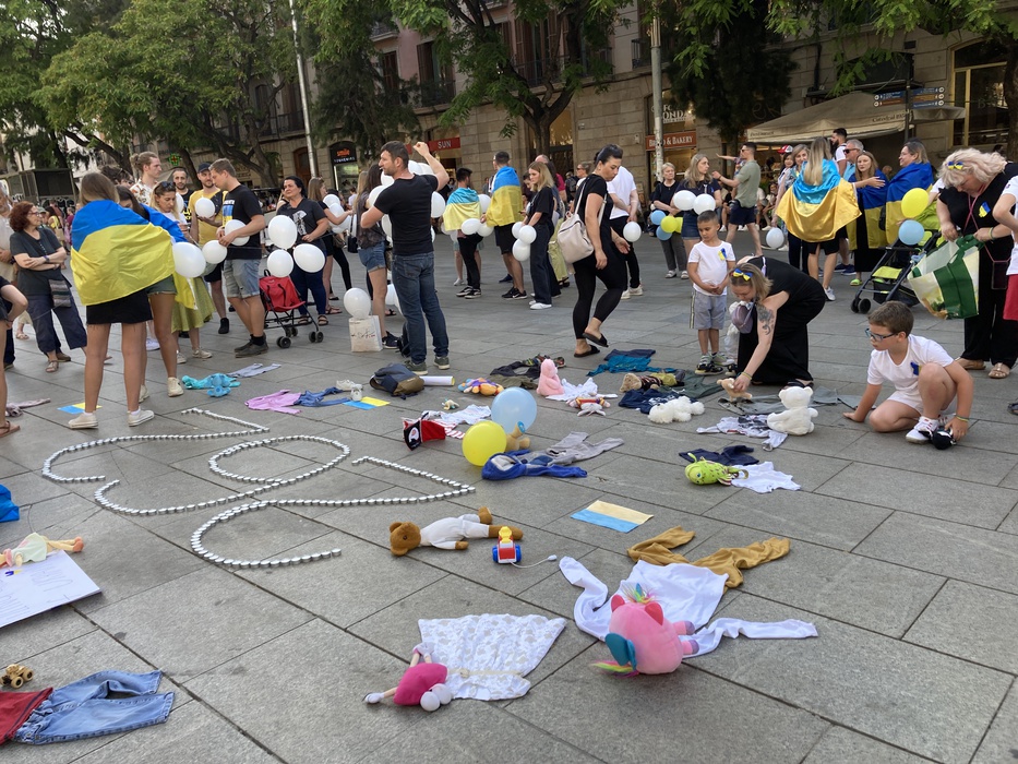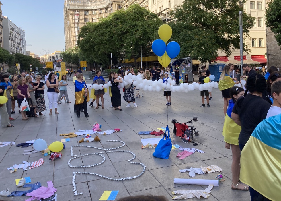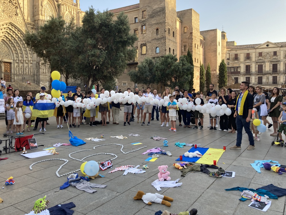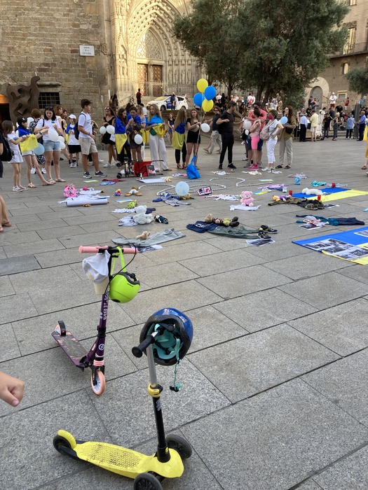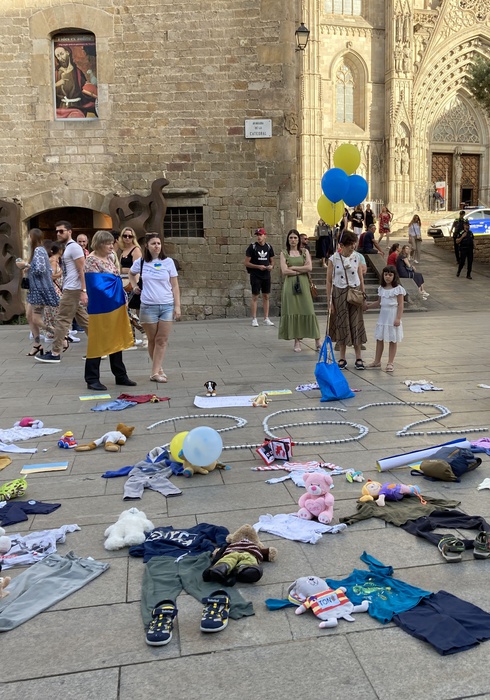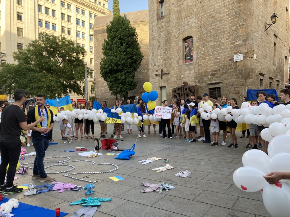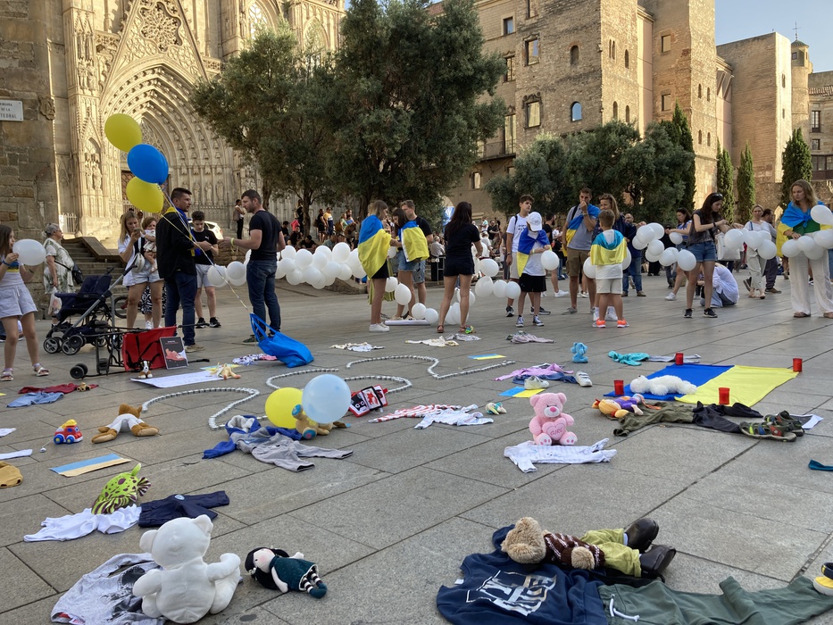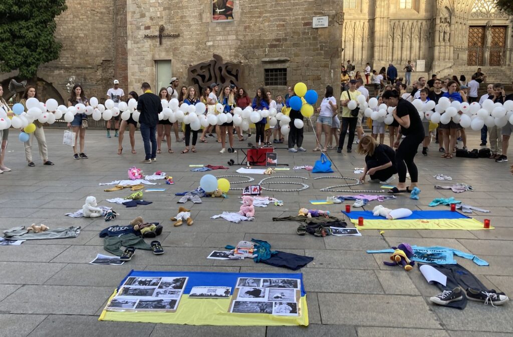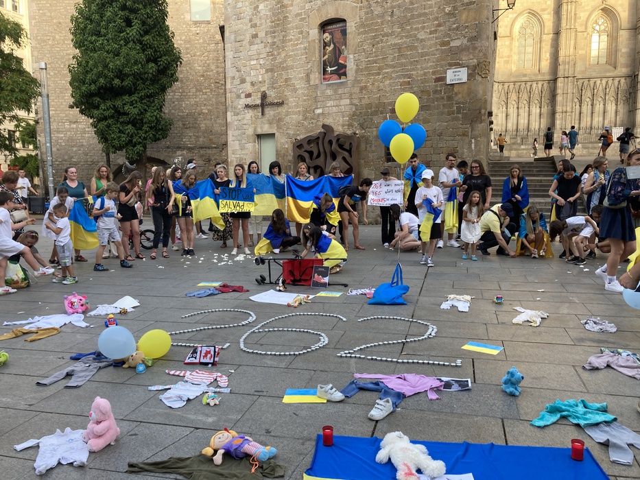 4.6.2022 на Plaça Nova в Барселоне состоялась акция памяти. Украинцы просили прохожих надувать белые шарики и затем нанизывали шарики на нитку. Каждый белый шарик символизировал убитого россиянами украинского ребенка, 262 официальных жертв войны. Эту цифру выложили из зажженных свечей. На площади были разложены детские игрушки, детская одежда, коляски, фотографии убитых детей. Люди пели песню Стефания, Гимн Украины. Ведущий мероприятие Остап Петрущак сказал: «Попрошу хвилину мовчання. За усі життя, які забрали. Особливо за 262 офіційні жертв дітей. Це наше майбутнє, і вони у нас його забирають. Кожна кулька представляє життя дитини.»