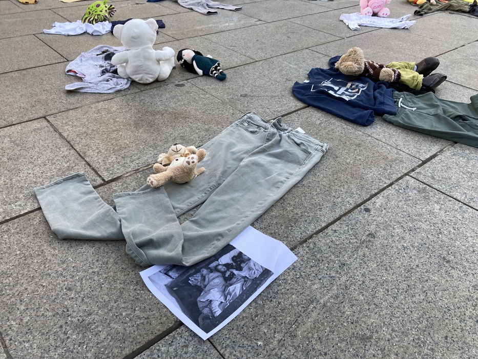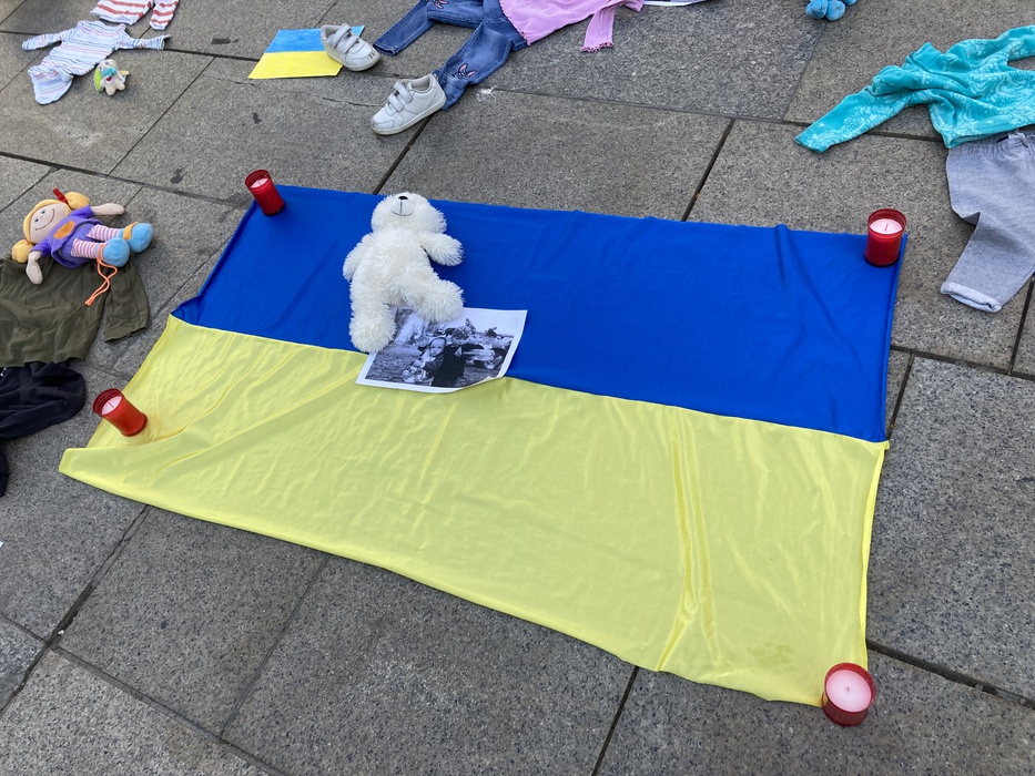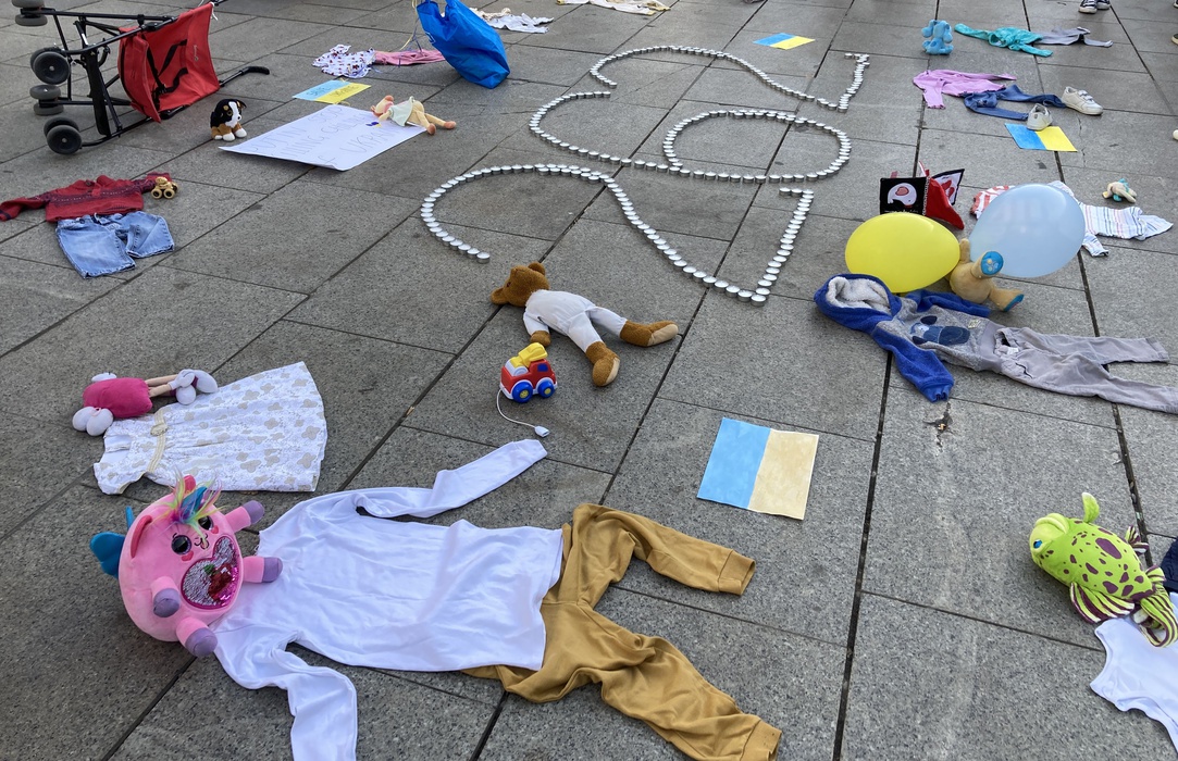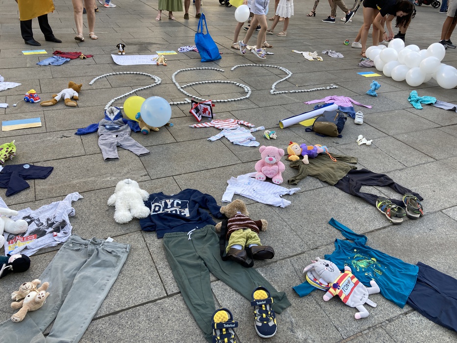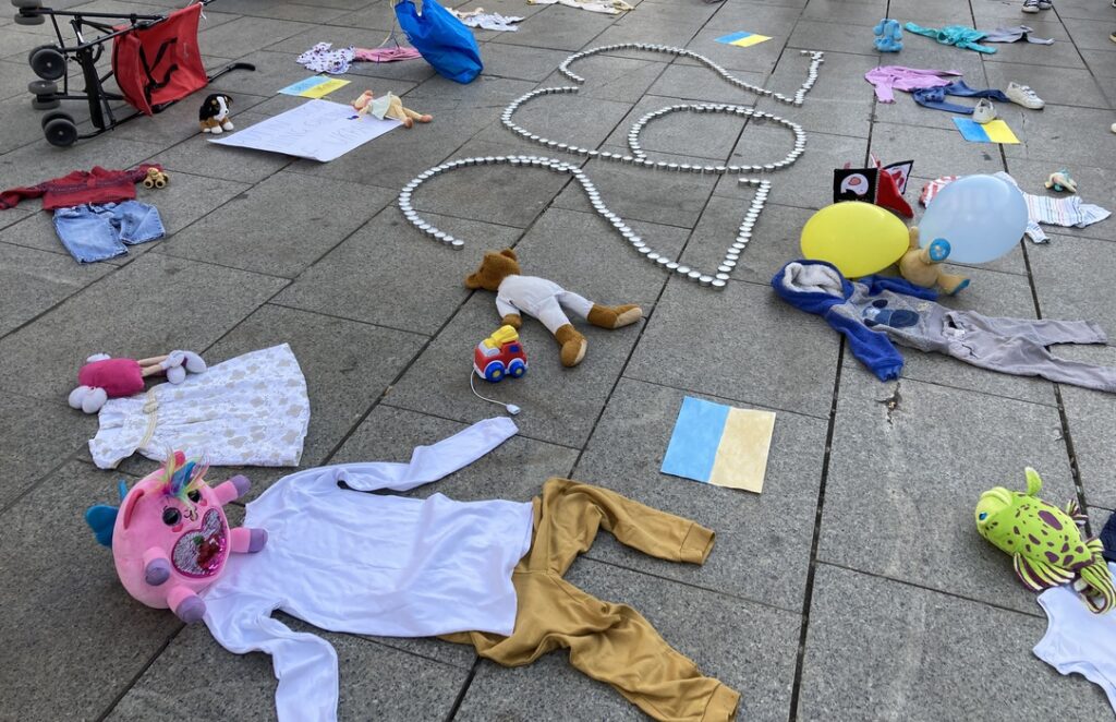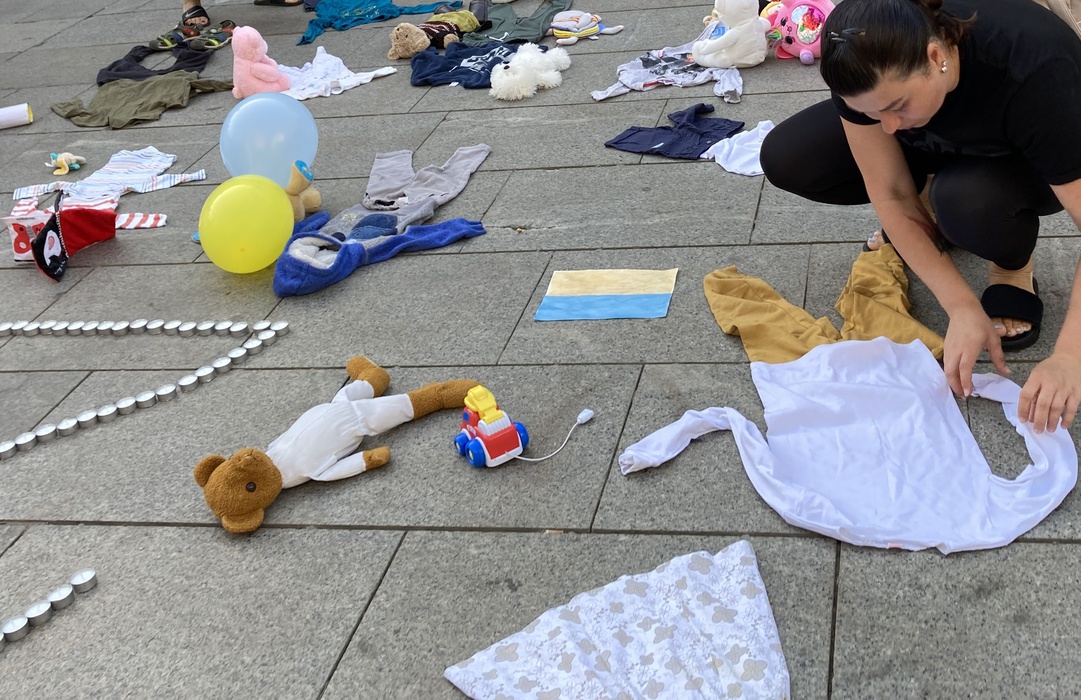 The number “262”, representing the total known child victims of war in its first 100 days, was formed out of burning candles. Children’s toys, clothes, pushchairs and photographs of the victims were also laid out in the square. Attendees sang hymns and shared a minute of silence.