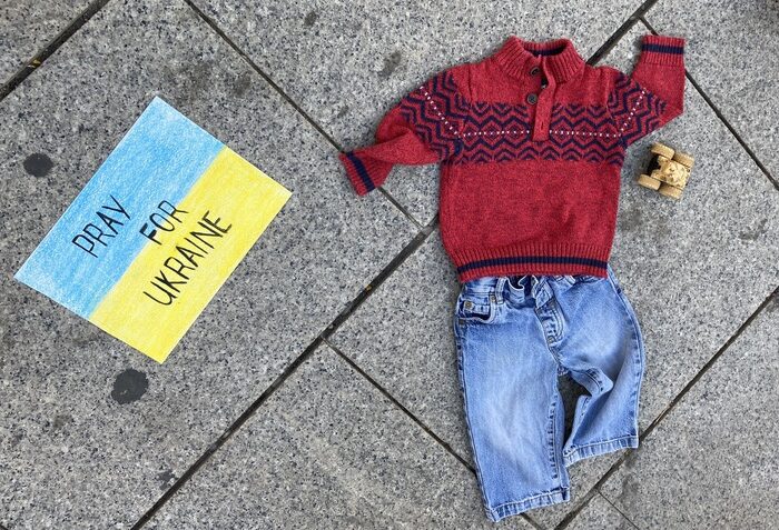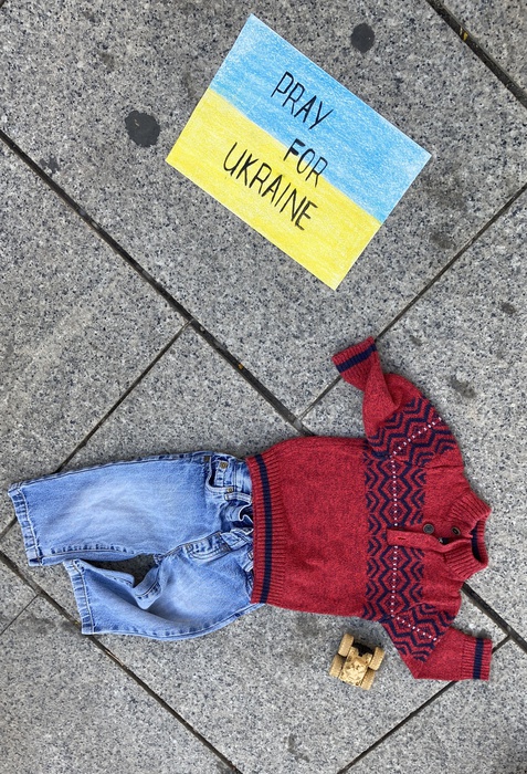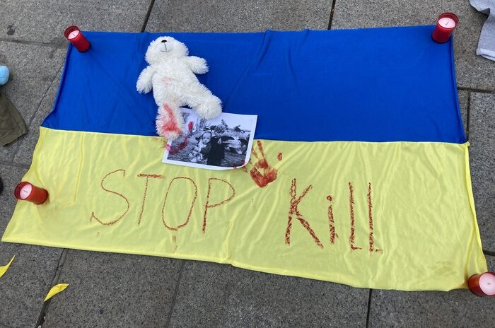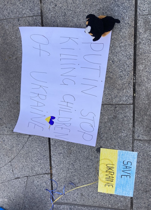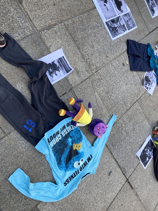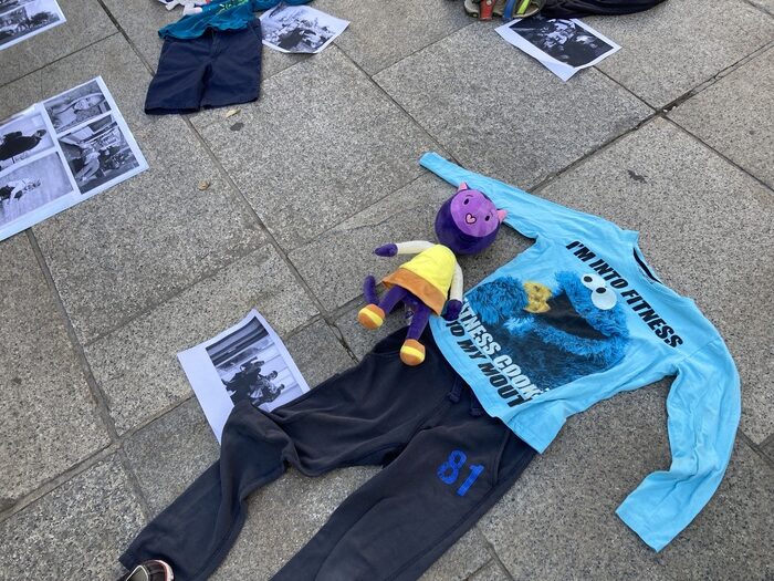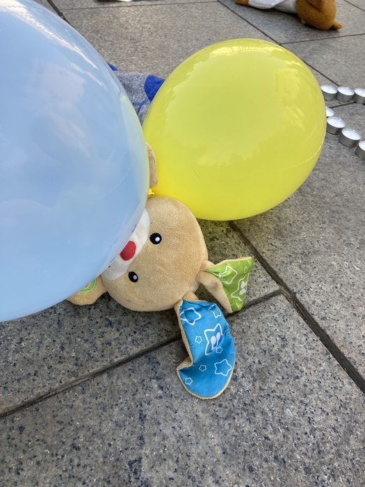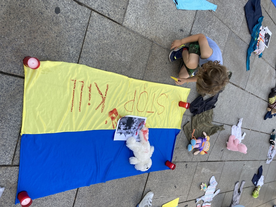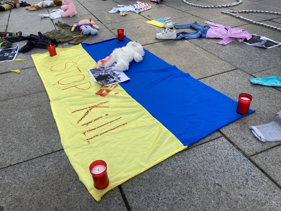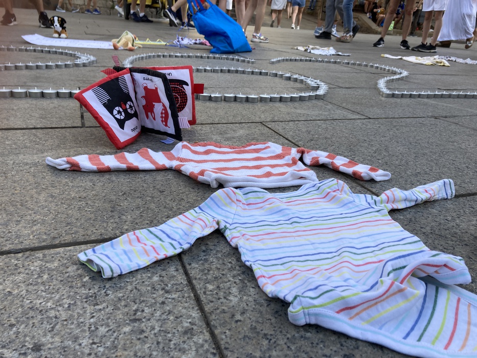 The number “262”, representing the total known child victims of war in its first 100 days, was formed out of burning candles. Children’s toys, clothes, pushchairs and photographs of the victims were also laid out in the square. Attendees sang hymns and shared a minute of silence.