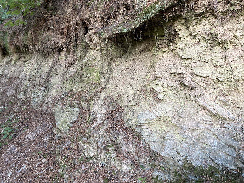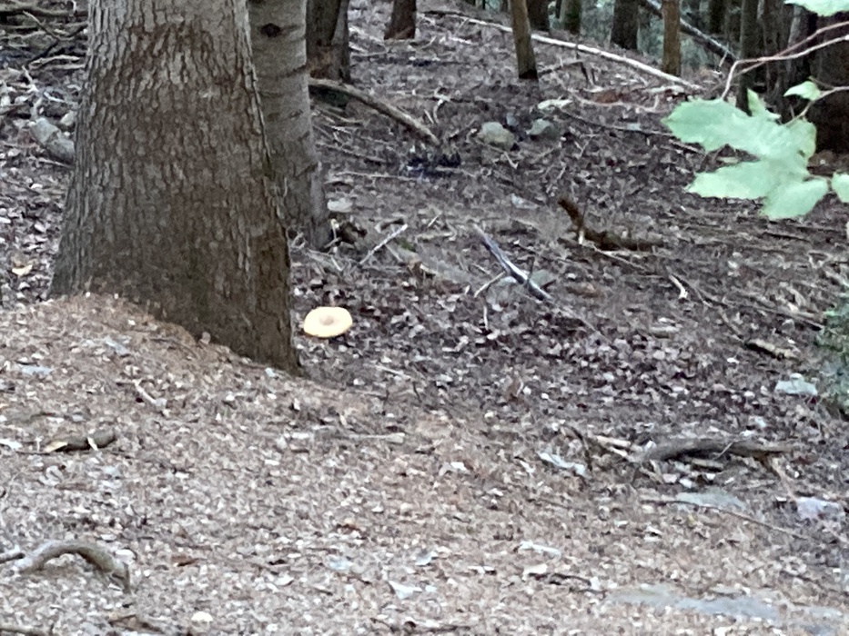 Пошла по дороге направо, за двумя туристами, через посёлок и вверх. Грунтовка шла вдоль горы и чтобы собирать грибы надо было забираться на гору вверх или вниз. Примерный угол был 30-50 градусов. Вот я увидела гриб и показываю на него ножом: