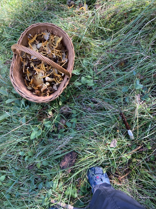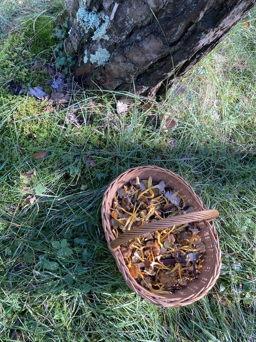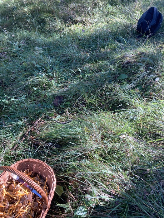 На этой фотографии видно всё расстояние, которое я прошла — от рюкзака до собранной корзинки. Я планировала ехать на поезде через два часа, на 16:00. А было 13:00, корзинка была не с верхом, но на два часа её точно бы не хватило. Надо было очень быстро возвращаться на станцию, поэтому я ушла, оставив остальные грибы — класть их было некуда.