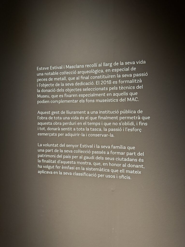 5 марта в 2024 году в #MACarcheologia при участии директора музея Jusèp Boya, Sònia Hernández, гендиректора Patrimoni.gencat, Àngels Casanovas, которая является музеологом и куратором выставки, Esteve Estival Yani (сын дарителя) и 90 посетителей открылась выставка даров Esteve Estival музею. 143 старинных предмета (2 000 д.н.э.- 16 век н.э.) были распределены между тематическими стендами и соотнесены с современными ситуациями, в которых используется нечто похожее. Выставка продлится до 2 июня 2024 года.