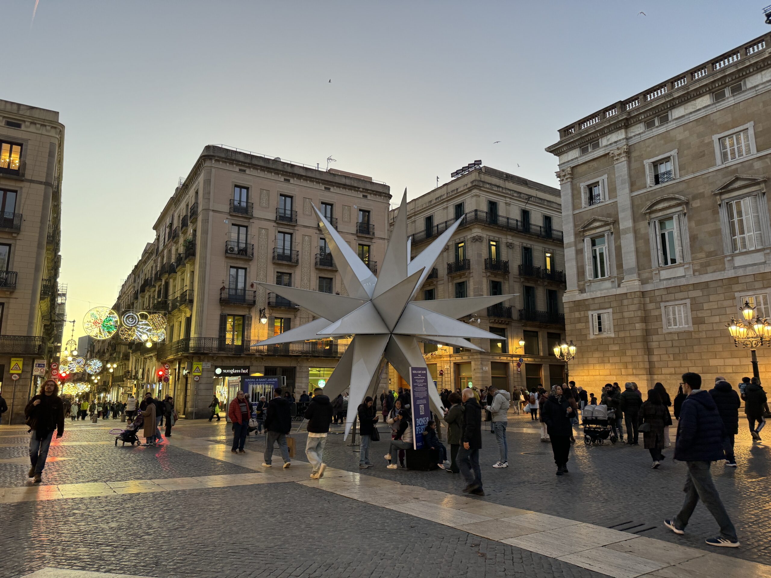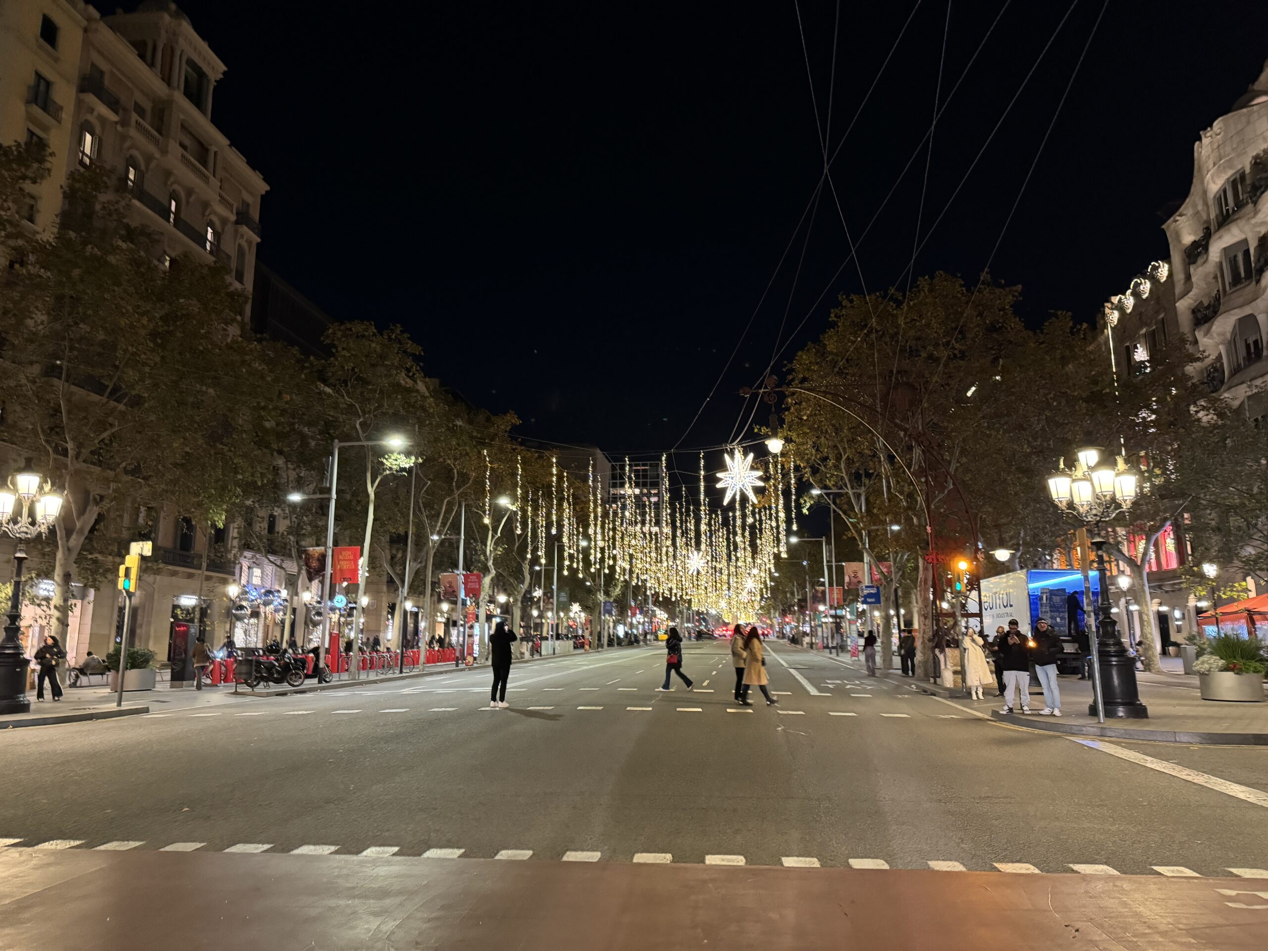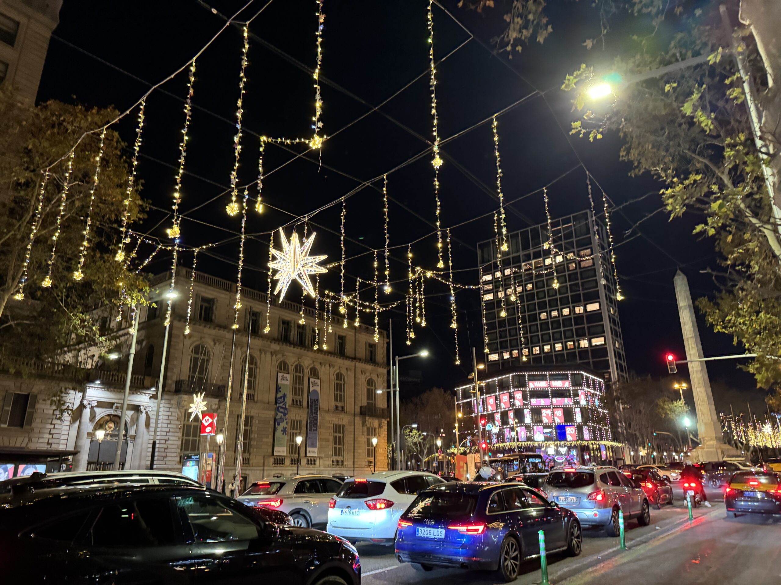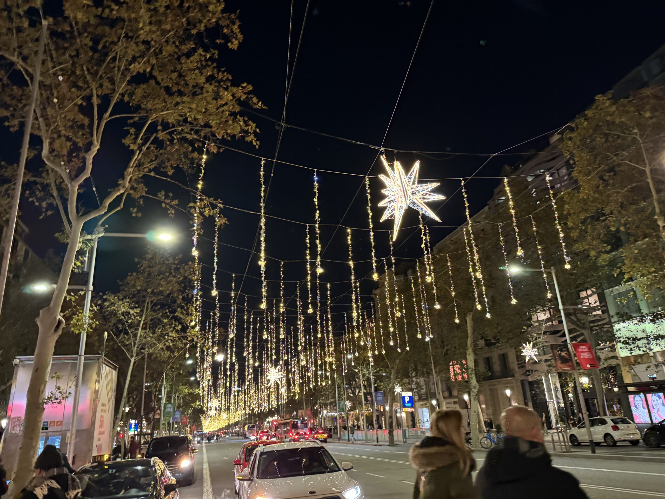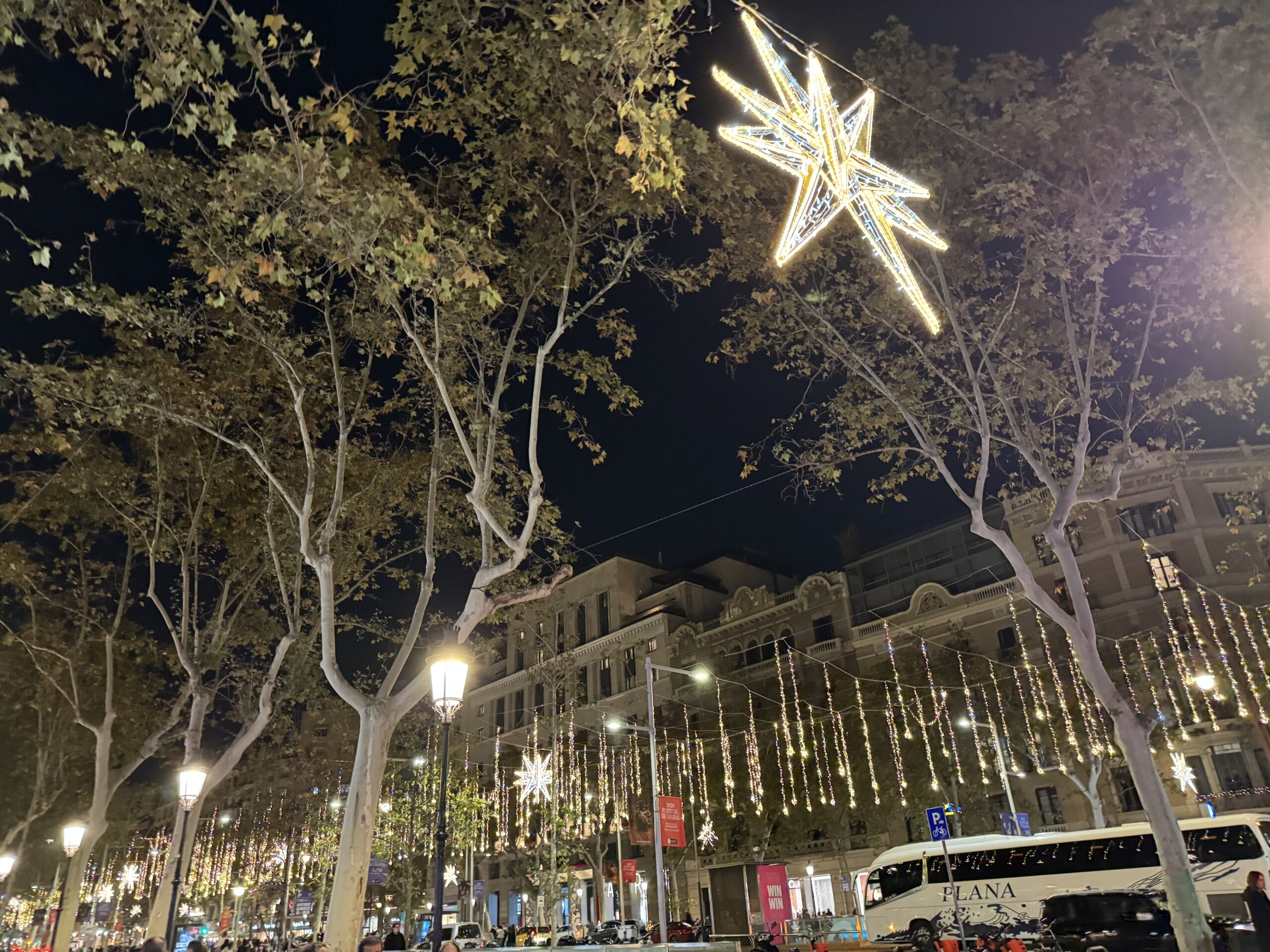 Последний, если я правильно поняла, год конкретно этих украшений на Пасеч де Грасия. В прошлом году ещё оставались бабочки, в этом их заменили звёздами в стиле новой звезды Саграды.