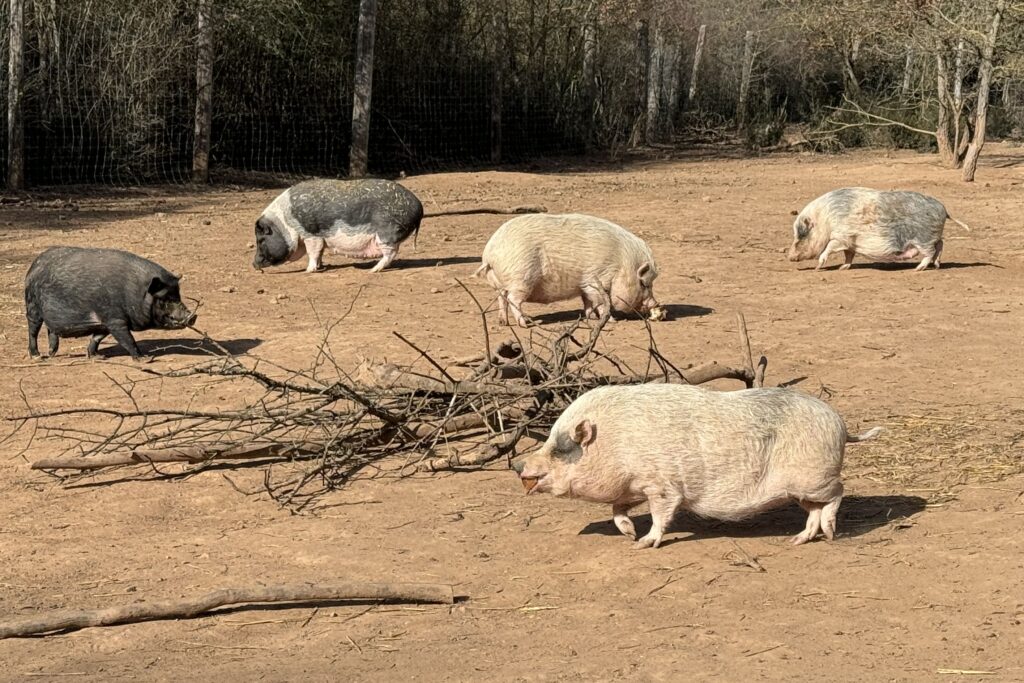 Одомашненные и дикие животные живут в разных частях заповедника. Есть зоны для адаптации вновь прибывших. Это зона диких кабанов: