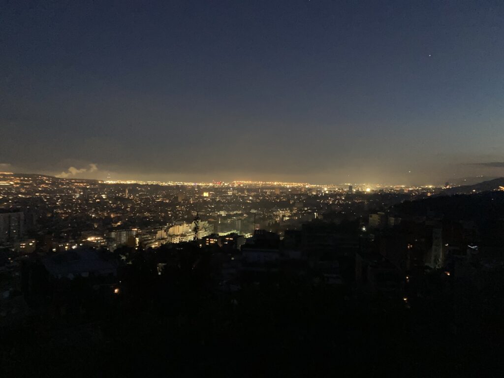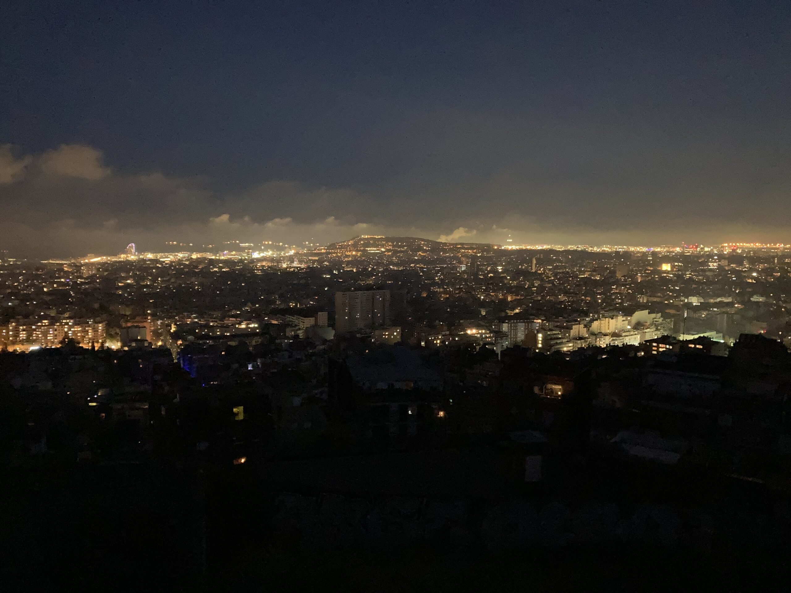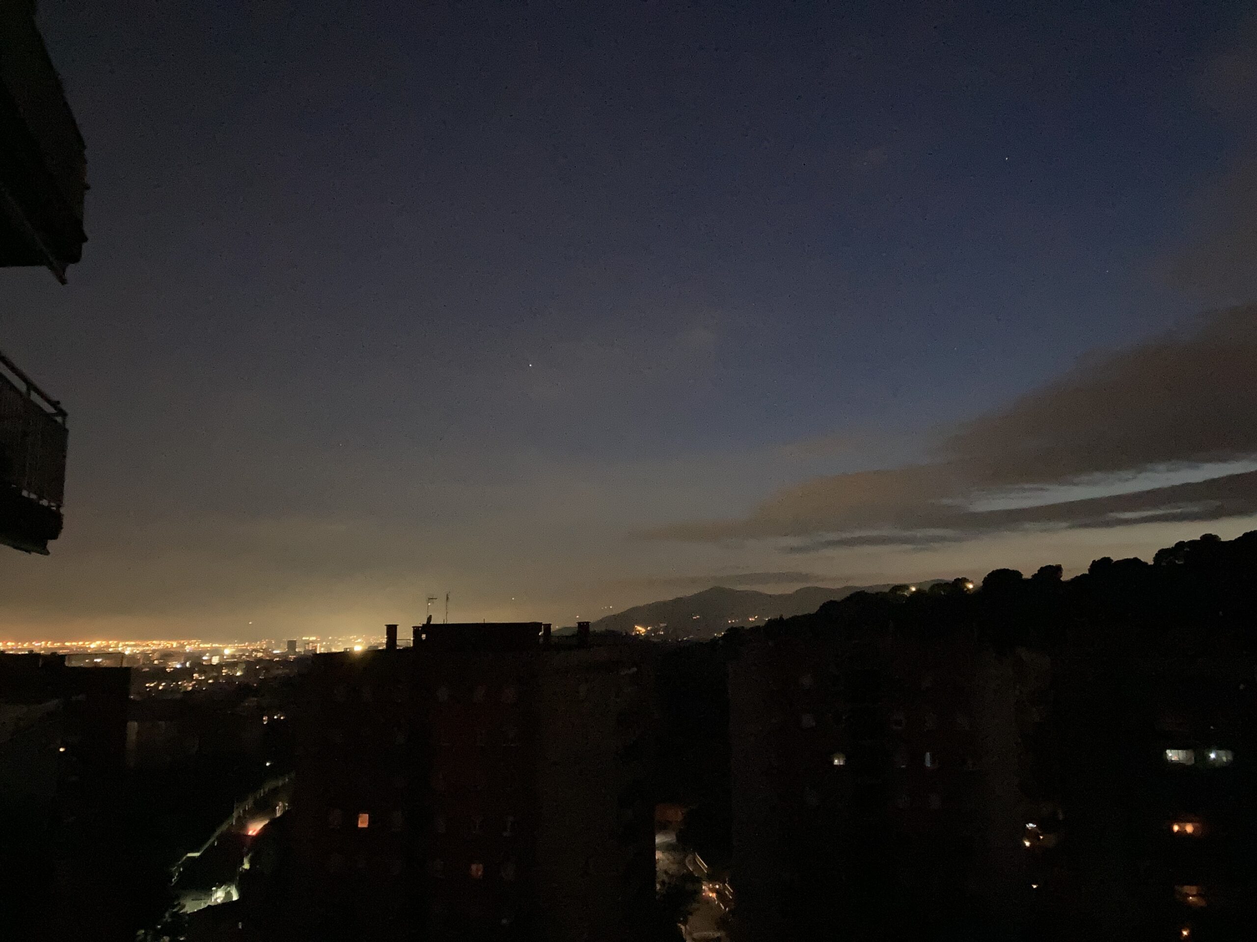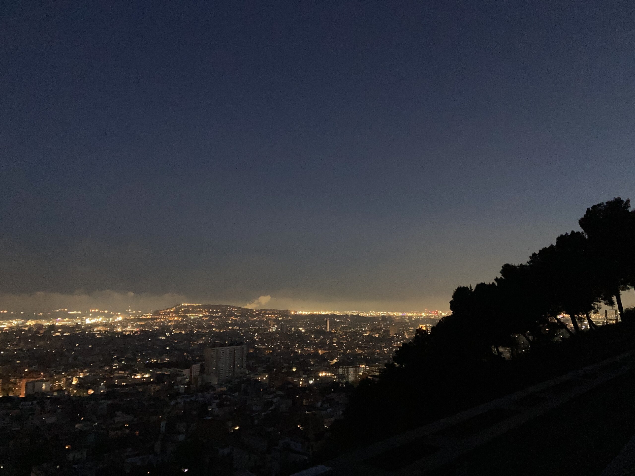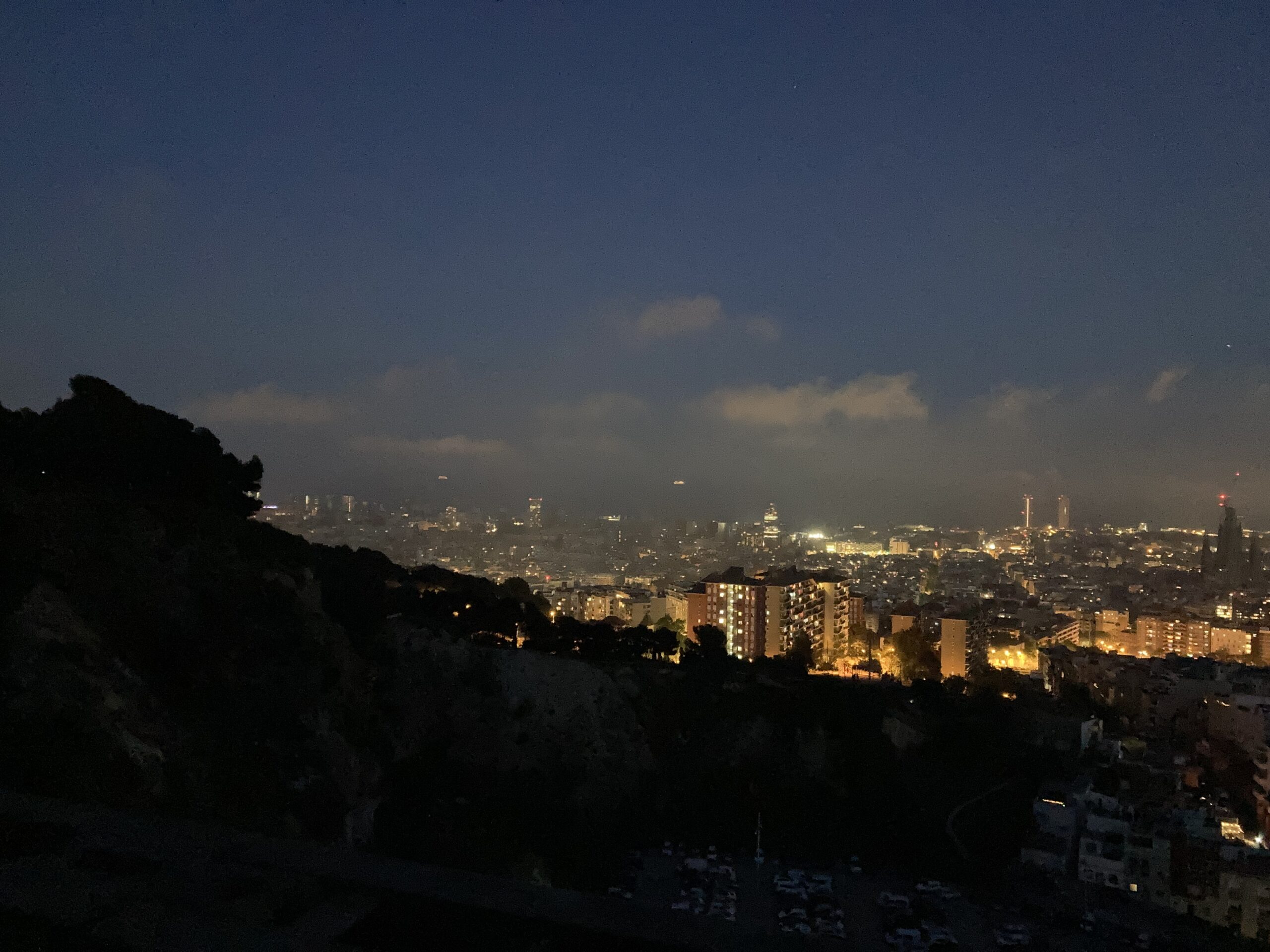 Вчерашние фото с барселонского бункера, сделанные с 21:15 до 21:30. Фонари уже работали, началось подключение домов. Кварталы на горе подключали еще через 3-4 часа. Дома, на которых установлены солнечные батареи, всё равно оставались без электричества. Во дворах неосвещенных районов жгли костры.
