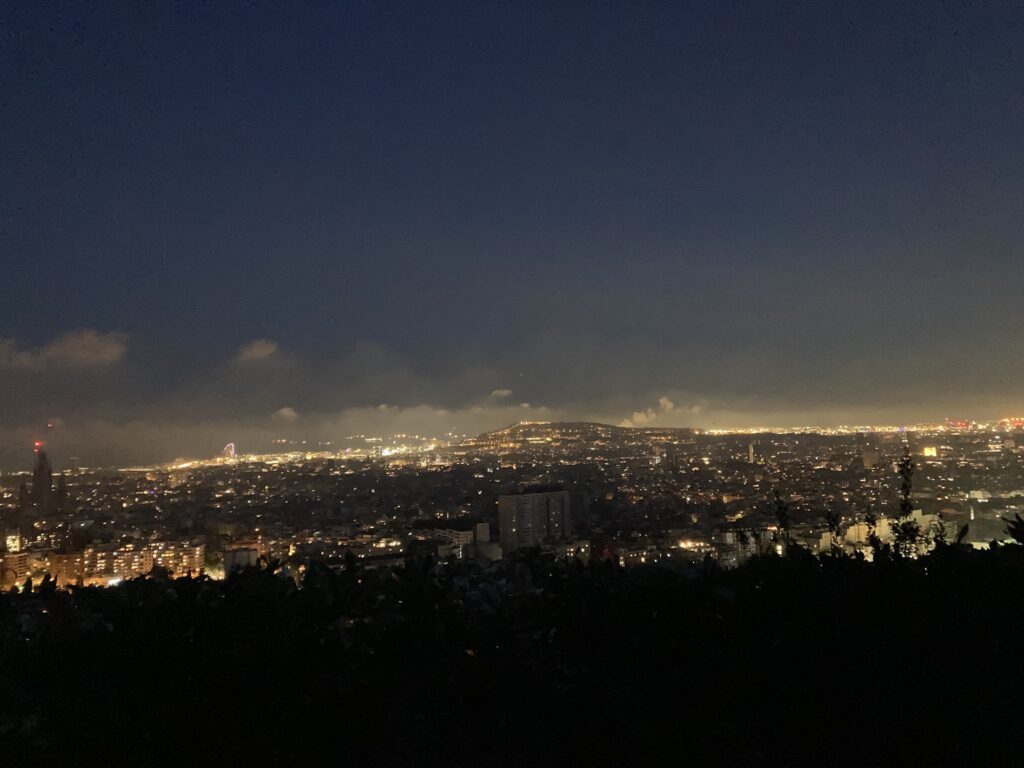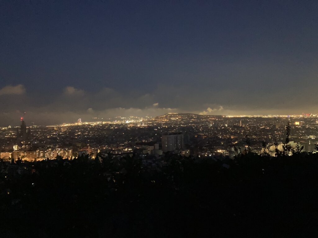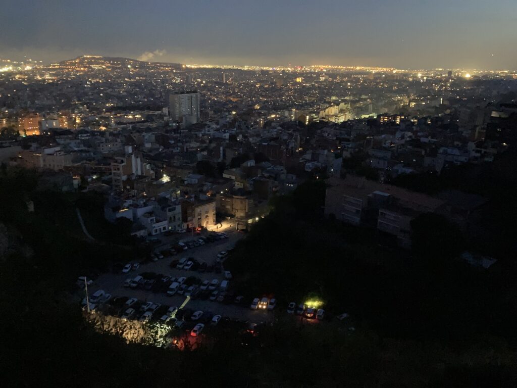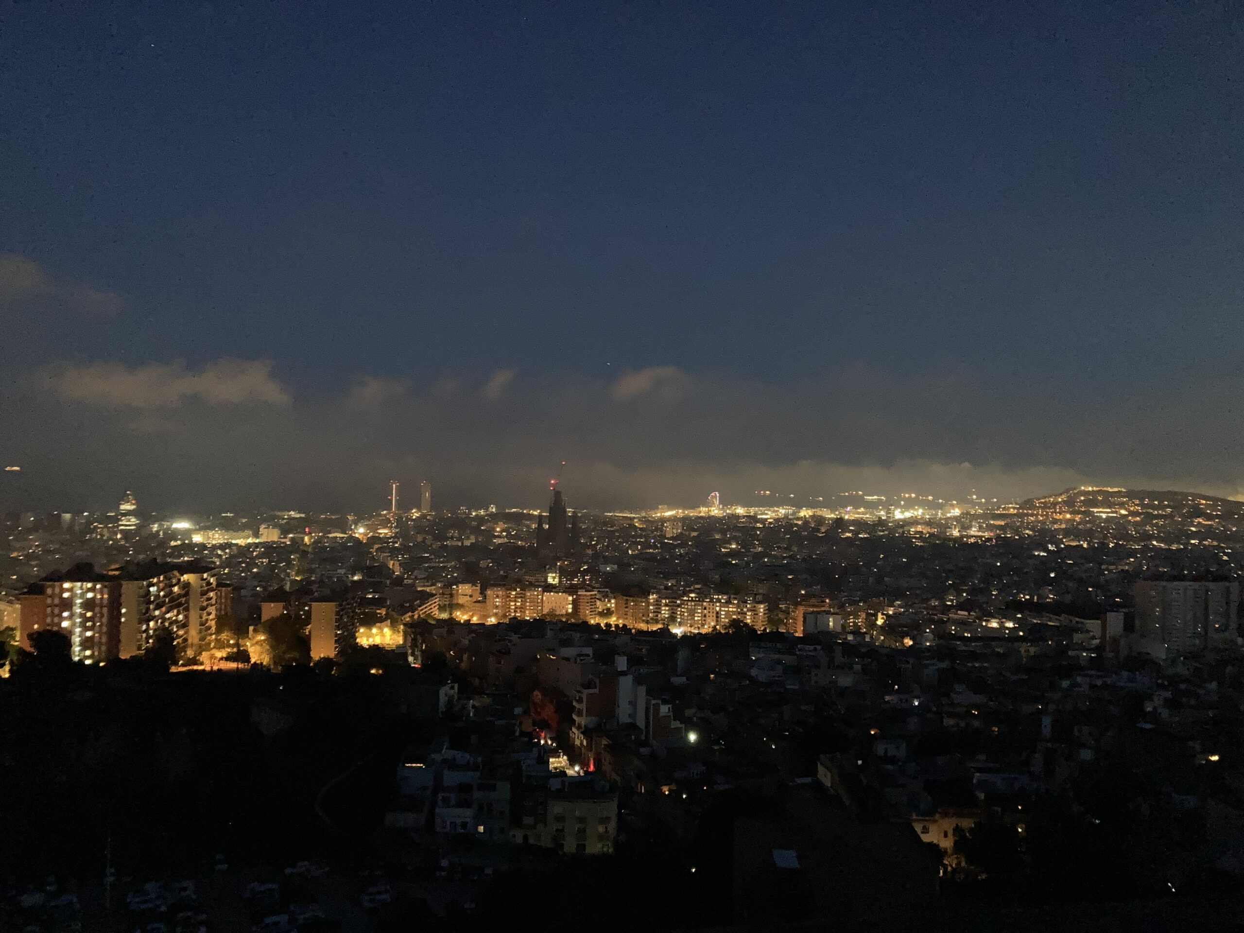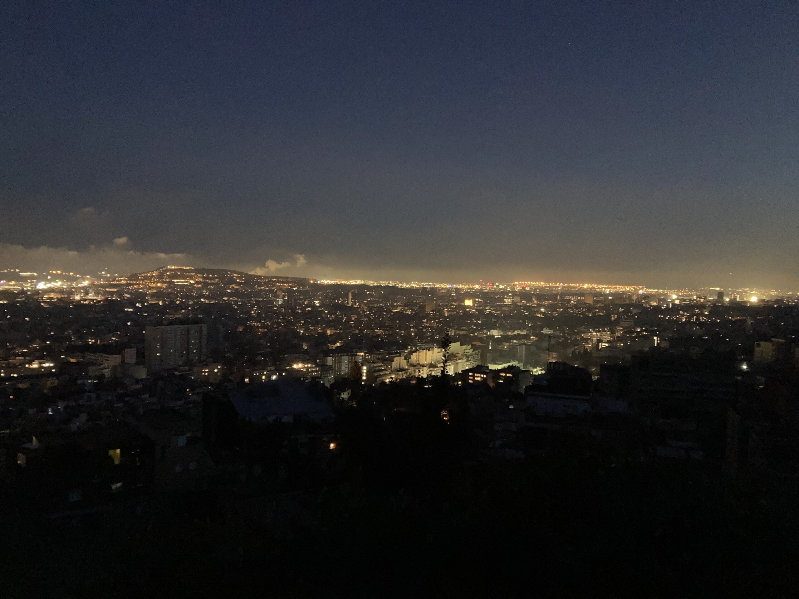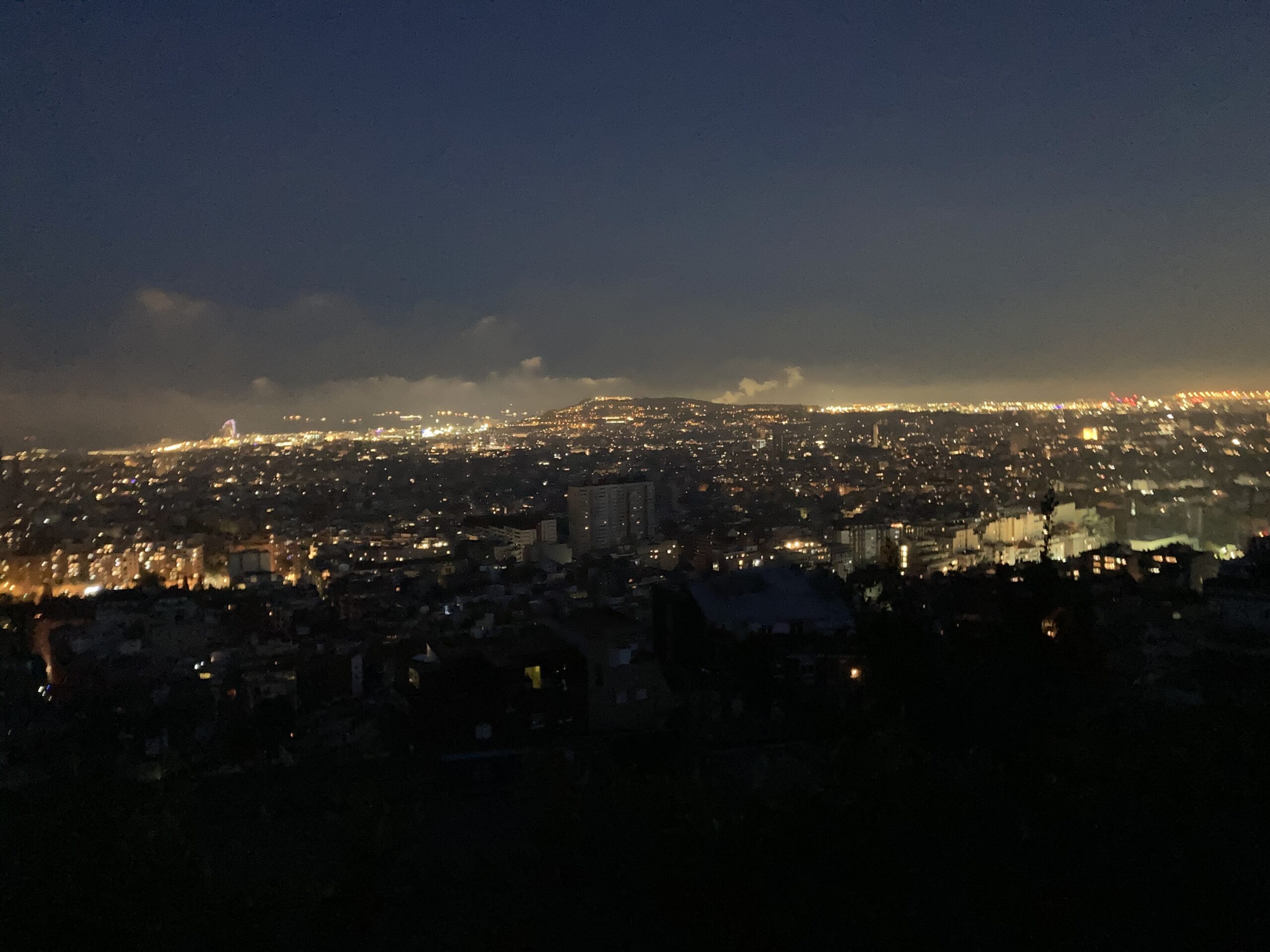 Вчерашние фото с барселонского бункера, сделанные с 21:15 до 21:30. Фонари уже работали, началось подключение домов. Кварталы на горе подключали еще через 3-4 часа. Дома, на которых установлены солнечные батареи, всё равно оставались без электричества. Во дворах неосвещенных районов жгли костры.