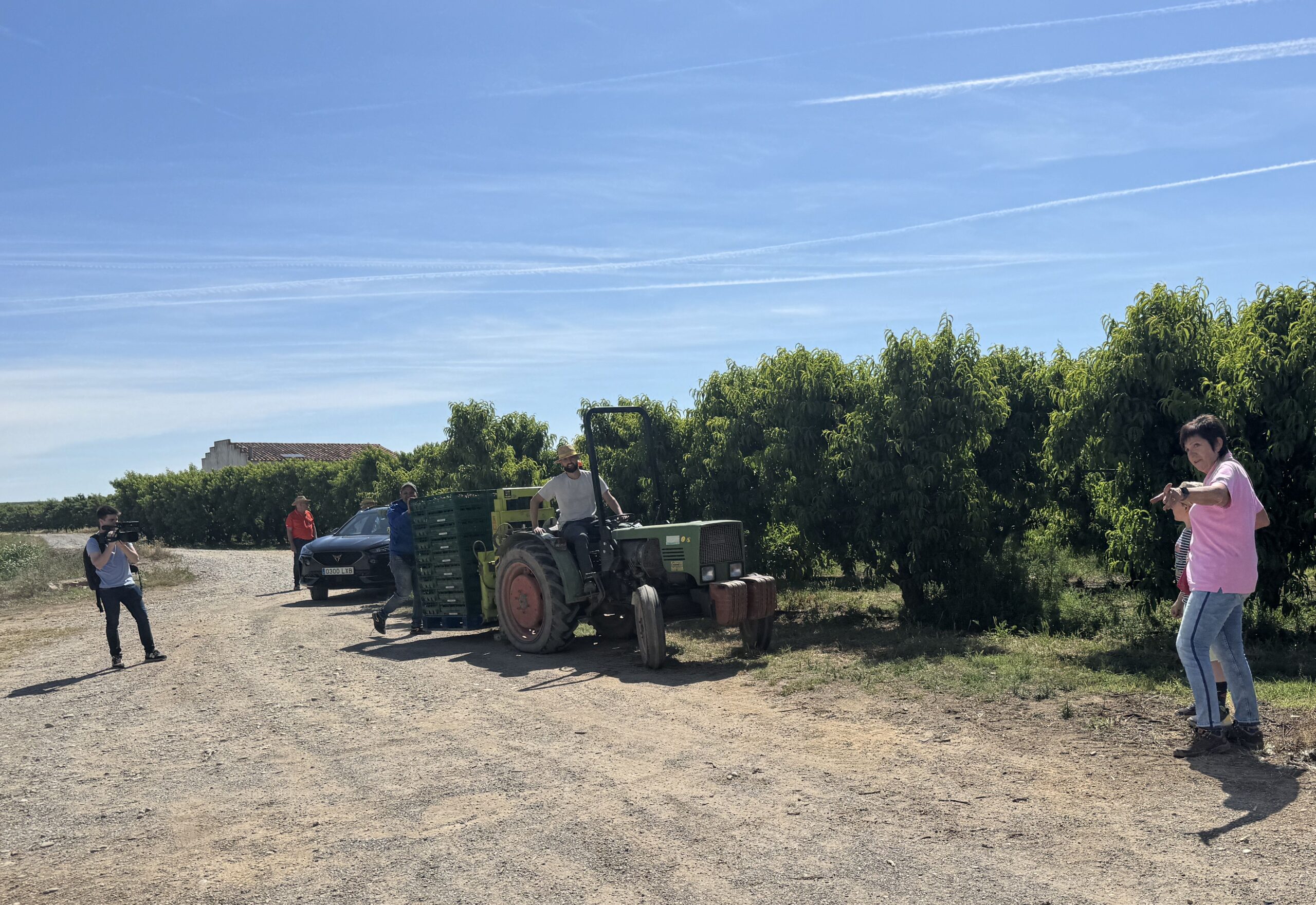 Magda Montagut показывает малышу трактор, перевозящий ящики с черешней: