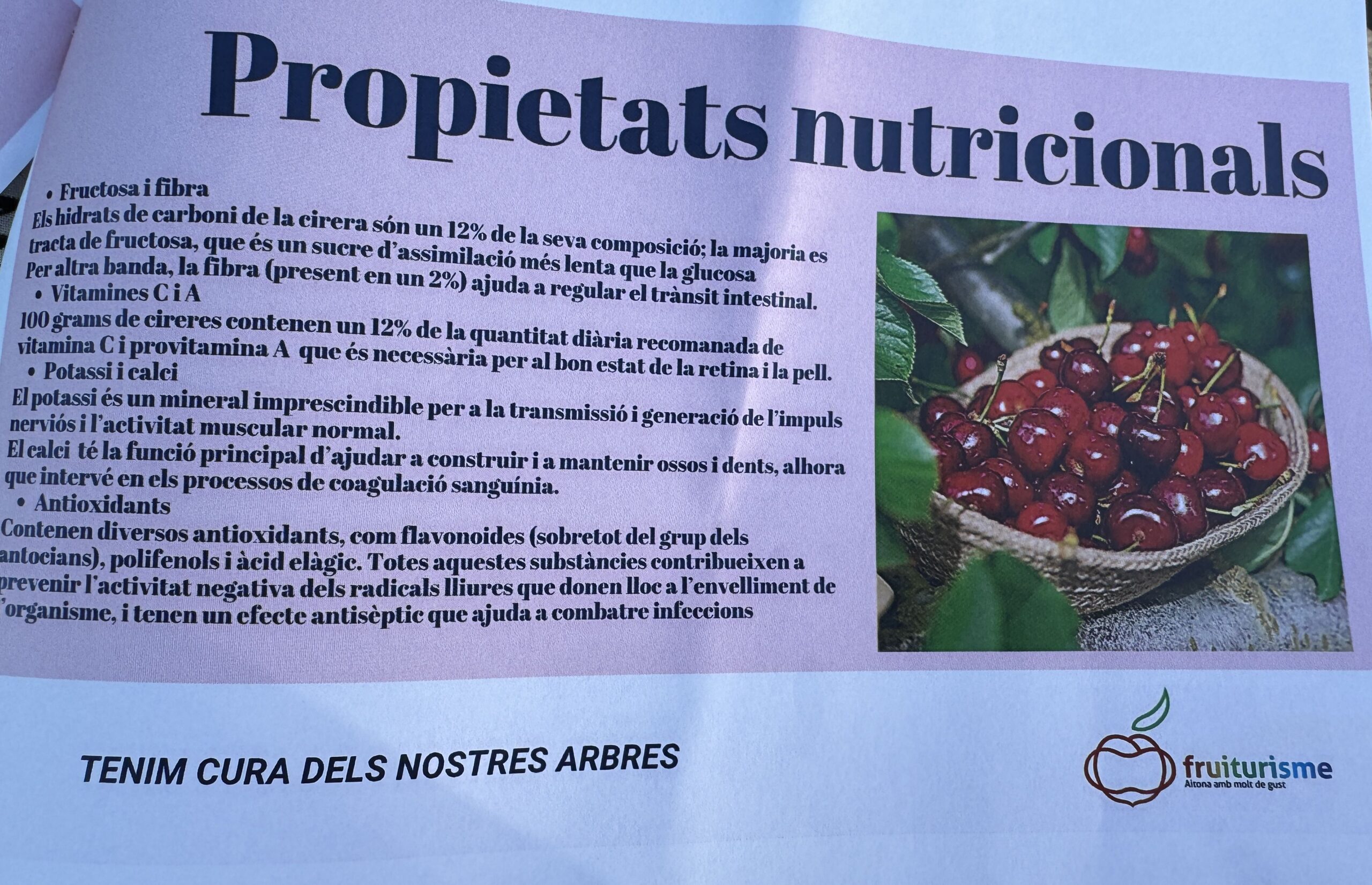 «Unos 70 turistas pagan 50 euros por recoger de los árboles 5 kilos de cerezas en Aitona«: «Первые 35 человек прибыли вчера. В сопровождении фермера они смогли собрать до пяти килограммов черешни на человека за 50 евро. В эту цену входил вермут на двоих: Vermut Polvorí de Raimat с местными продуктами, такими как сыр, секальона и шоколад, среди прочего. Ожидается, что еще 35 человек повторят опыт сбора черешни прямо с дерева с помощью фермера сегодня. Всего за выходные ожидается сбор 100 килограммов. Эта инициатива, продвигаемая городским советом Айтона, направлена на продвижение местного потребления без посредников и на то, чтобы познакомить посетителей с сельскохозяйственной культурой муниципалитета. Заместитель мэра Жорди Видал объяснил удовлетворение от «предложения этих впечатлений посетителям, которые затем обеспечивают продолжение мероприятий в период цветения и добавляют возможность собирать персики в садах в июне». Fruiturismo (Фруктовый туризм) был запущен более десяти лет назад, сосредоточившись на сезоне цветения фруктовых деревьев и предлагая маршруты по розовым полям. Aitona en Fruita (Айтона во фруктах) началась в 2019 году со сбора персиков, нектаринов и плоских персиков, а в прошлом году также была представлена черешня — фрукт, высоко ценимый как за свое качество, так и за свою связь с традициями региона. В этом году кампания началась 15 дней назад со сбора абрикосов. Fruiturismo (фруктовый туризм) продолжится такими мероприятиями, как сбор инжира и грецкого ореха, запланированный на сентябрь и октябрь. Более 20 000 человек смогли насладиться цветущими полями в марте, с мероприятиями, которые сочетали красоту ландшафта с продвижением гастрономического, сельскохозяйственного и туристического секторов муниципалитета. В этом году фестиваль Fruiturisme добавил Aitona, розовую мечту, первый ночной опыт и первую агропродовольственную ярмарку.»
