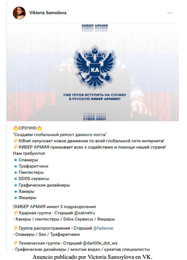Ниже приводится объявление, опубликованное Викторией Самойловой в ВК: «Срочно. Создайте глобальную перепубликацию этого поста! Killnet запускает новое движение в мировом интернете!» Cyber Army призывает всех помочь нашей стране! Мы ищем спамеров, создателей шаблонов, пользователей Pintest, DDoS-сервисы, хакеров и фишеров. Заявки на вступление в KA направляются в подразделения более высокого уровня.»
