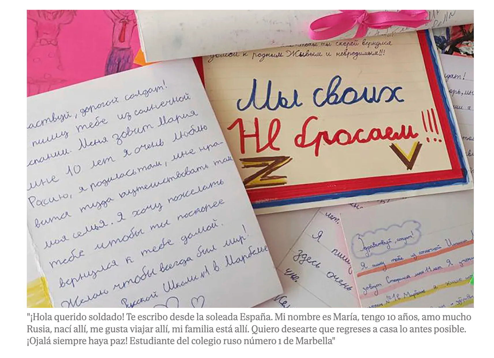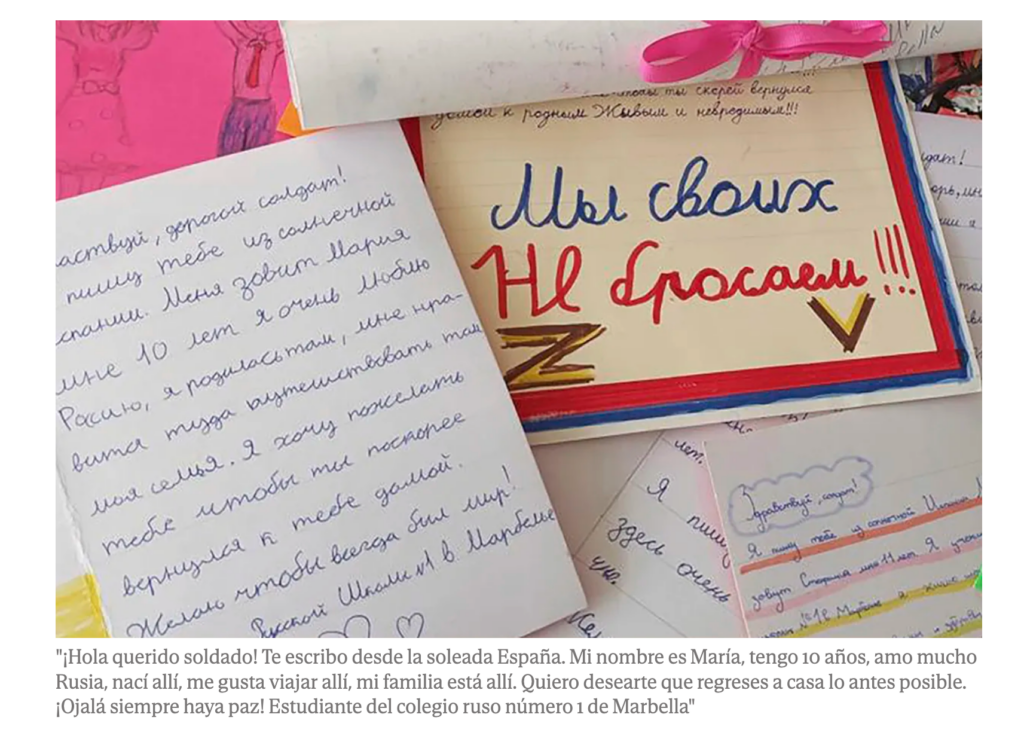 Письма от испанских детей, поддерживающих армию Путина в Украине: «Привет, дорогой солдат! Пишу тебе из солнечной Испании. Мне 10 лет, и я очень люблю Россию». Пророссийские организации в Испании координируют отправку детских писем и носков с вышитыми Z в нашей стране. «Мы придаем большое значение патриотическому воспитанию», — признаются их промоутеры.