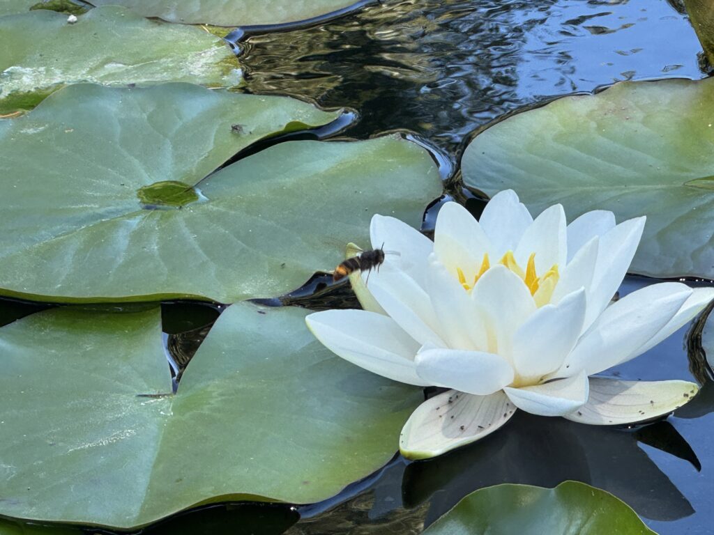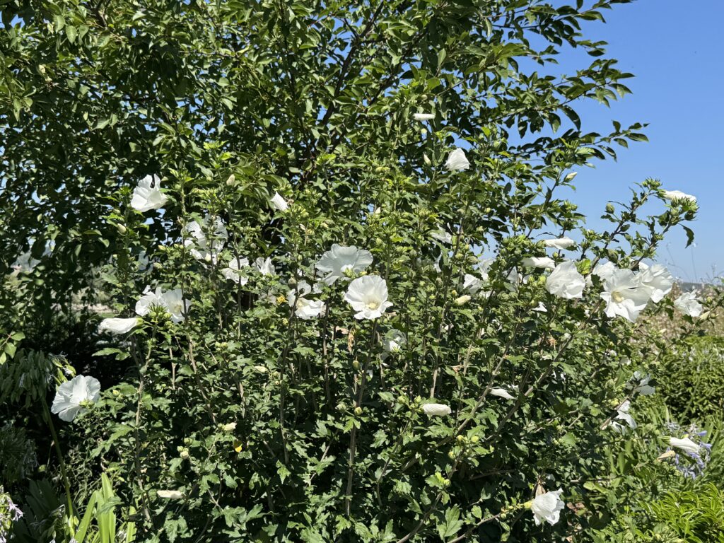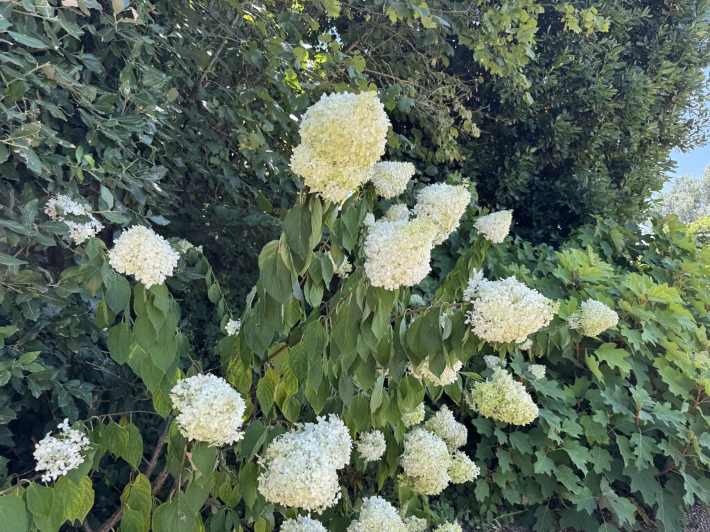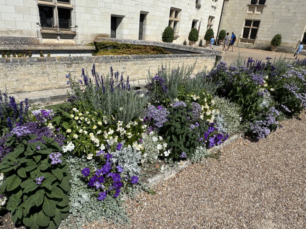 Клумбы замка украшены белыми и фиолетовыми цветами.