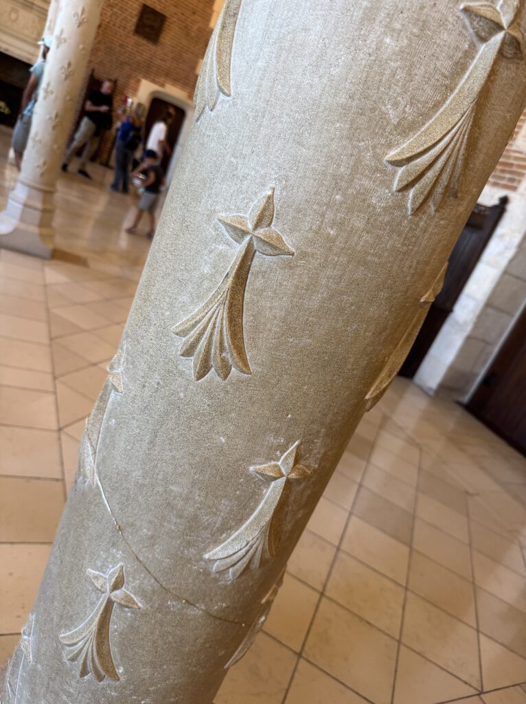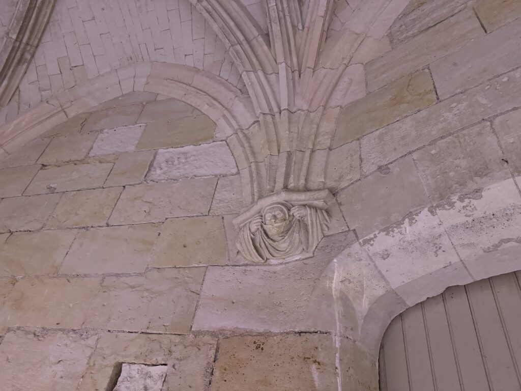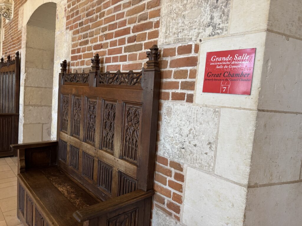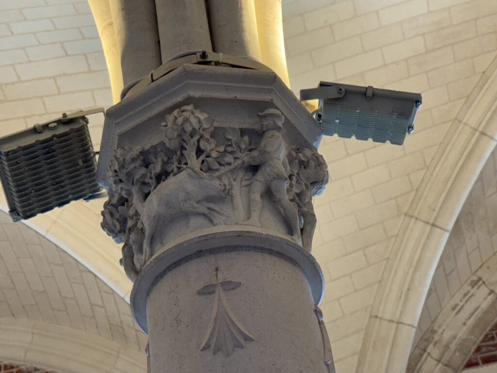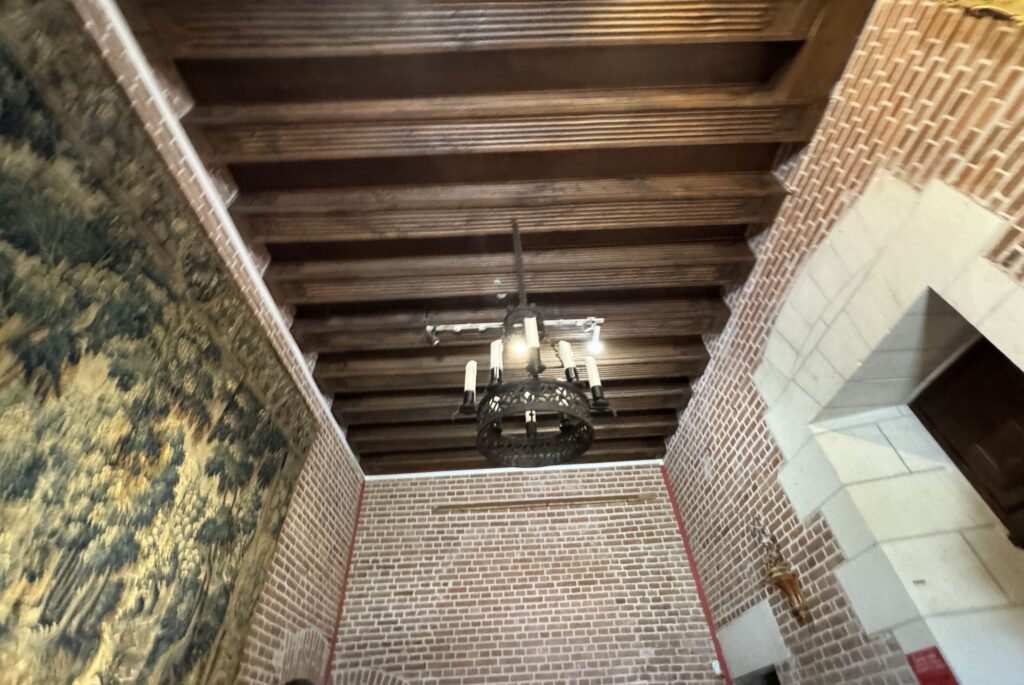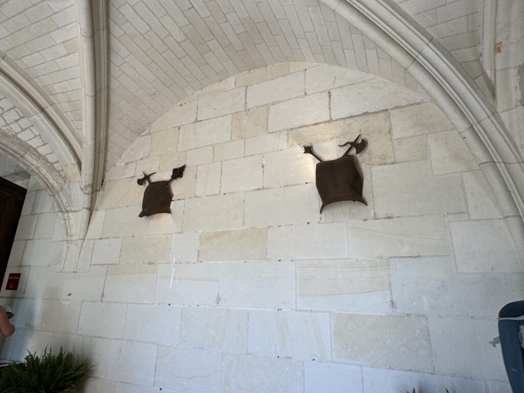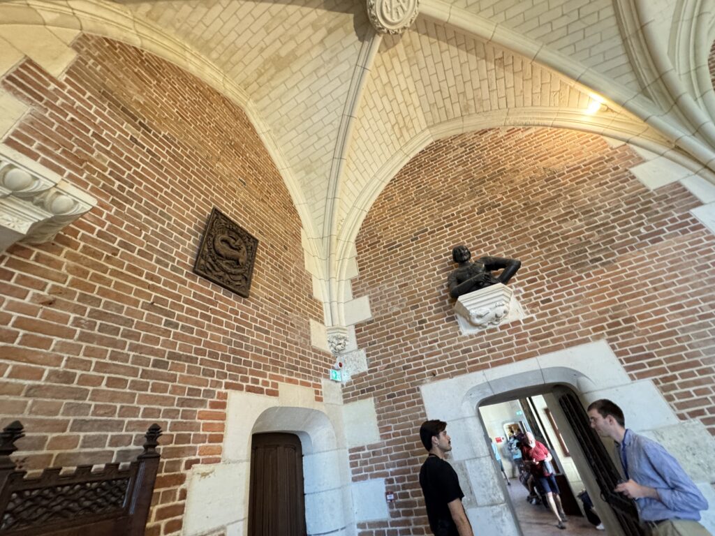 — На потолке: монограммы Карла VIII (вензель с буквой С) и Анны Бретонской (буква А).