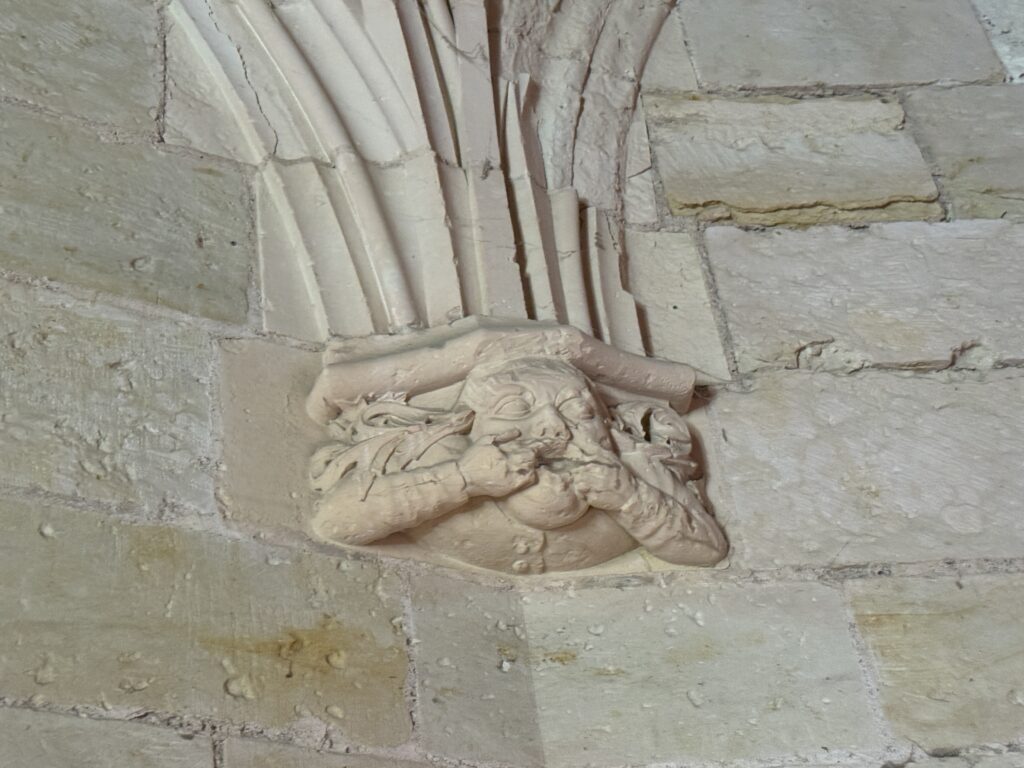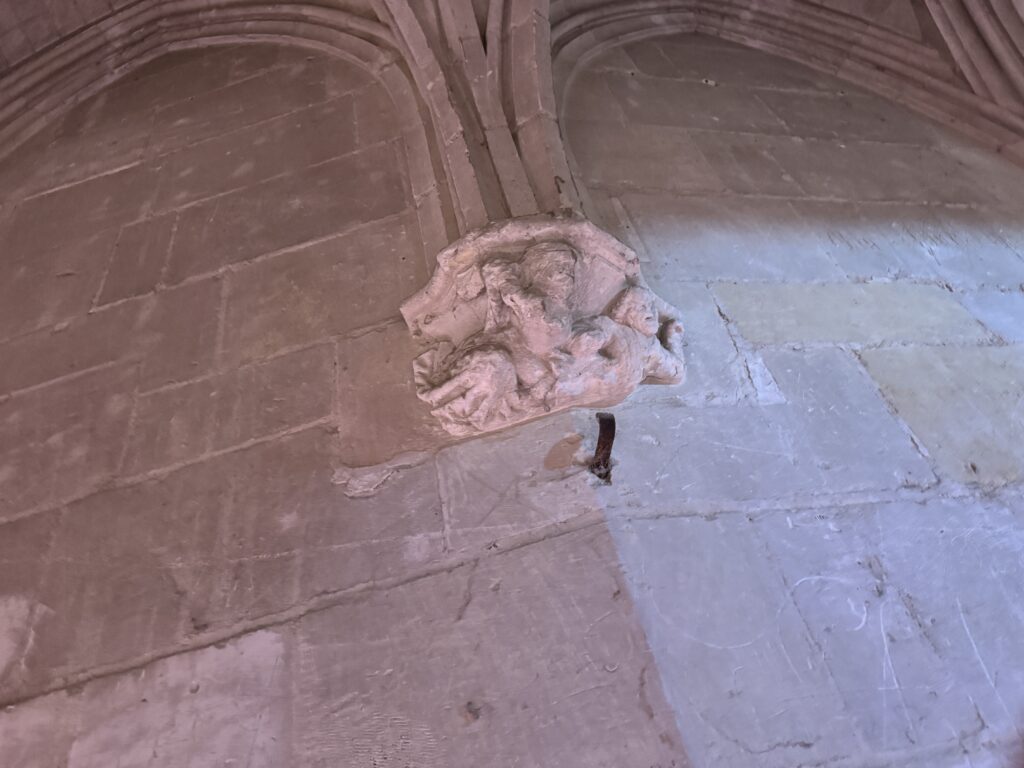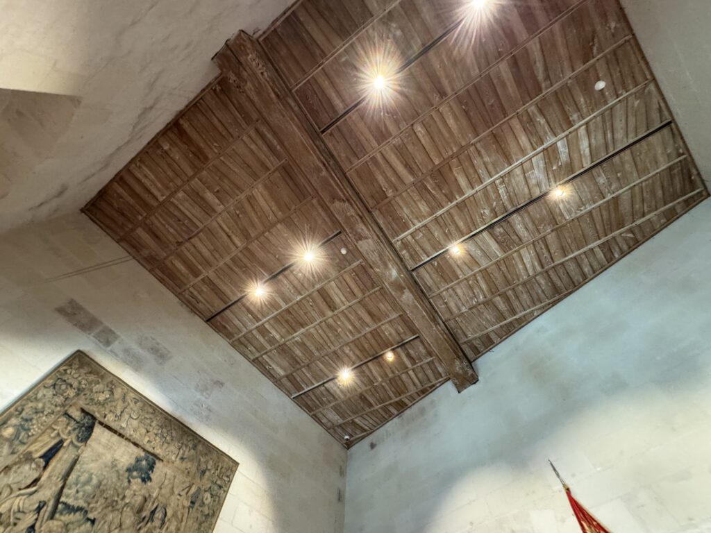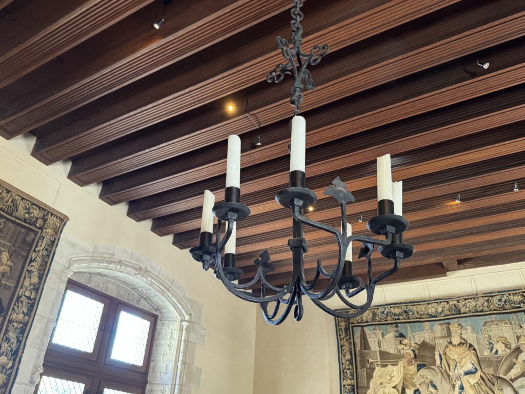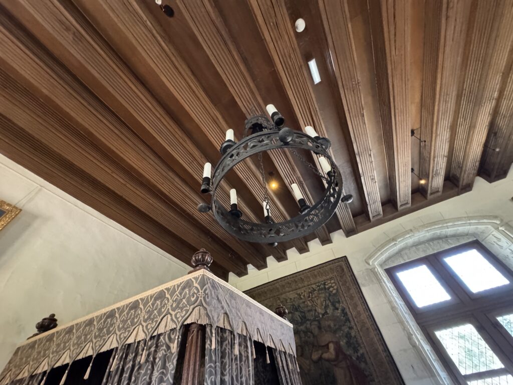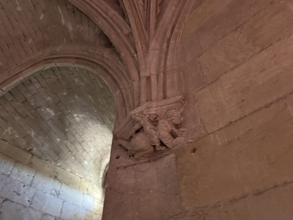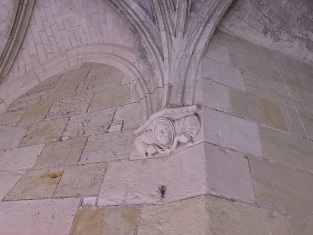 — На потолке: монограммы Карла VIII (вензель с буквой С) и Анны Бретонской (буква А).