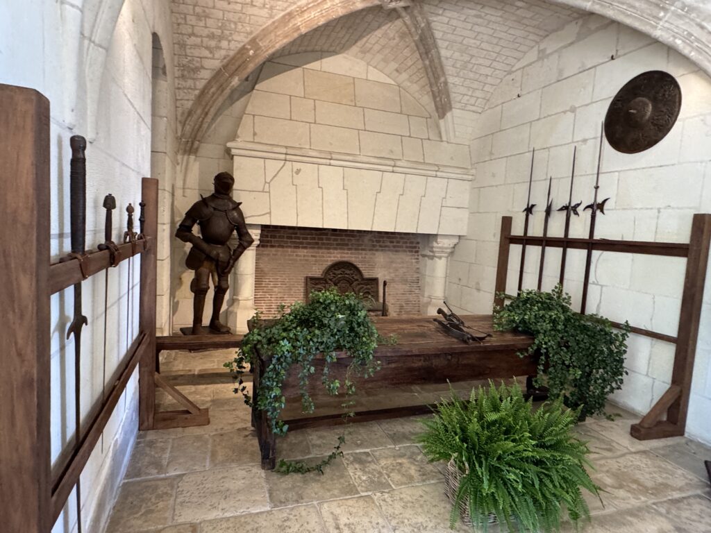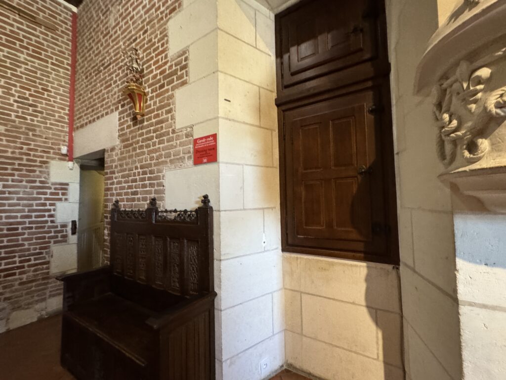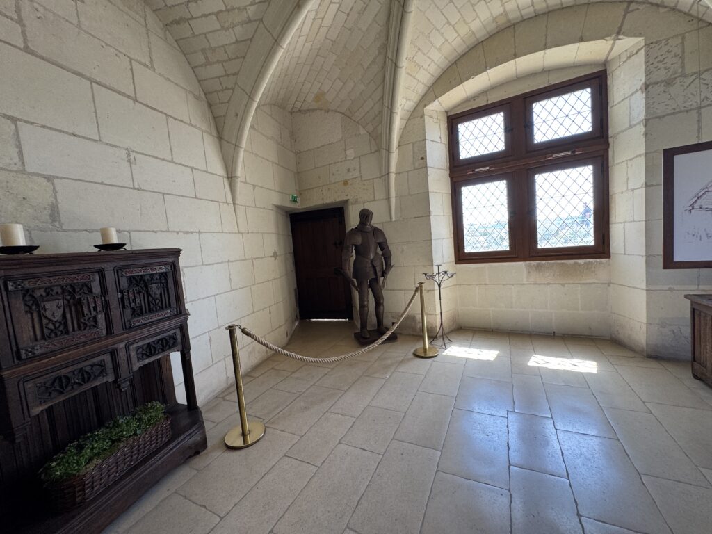 «Галерея караульных (наблюдательный пункт): эта открытая галерея замка Амбуаз давала возможность наблюдать за судоходством на Луаре и за переправой. В непосредственной близости от покоев суверена охрану несли титулованные особы. Из этого помещения контролировался выход к лестнице, ведущей в покои короля. Один из гвардейцев, шевалье д’Артаньян, капитан мушкетеров короля Людовика XIV, останавливался в замке с 4 по 16 декабря 1661 г. по дороге в Париж, куда он препровождал на суд разжалованного министра Николя Фуке»