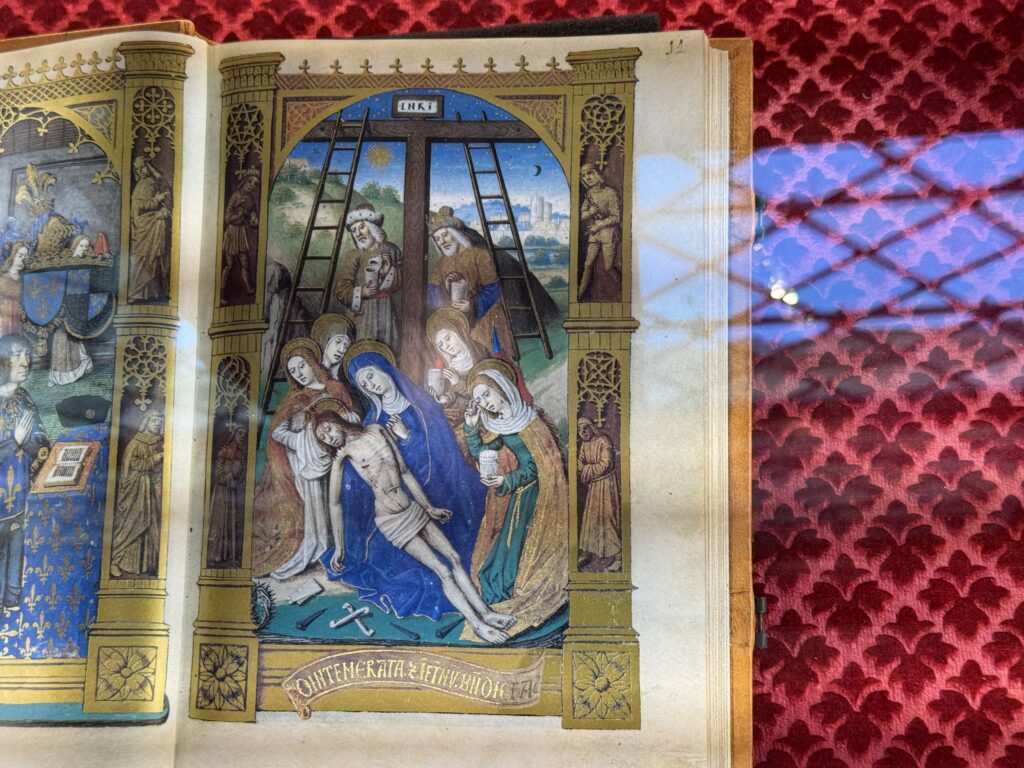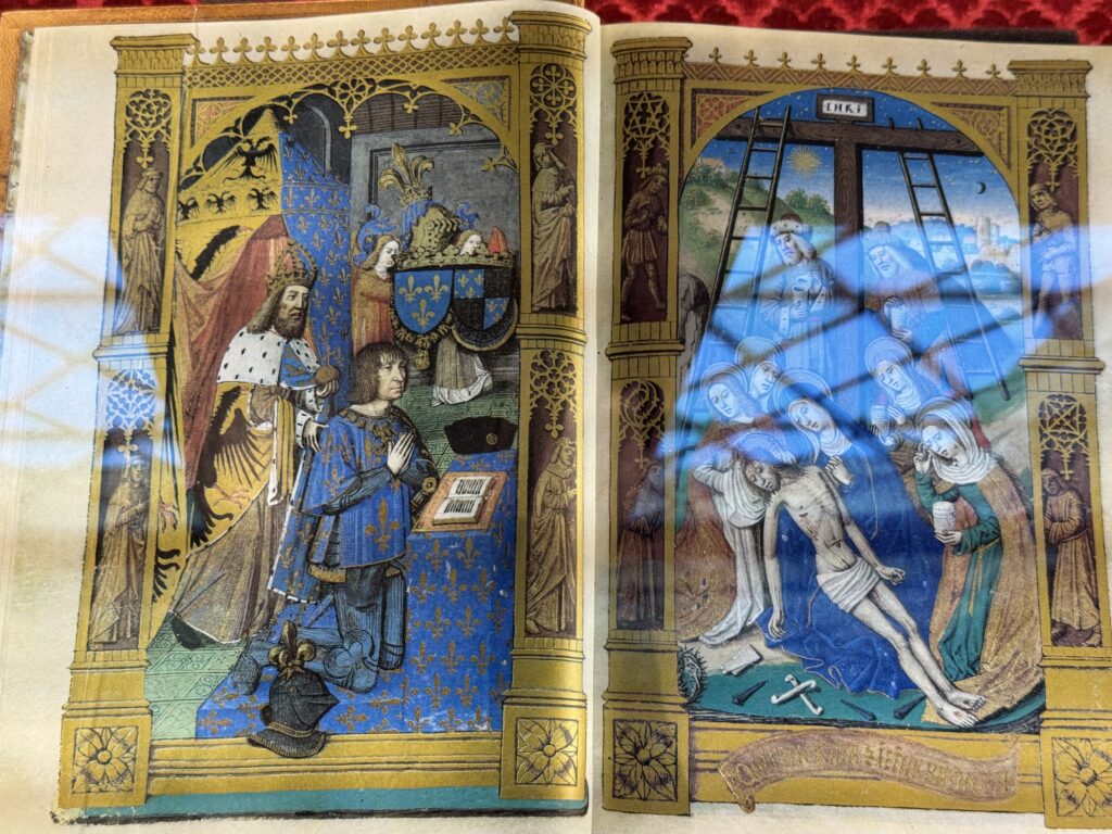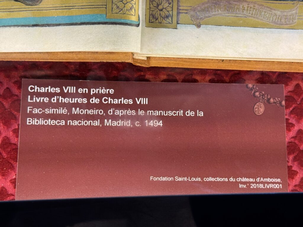 Карл VIII в молитве. Часослов Карла VIII, факсимиле — точная копия — оригинала 1494 из Мадридской национальной библиотеки. Главным и почти единственным миниатюристом Часослова Карла VIII является мастер Жак де Безансон. Исключение составляет лишь голова короля, изображённая на 13 странице, где он изображён с цепью ордена Святого Михаила, и которая впоследствии была заменена на портрет Людовика XII, хотя фигура Карла Великого (Шарлеманя) и текст книги, несомненно, относятся к Карлу VIII.